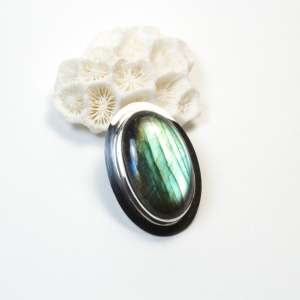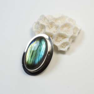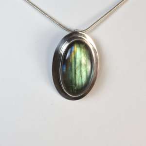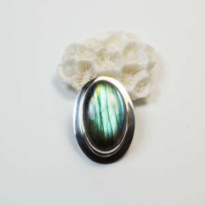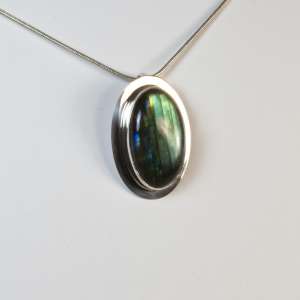 Sterling Silver pendant with Labradorite. This labradorite, we could talk about spectrolite in this case, as it is a labradorite that reflects the colours of the spectrum. It has a drop shape and measures 3.1 by 2.9 cm. The total measurement with the ring is 4.6 cm. Handmade.