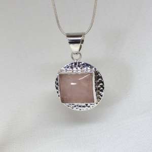 Sterling silver pendant with rose quartz. It is a round pendant with a diameter of 2.2 cm and a hammered texture. The rose quartz is rectangular in shape, measuring 1.8 cm by 1.6 cm on each side. The total length of the pendant is 4.2 cm. It is handcrafted.