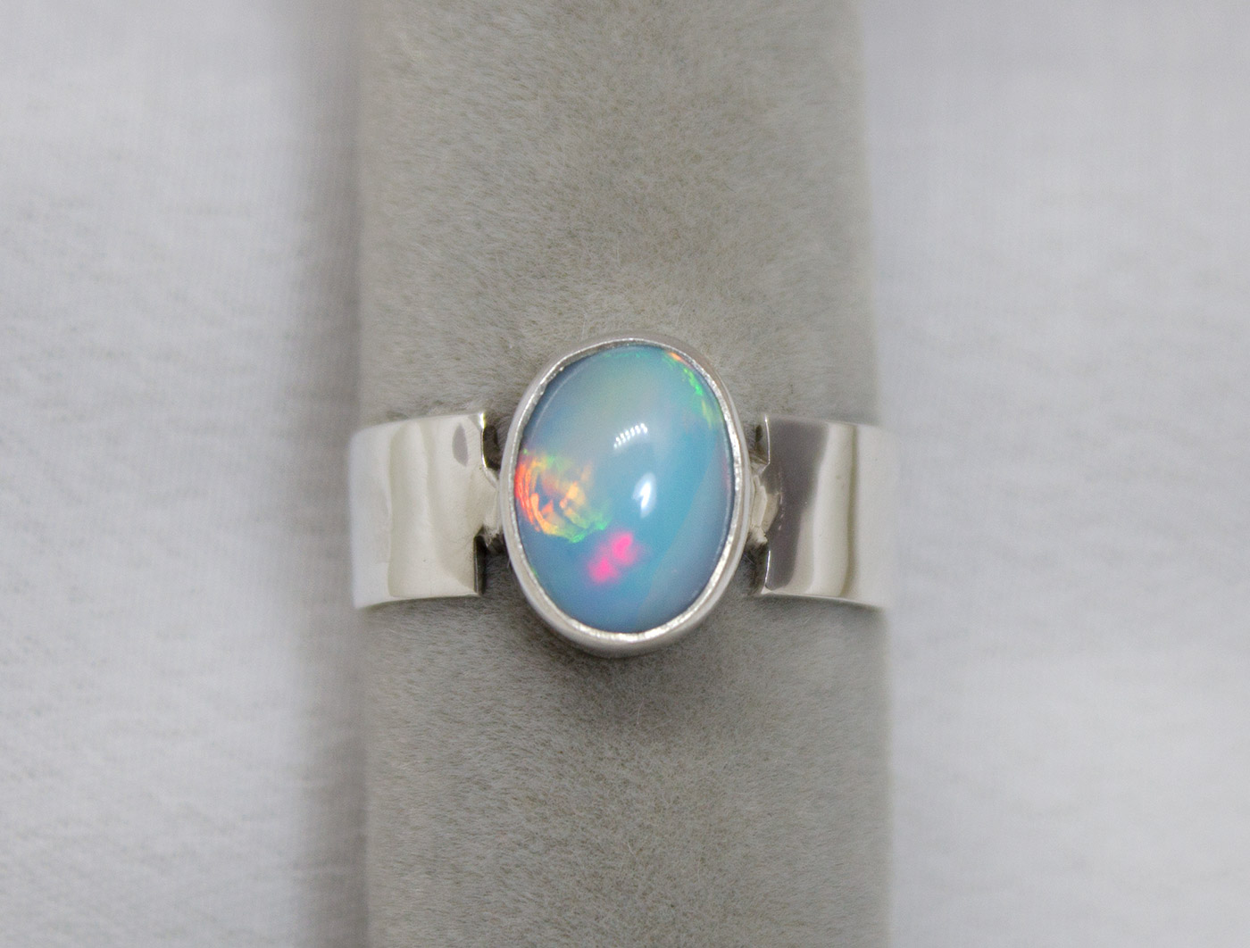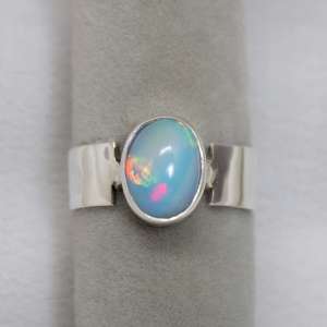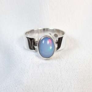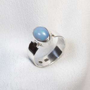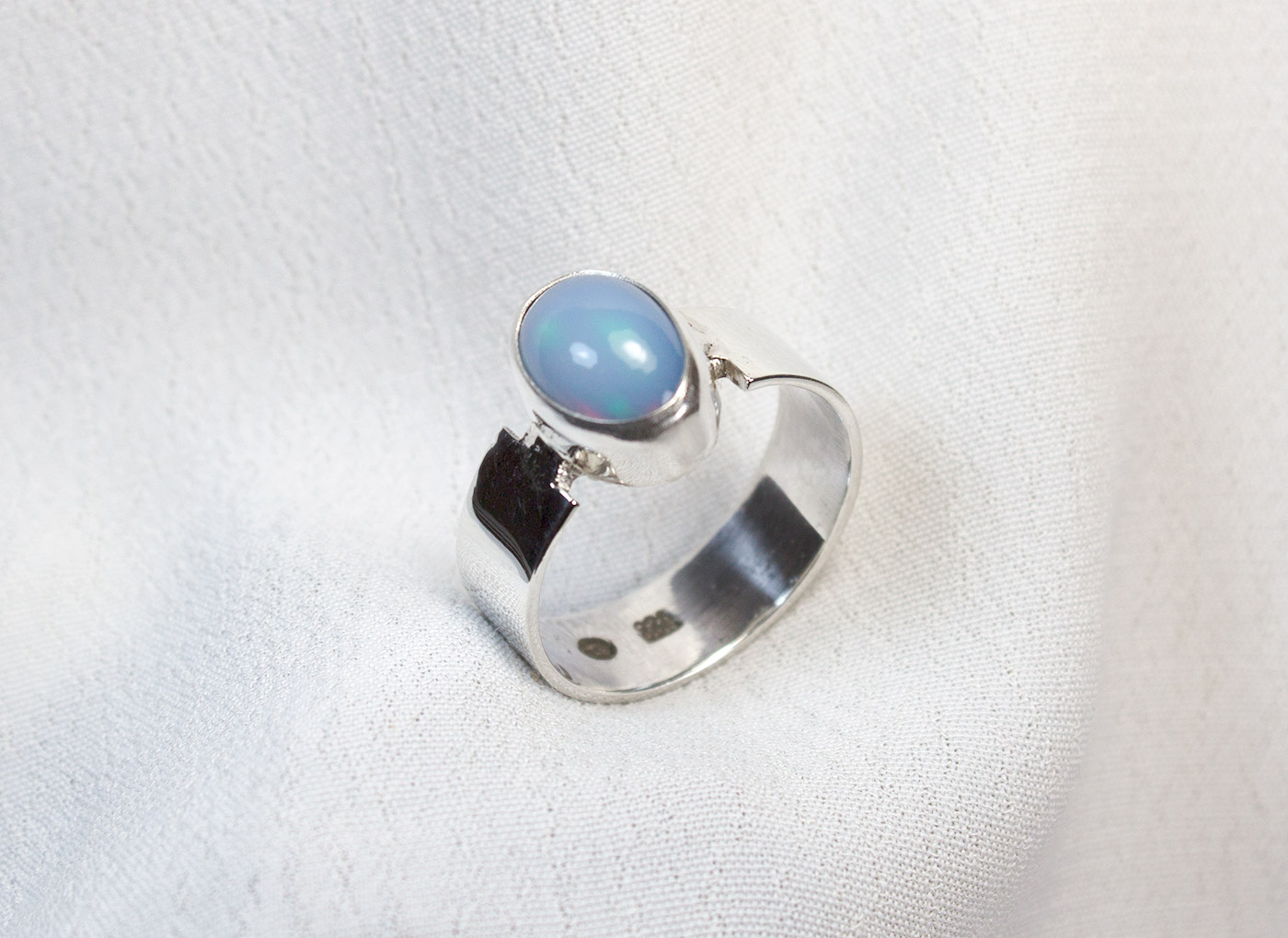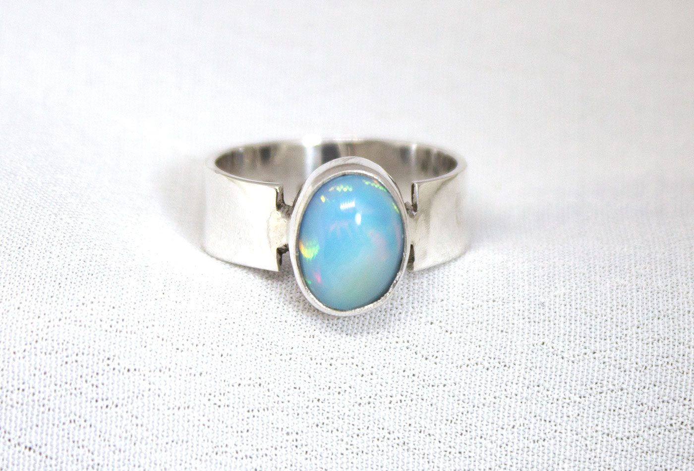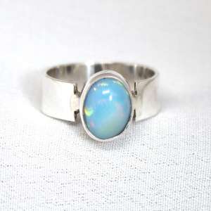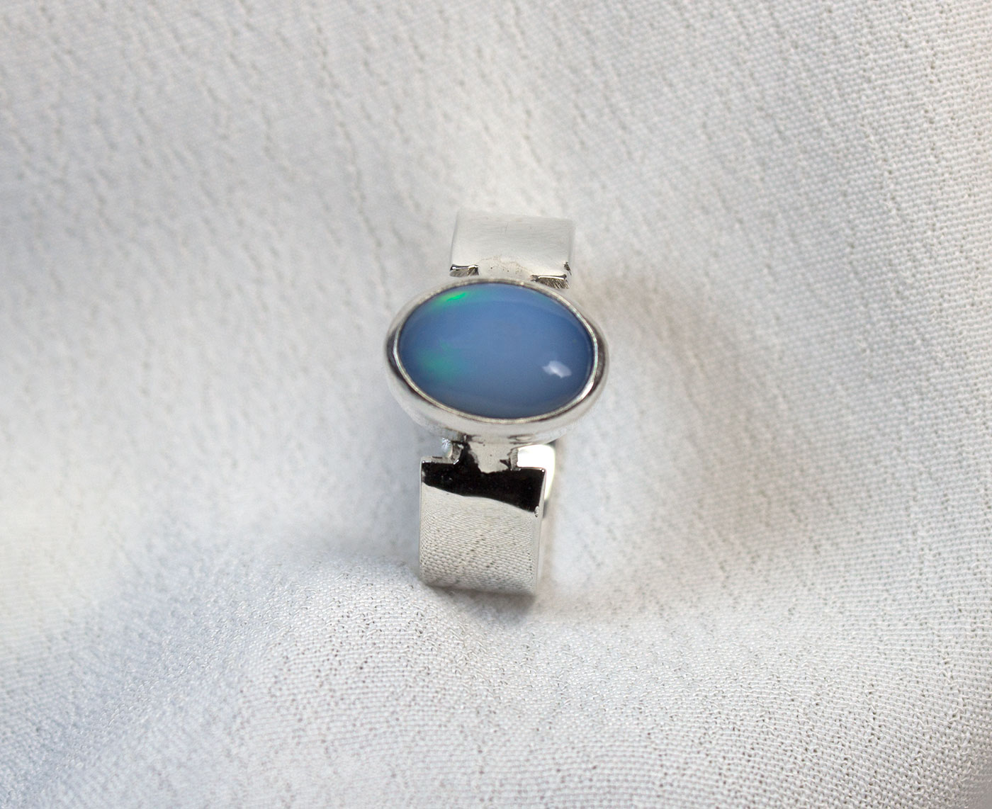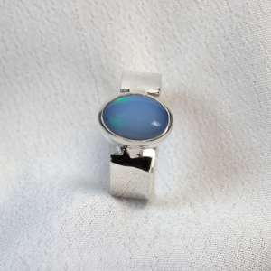 Anillo abierto con plata de ley 925 y opalo azul. Original anillo con aro liso de 7mm y con sus bordes al lado de la piedra abiertos. El ópalo proviene de Etiopía, donde se encuentra uno de los yacimientos más importantes. El ópalo es ovalado y con fondo color azul claro con opalescencias doradas, rojas y verdes al incidir la luz. Mide 1,2 cm por 0,8. Está elaborado artesanalmente. Viene en talla 9.