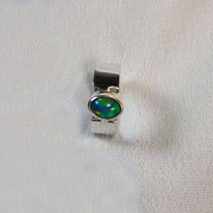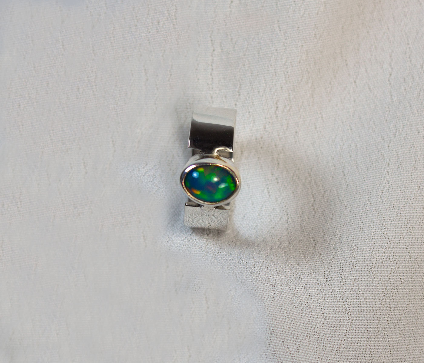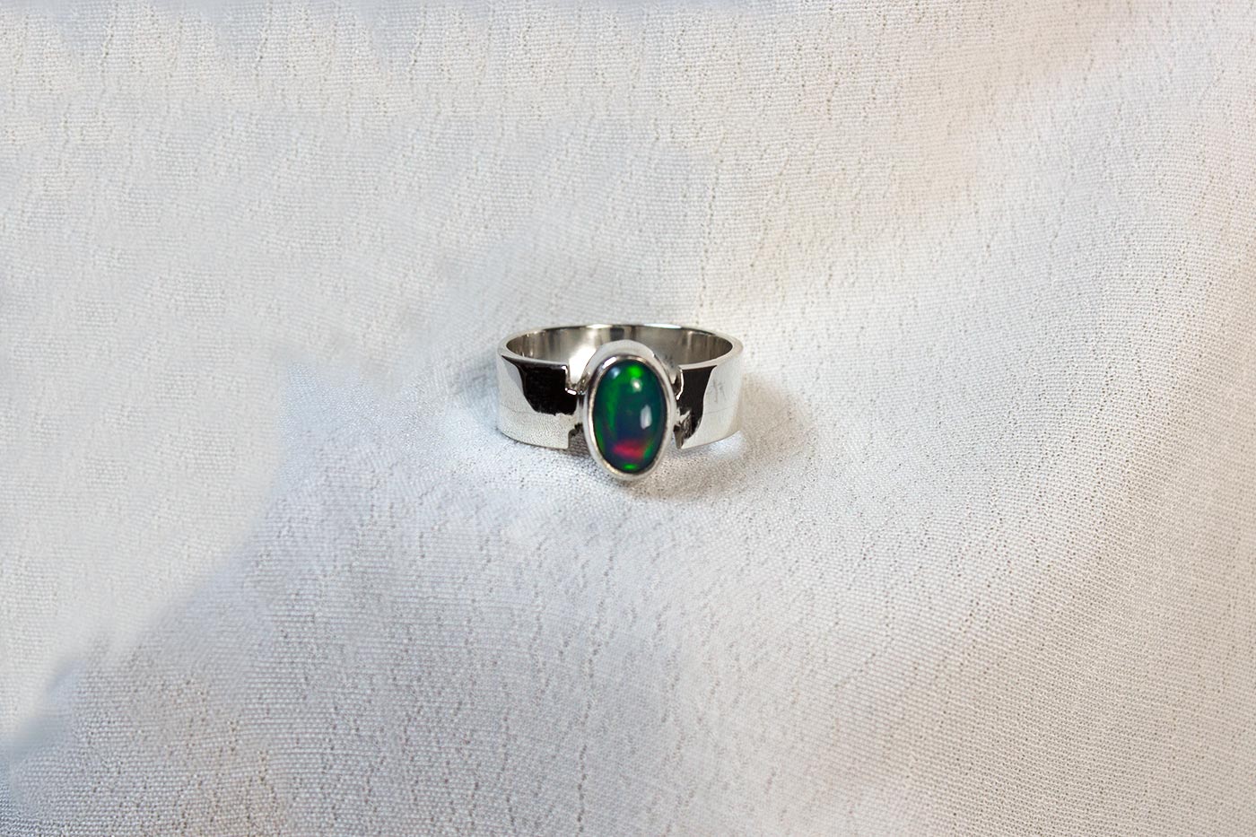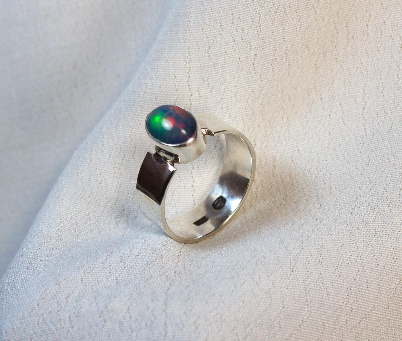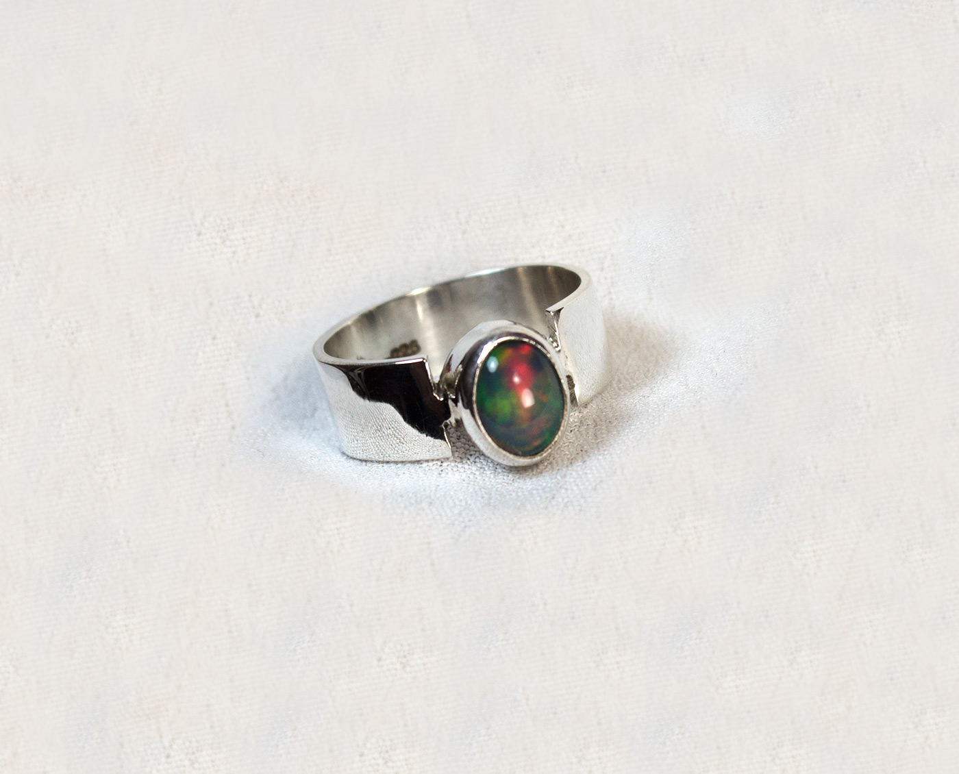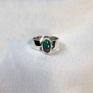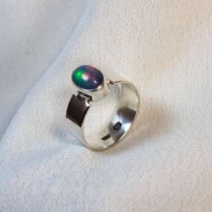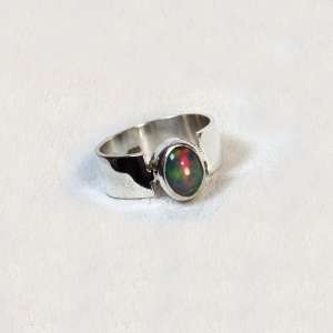 Anillo abierto con plata de ley 925 y opalo negro. Original anillo con aro liso de 7mm y con sus bordesen el lado superior al lado de la piedra abiertos. El ópalo proviene de Etiopía, donde se encuentra uno de los yacimientos más importantes. La forma es ovalada y con un fondo oscuro y fuertes opalescencias doradas, rojas, verdes, amarillas y azules al incidir la luz. Mide 1 cm por 0,7. Está elaborado artesanalmente. Viene en talla 6.5, 7 y 7.5. Agotado talla 6.5