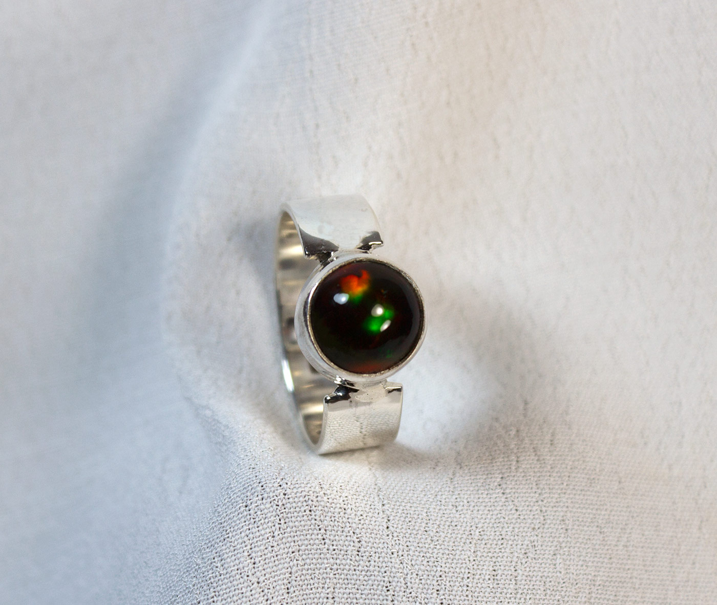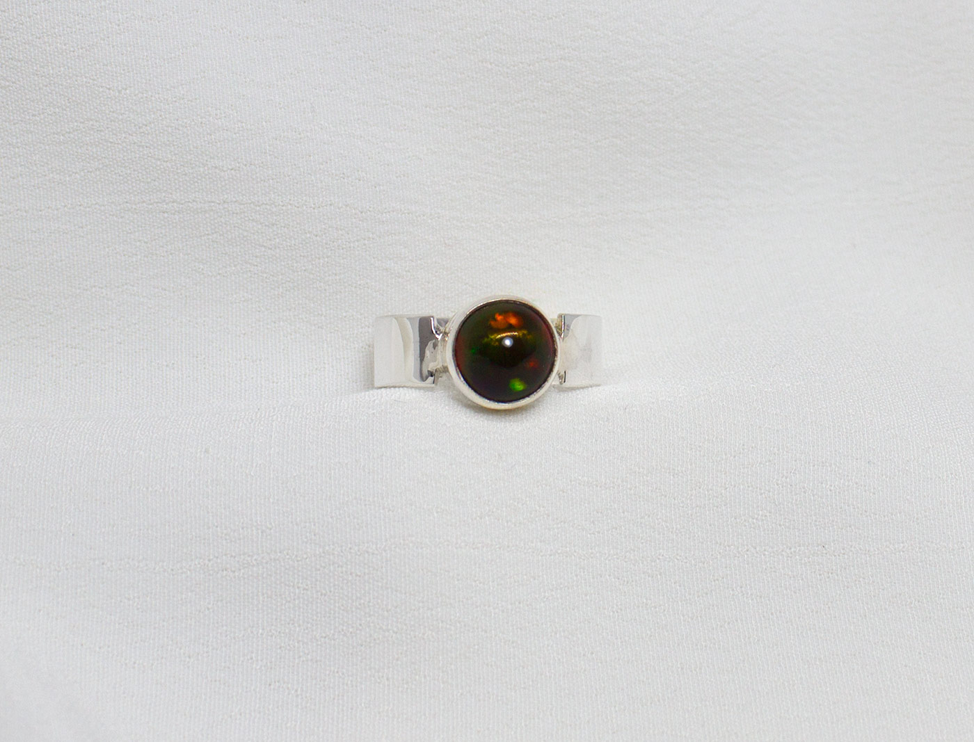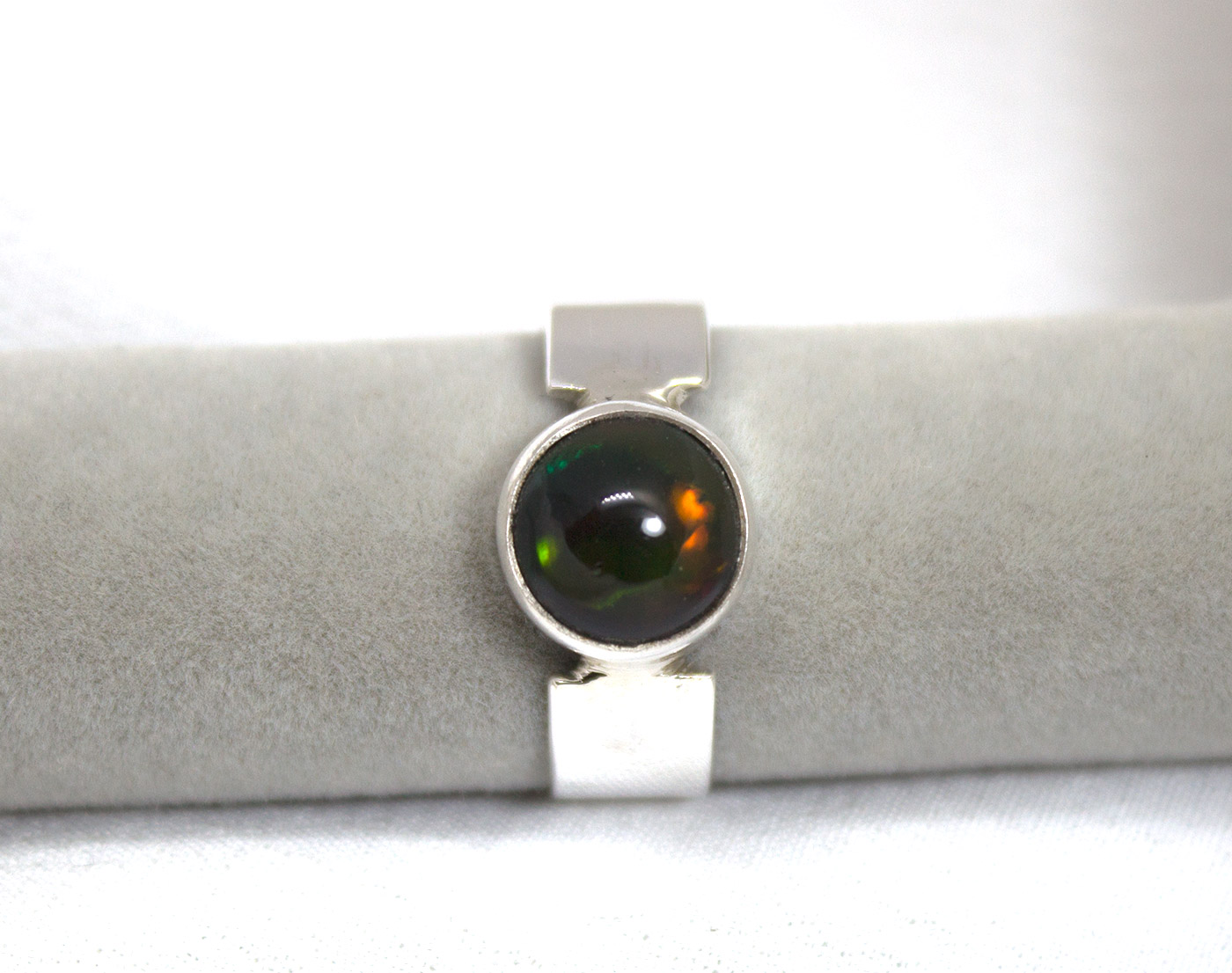 Anillo abierto de plata de ley 925 con opalo negro. Original anillo con aro liso de 7mm y con sus bordesen el lado superior al lado de la piedra abiertos. El ópalo proviene de Etiopía, donde se encuentra uno de los yacimientos más importantes. La forma es redonda con un fondo negro donde bailan al movimiento y la incisión de la luz fuertes opalescencias doradas, rojas, naranjas, verdes y amarillas. Mide 0,9 cm de diámetro. Está elaborado artesanalmente. Viene en talla 8.
