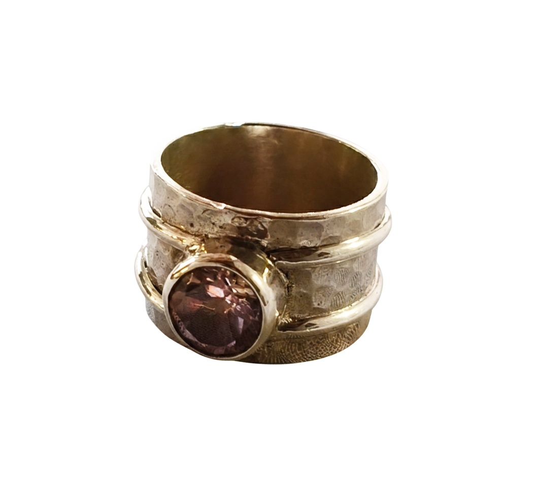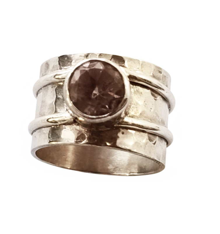 Anillo ancho con espinela violeta clara y plata de ley 925. Tiene un aro de 15 mm texturizado con un martelado grueso y rodeado por dos finos hilos lisos de plata. Lleva engarzada una espinela de color claro con tonalidades violetas y rosas. La piedra está facetada. Tiene forma redonda . El anillo está fabricado artesanalmente. Al ser un aro bastante ancho sugerimos elegir 1/2 talla más de la usada normalmente. Talla 7,5.