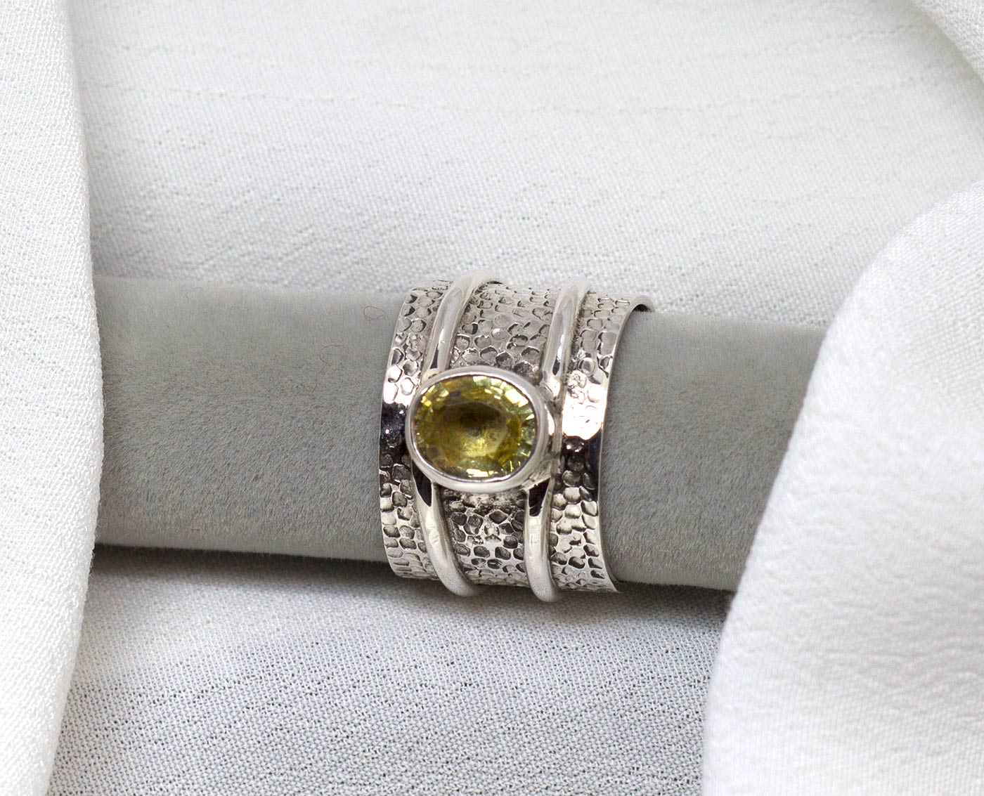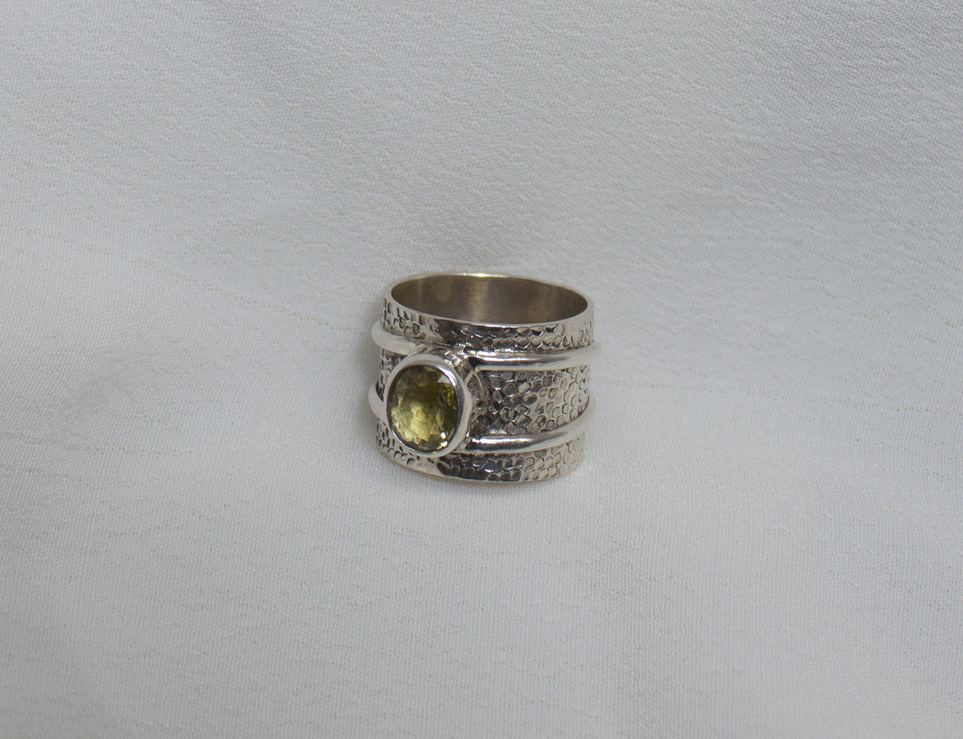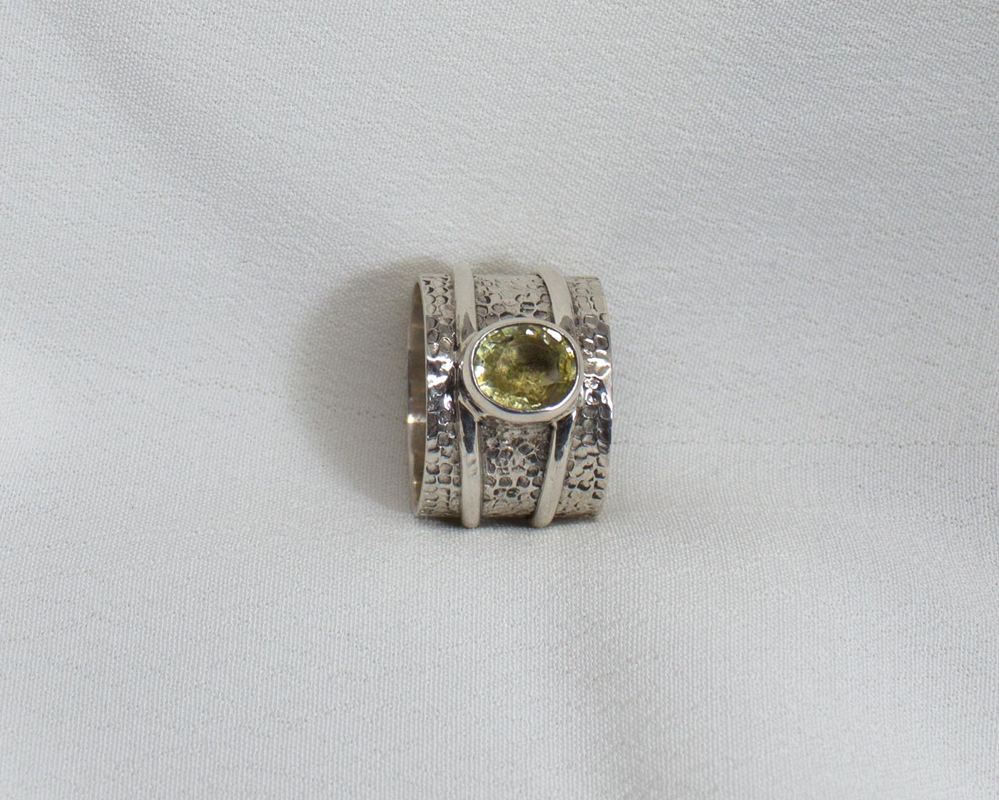 Anillo ancho con una espinela verde y plata de ley 925. Tiene un aro de 15 mm texturado con un martelado fino y rodeado por dos finos hilos lisos de plata. Lleva engarzada una espinela facetada de color verde oliva claro. Tiene forma oval y un tamaño de 0.8 cm de largo por 0.7. El anillo está fabricado artesanalmente. Al ser un aro bastante ancho sugerimos elegir 1/2 talla más de la usada normalmente. Talla 8,5.