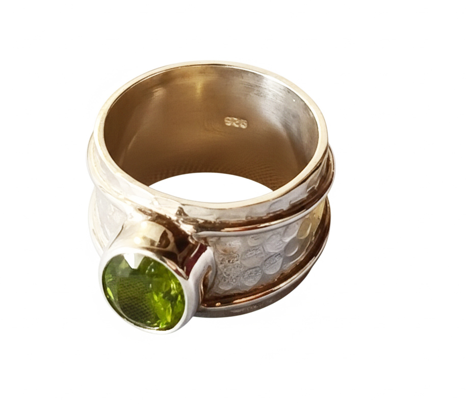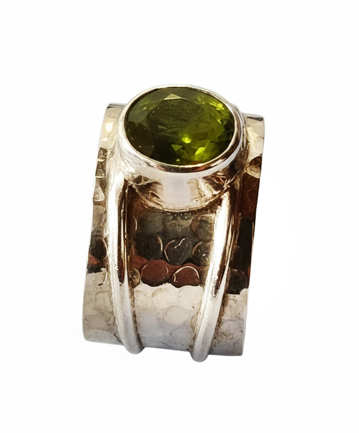 Anillo ancho con una espinela verde y plata de ley 925. Tiene un aro de 15 mm texturizado con un martelado grueso y rodeado por dos finos hilos lisos de plata. Lleva engarzada una espinela facetada de color verde oliva claro. Tiene forma oval y un tamaño de 0.8 cm de largo por 0.7. El anillo está fabricado artesanalmente. Al ser un aro bastante ancho sugerimos elegir 1/2 talla más de la usada normalmente. Talla 9.