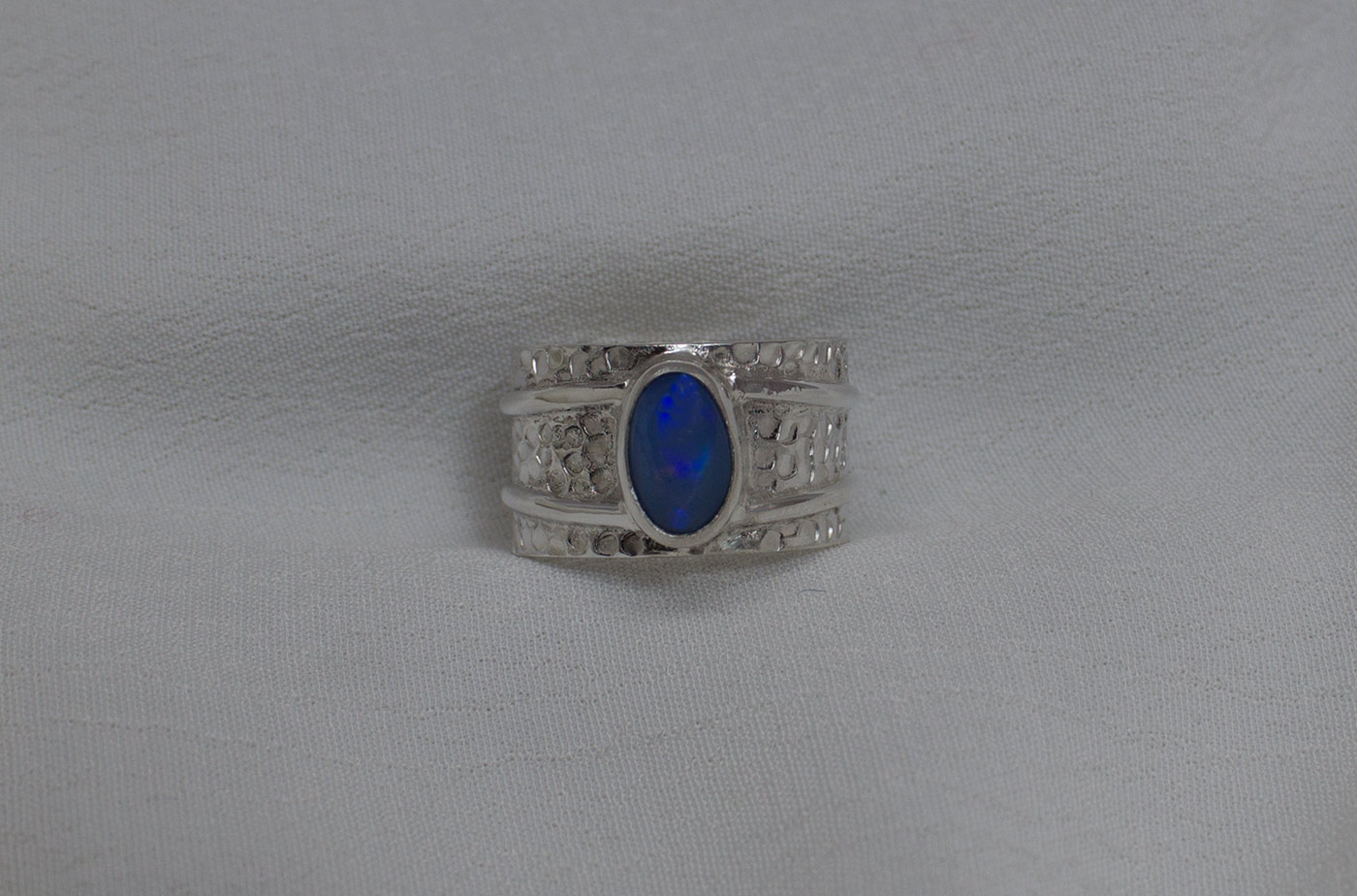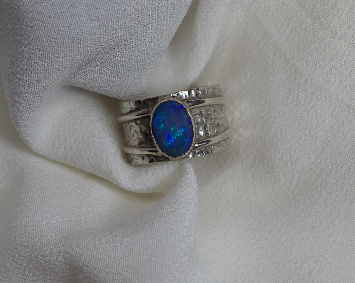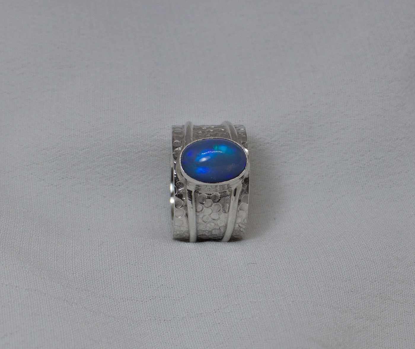 Anillo ancho con opalo azul y plata de ley 925. El aro está texturizado con un martelado fino y rodeado por dos finos aros lisos de 1mm cada uno. El anillo tiene 13mm de anchura. El ópalo engarzado es de color azul con opalescencias azules y verdes. Mide 1,1 cm de largo por 0,9. Proviene de Etiopía. Al ser un anillo con aro bastante ancho, sugerimos elegir 1/2 talla más de la usada normalmente. Talla 8.5
