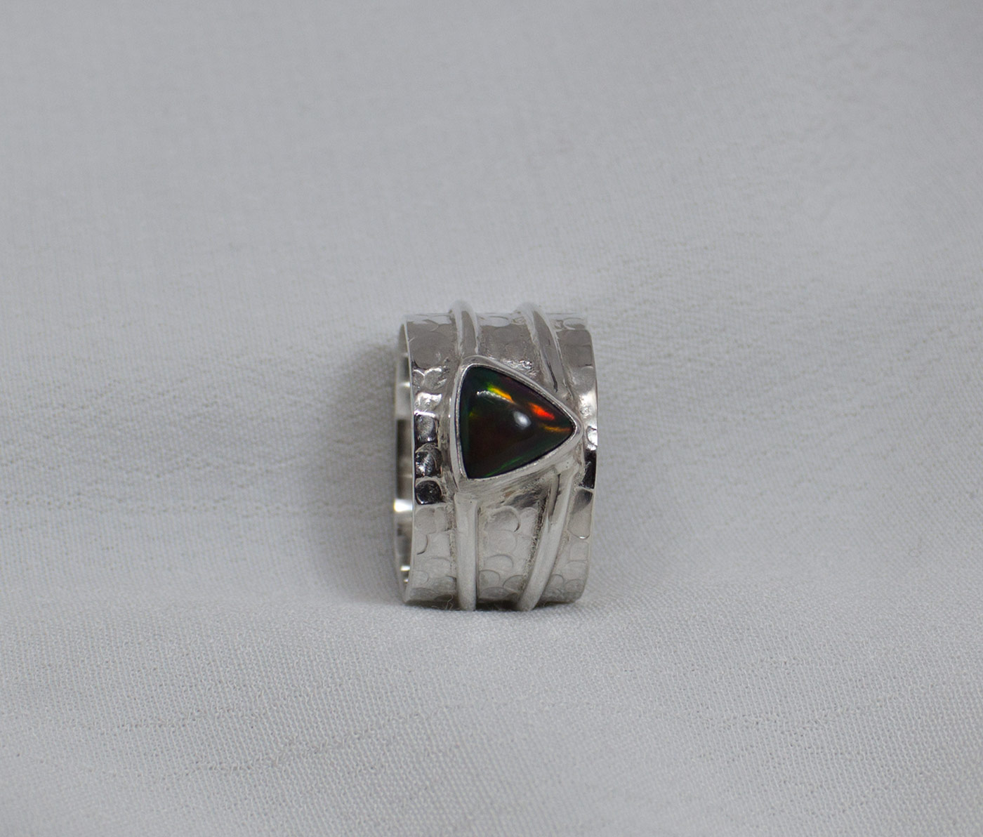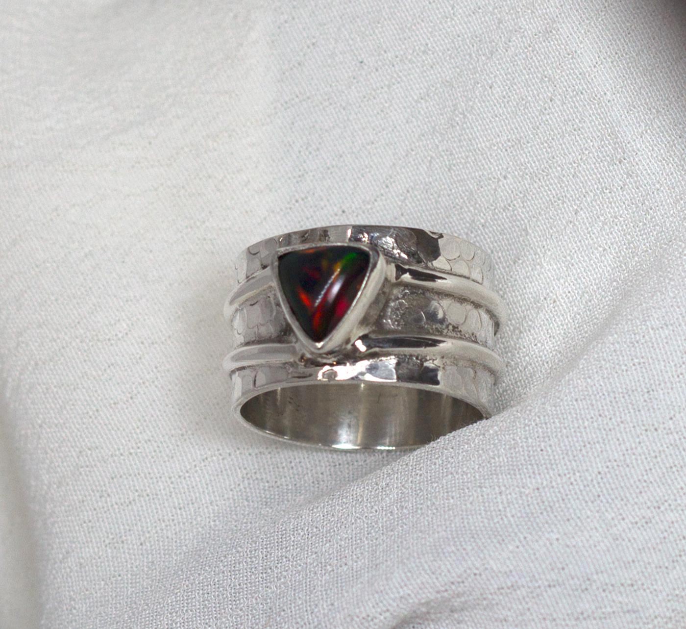 Anillo ancho con opalo negro y plata de ley 925. Su aro es ancho, de 13 mm. Viene texturado con un martelado grueso y el aro va rodeado por dos finos hilos lisos de plata. El ópalo tiene una bella opalescencia con reflejos rojos y verdes. Es triangular con 0,8 cm de lado. Es originario de Etiopía. El anillo está elaborado artesanalmente. Al ser un aro bastante ancho sugerimos elegir 1/2 talla más de la usada normalmente. Talla 8.5.