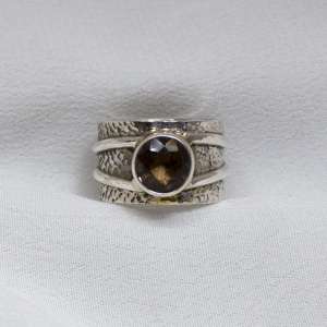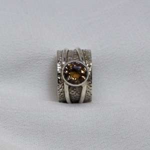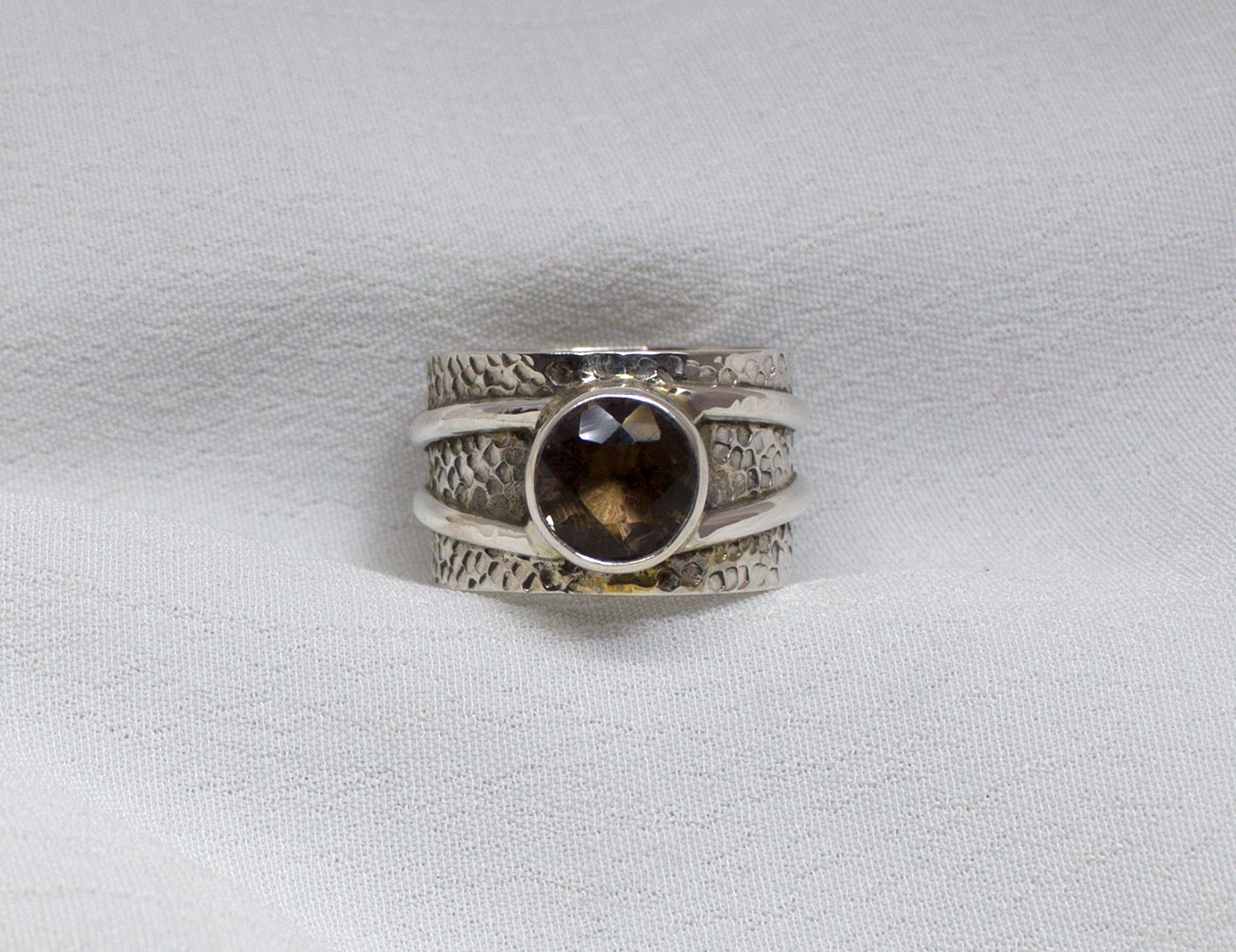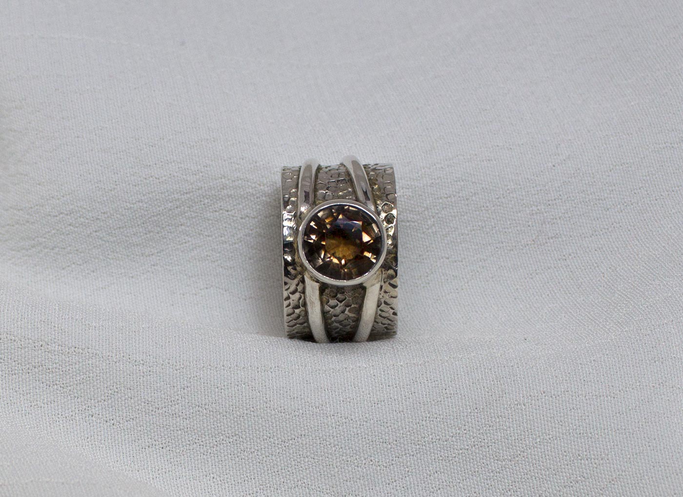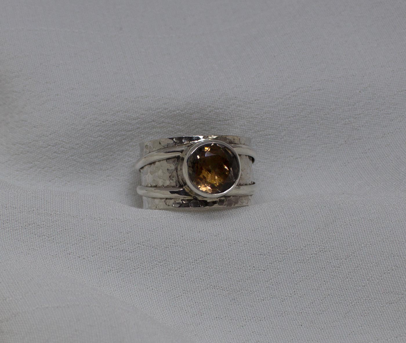 Anillo ancho de plata de ley 925 y espinela dorada. El aro está texturizado con un martelado fino y es de 13 mm de anchura. Va rodeado por dos finos hilos lisos de plata. La espinela es redonda de color marrón dorado y está facetada. Mide 0,7 cm de diámetro. Es de origen birmano. Está elaborado artesanalmente. Al ser un anillo con aro bastante ancho, sugerimos elegir 1/2 talla más de la usada normalmente. Talla 8.5.