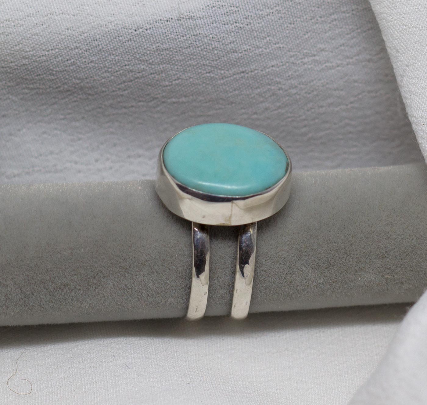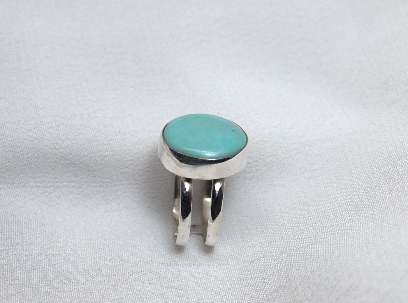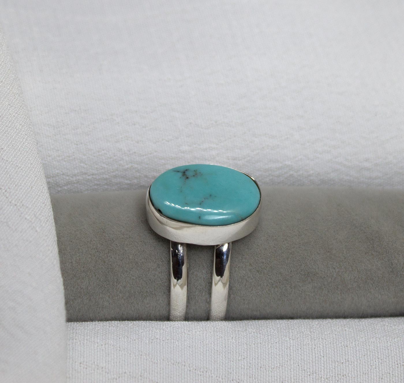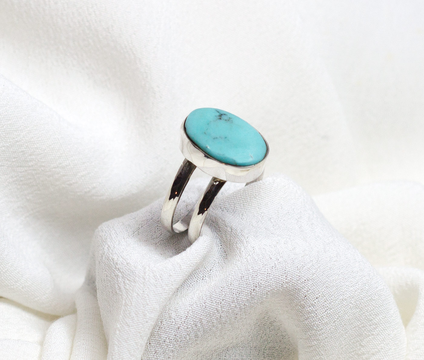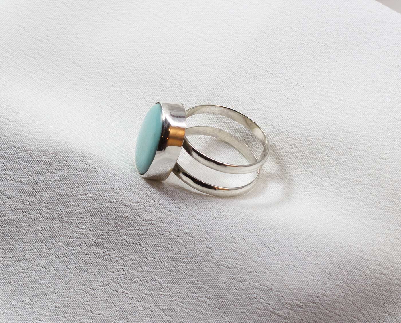 Anillo con doble aro paralelo en plata de ley 925 y con una bella turquesa ovalada de color azul celeste. La piedra mide 1,7 de largo por 1,7 de anchura. Tallas 8.5 y 9