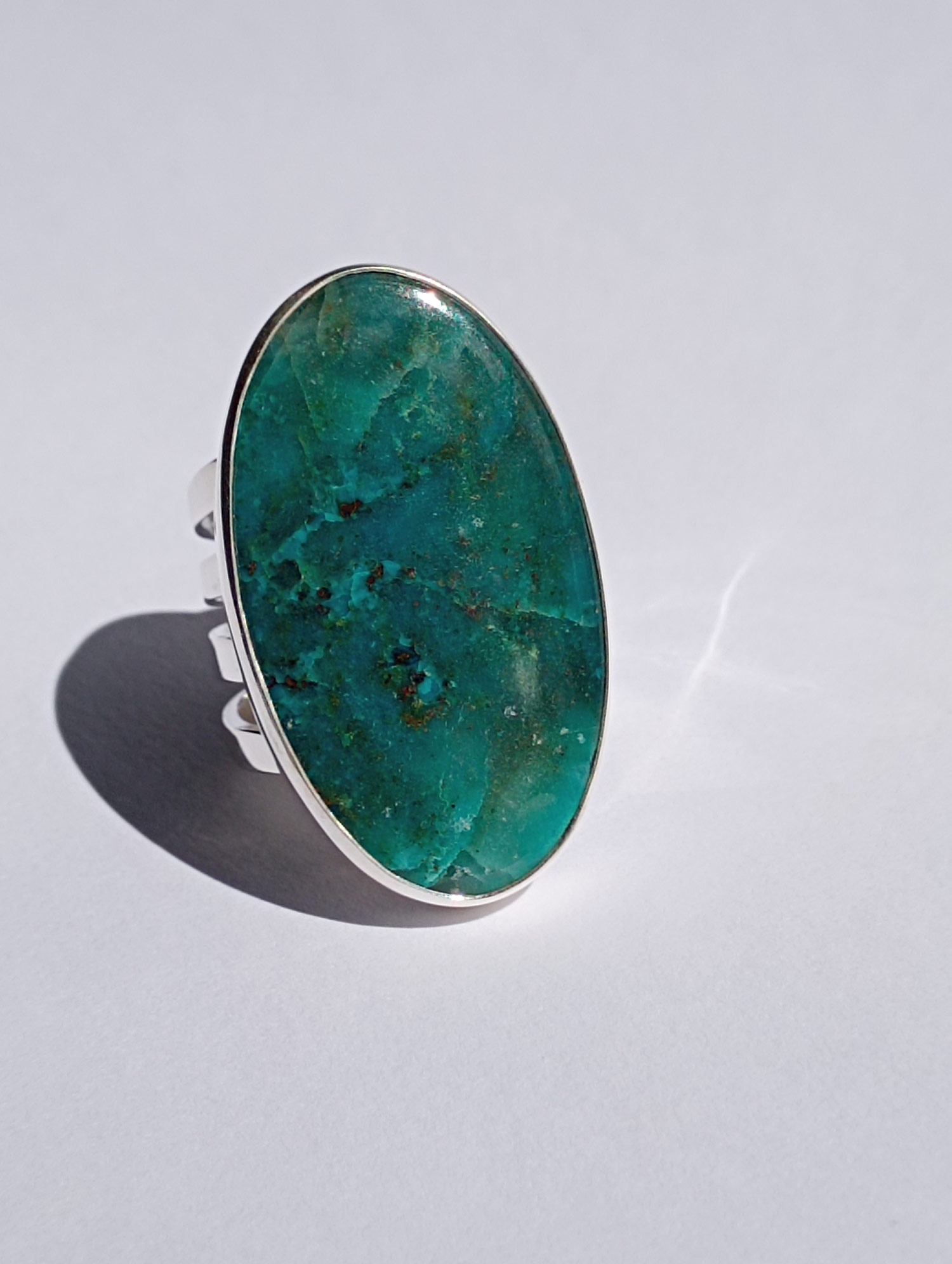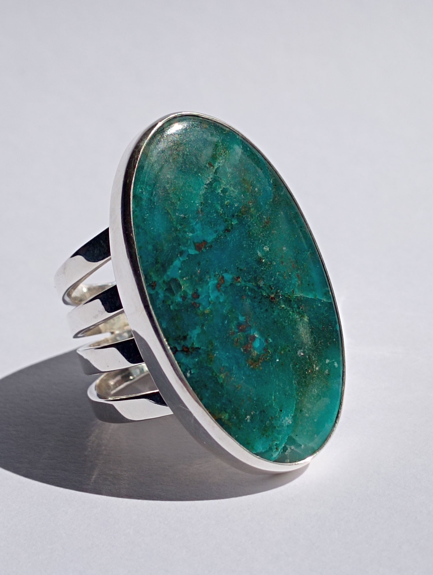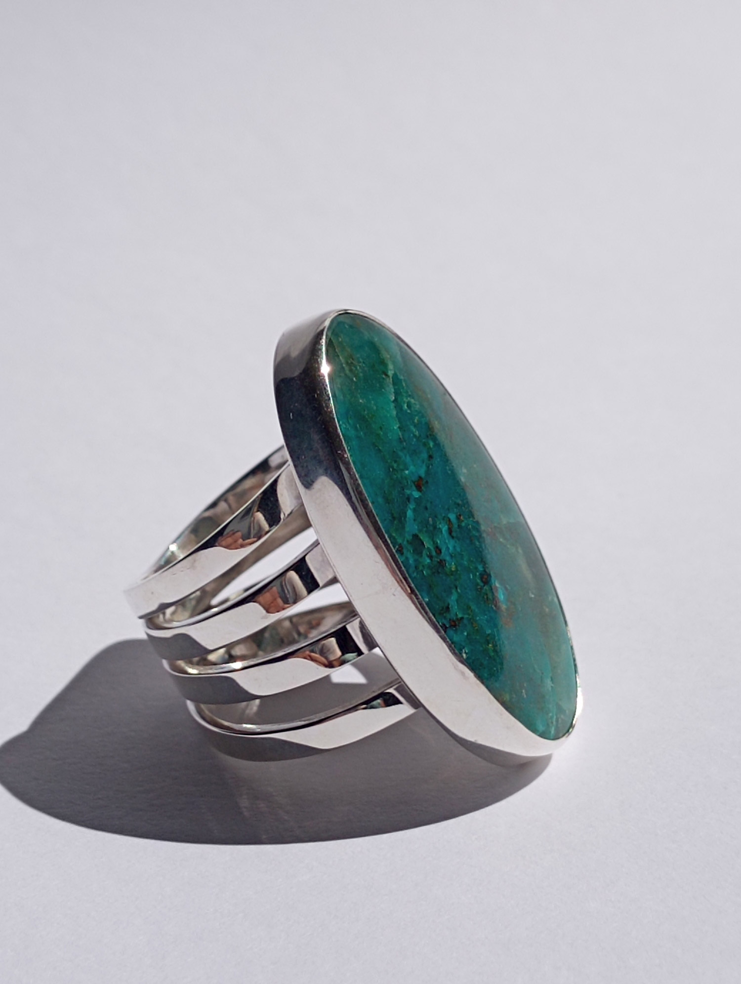 Anillo con 4 aros y crisocola en plata 925. Elaborado con cuatro aros de 2,35 mm cada uno. La crisocola tiene tonos azul oscuro y verde mar. La piedra mide 3,6 cm de largo por 2 de ancho. Talla 9. Está fabricado artesanalmente.
