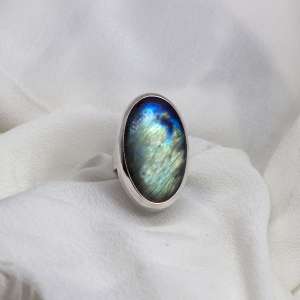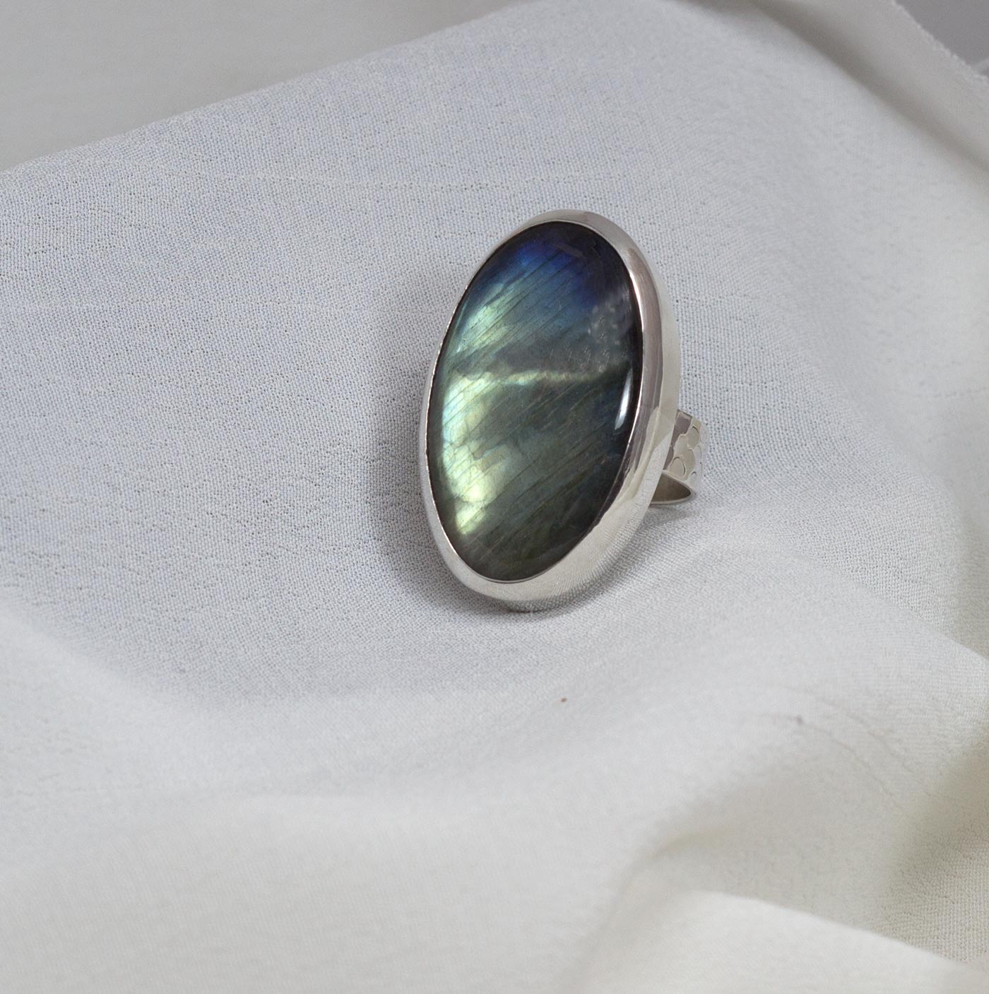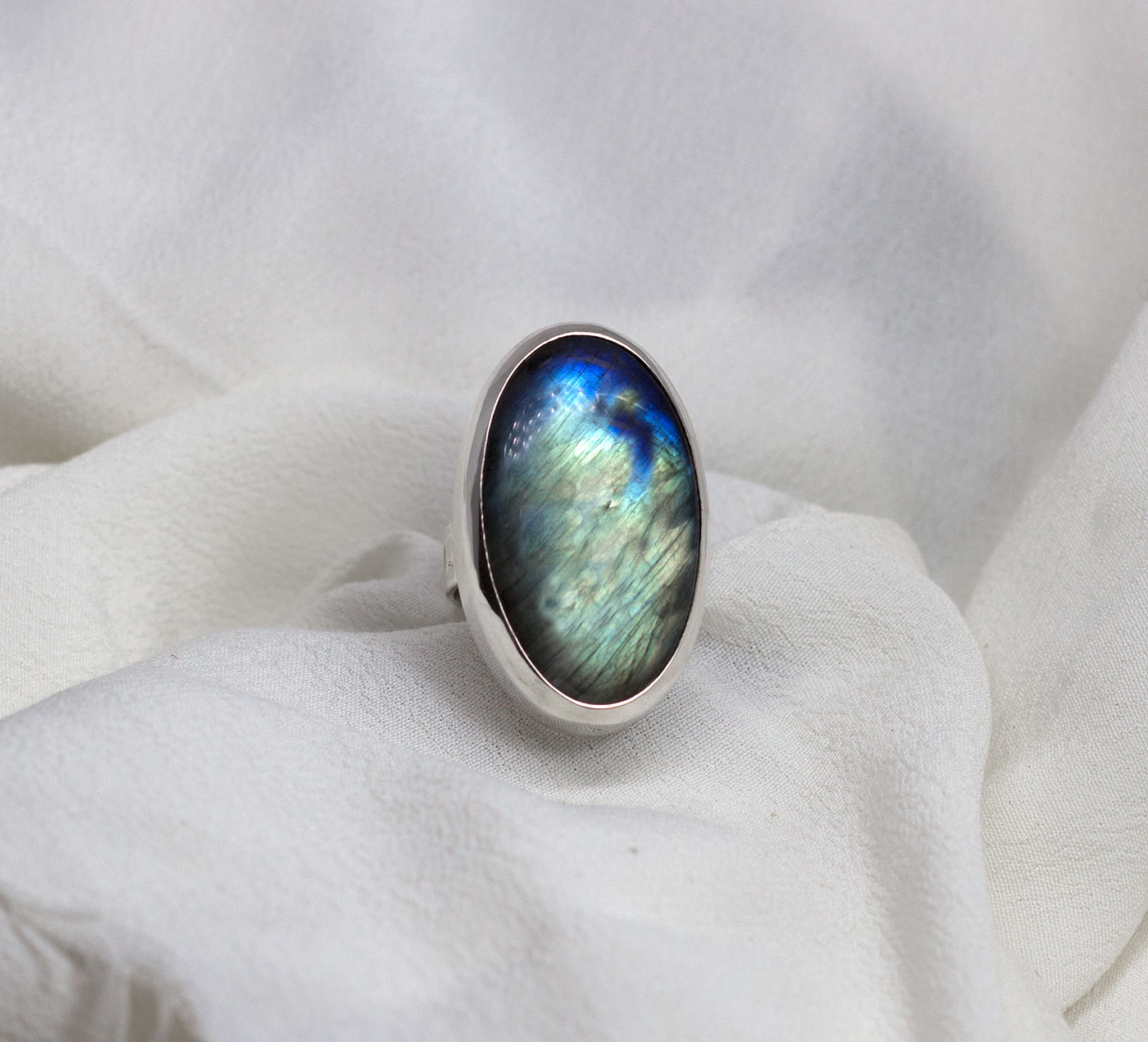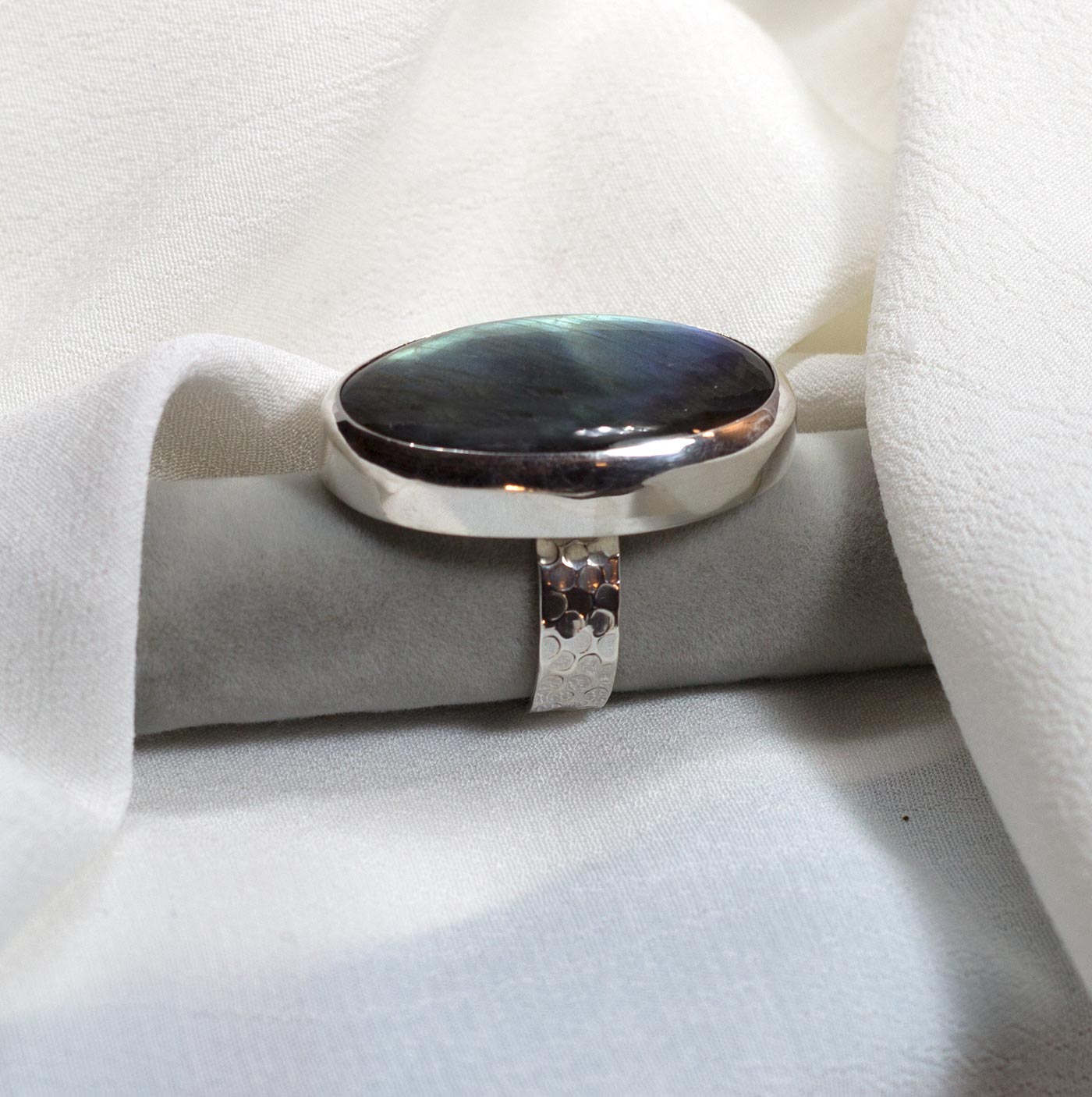 Anillo con labradorita y plata de ley 925. Estos anillos tienen un aro ancho de 6mm con una textura martelada. La piedra es una labradorita con reflejos verdes y azules intensos en toda la superficie. La piedra es ovalada y mide 2,5 cm por 2,3. Viene engarzada siguiendo la línea del dedo. Espiritualmente, la labradorita es el protector más poderoso del reino mineral, creando una fuerza protectora en todo el aura y fortaleciendo las energías naturales desde el interior. Protege contra la negatividad y las desgracias de este mundo. Proporciona una exploración segura de los niveles alternativos de conciencia. Facilita experiencias visionarias del pasado o del futuro. Está elaborado de forma artesanal.