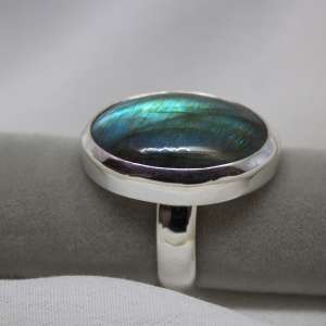 Anillo con labradorita y plata de ley. Está hecho a mano de forma artesanal. La labradorita es ovalada con iridiscencias verdes y doradas.