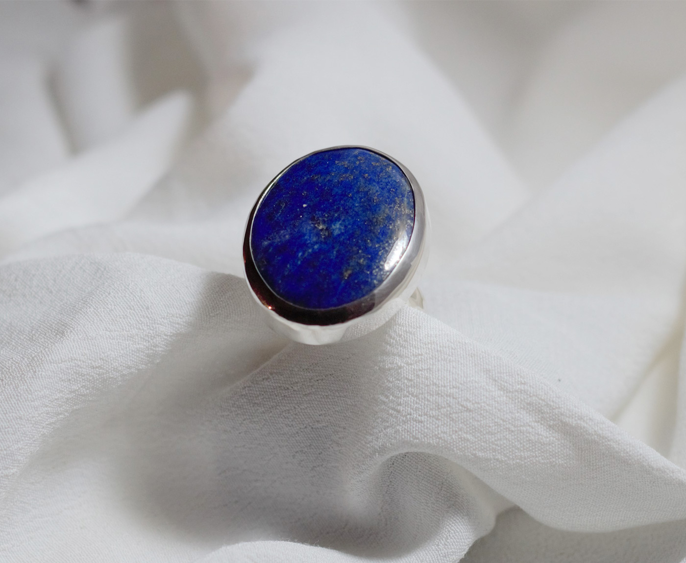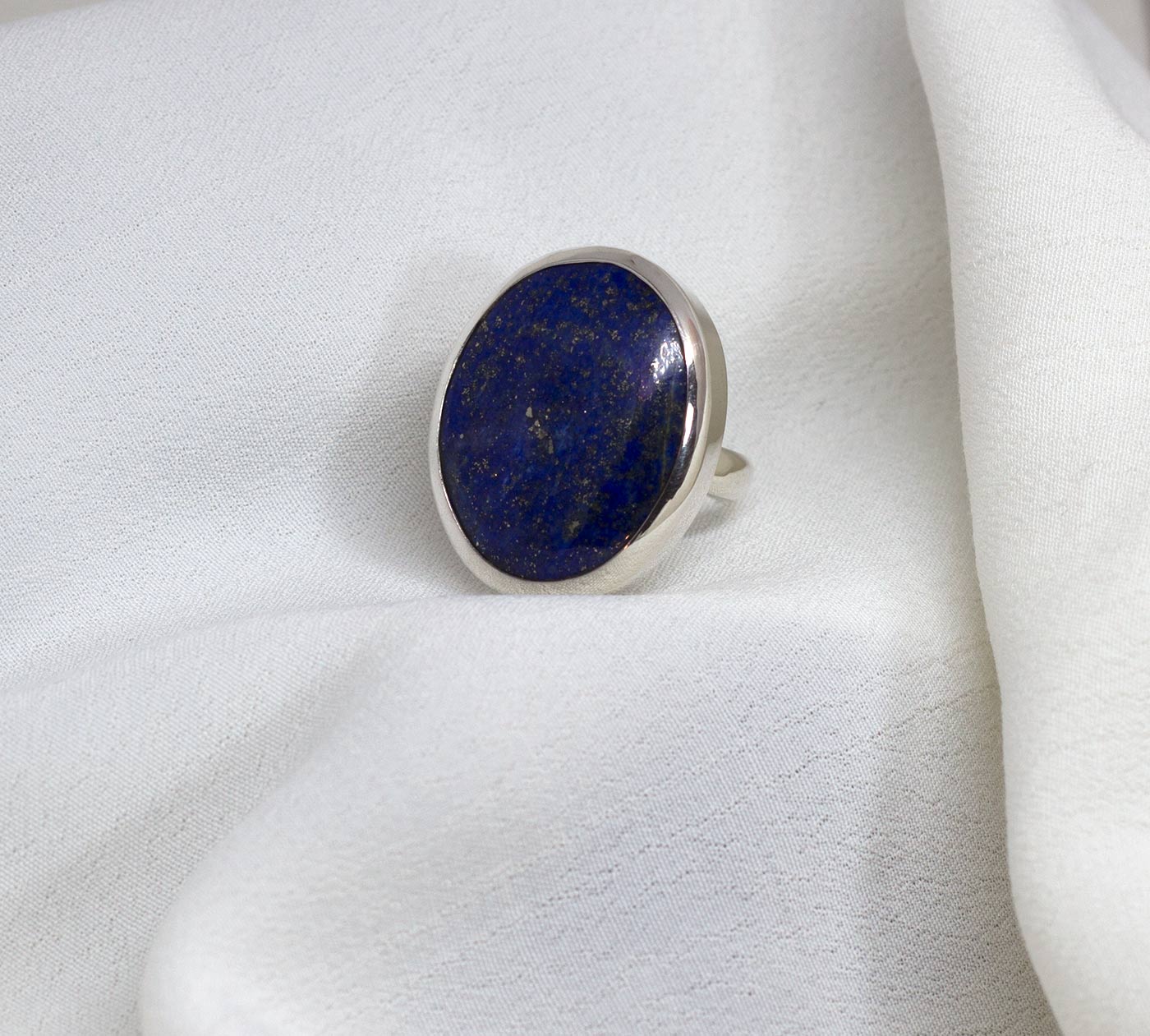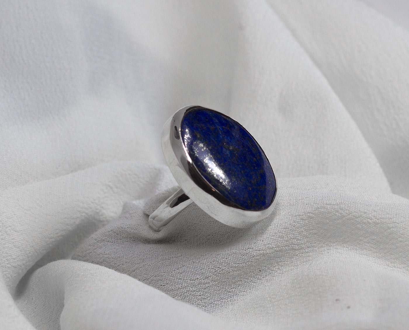 Anillo con lapislazuli de plata de ley 925 fabricado artesanalmente. El lapislazuli es ovalado y proviene de las minas de Afganistán. Tiene un color azul noche y las pequeñas marcas de pirita que aseguran la mejor calidad. La piedra mide 2,7 x2,1 cm y el anillo 3 cm de largo por 2,4 de ancho y 1 de altura. El aro es liso y tiene 4mm de anchura. Talla 8.5.