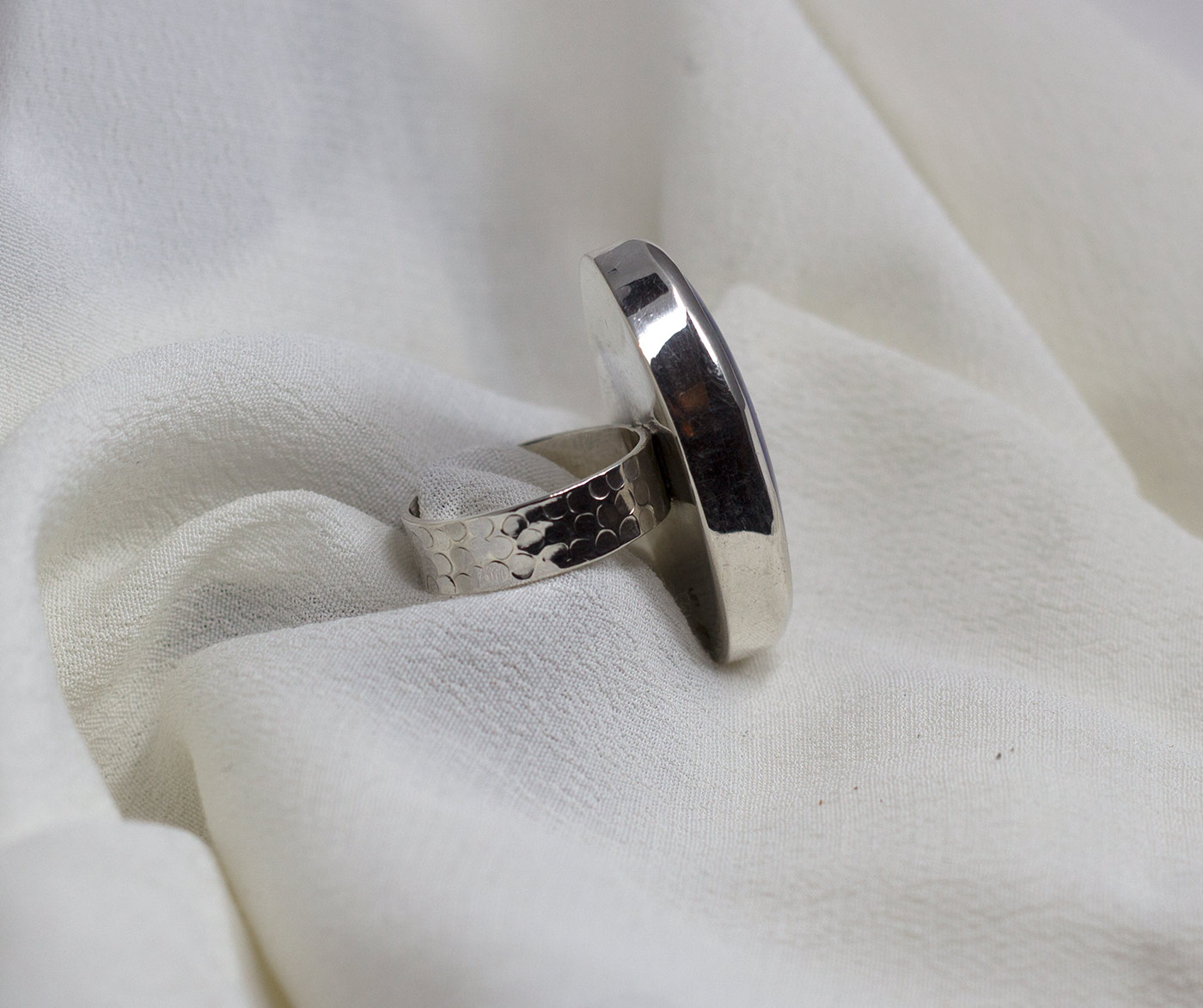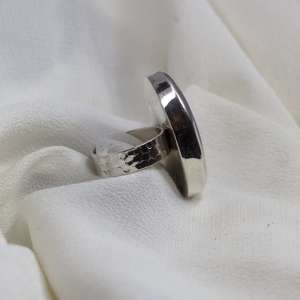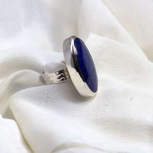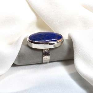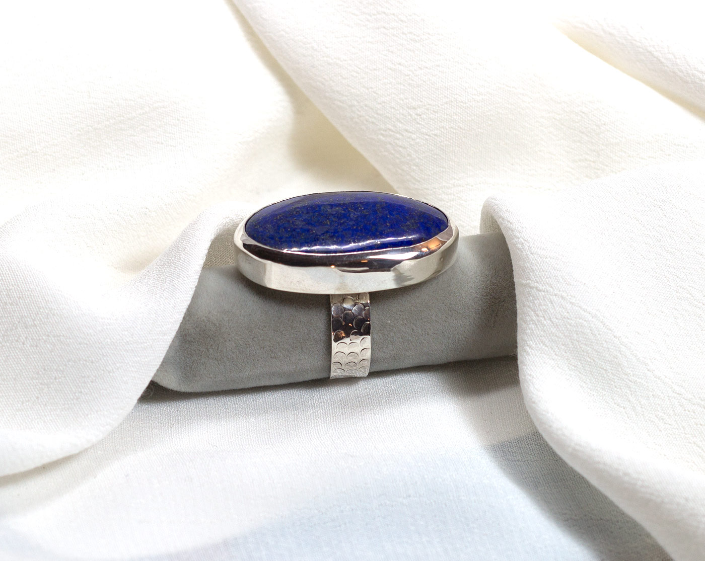 Anillo con lapislazuli y plata de ley 925. Estos anillos se caracterizan por su lapislázuli de tamaño grande y un aro ancho de 6mm con textura martelada gruesa. El lapislázuli proviene de Afganistán,donde se encuentran los yacimientos de primera calidad. El color es azul noche profundo con motas doradas de pirita, que atestiguan su autenticidad. El tamaño de la piedra es de 3 cm por 1,8, y tiene forma ovalada. Están fabricados artesanalmente.