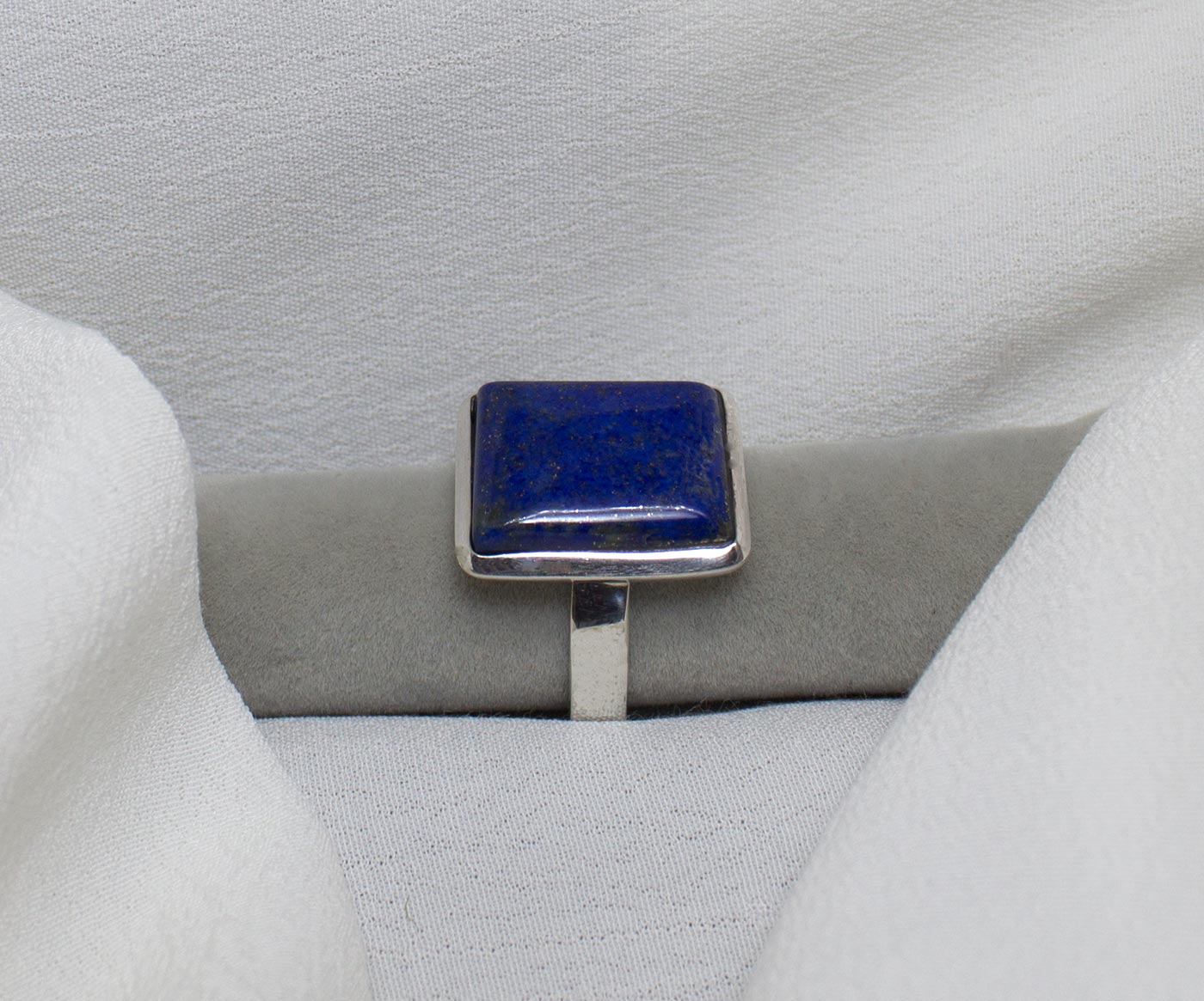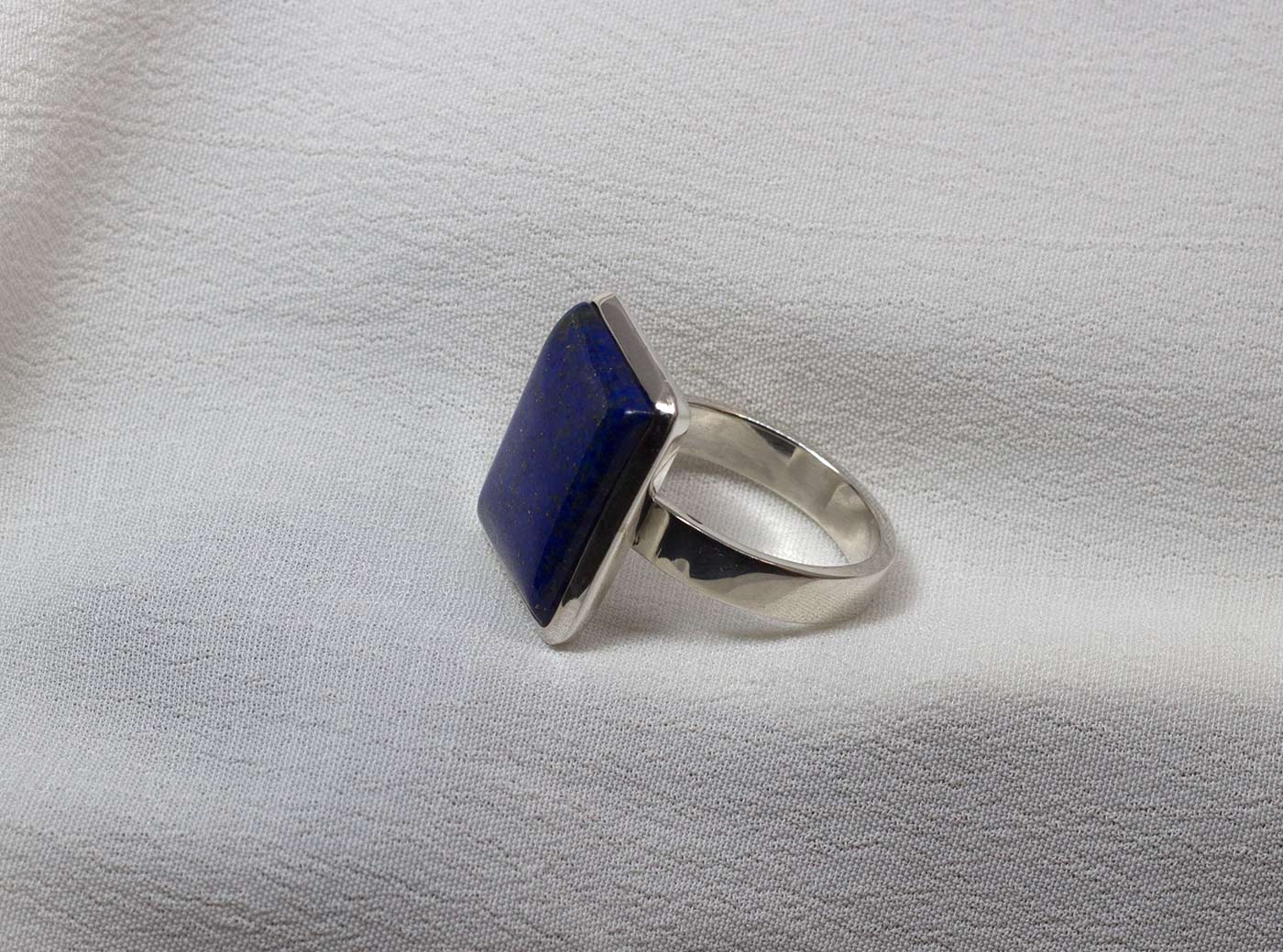 Anillo con lapislazuli y plata de ley 925. El lapislazuli es rectangular y de color azul noche intenso. Proviene de los yacimientos de Afganistán. Mide 1,8 cm por 1,5. Talla 8.5