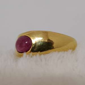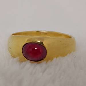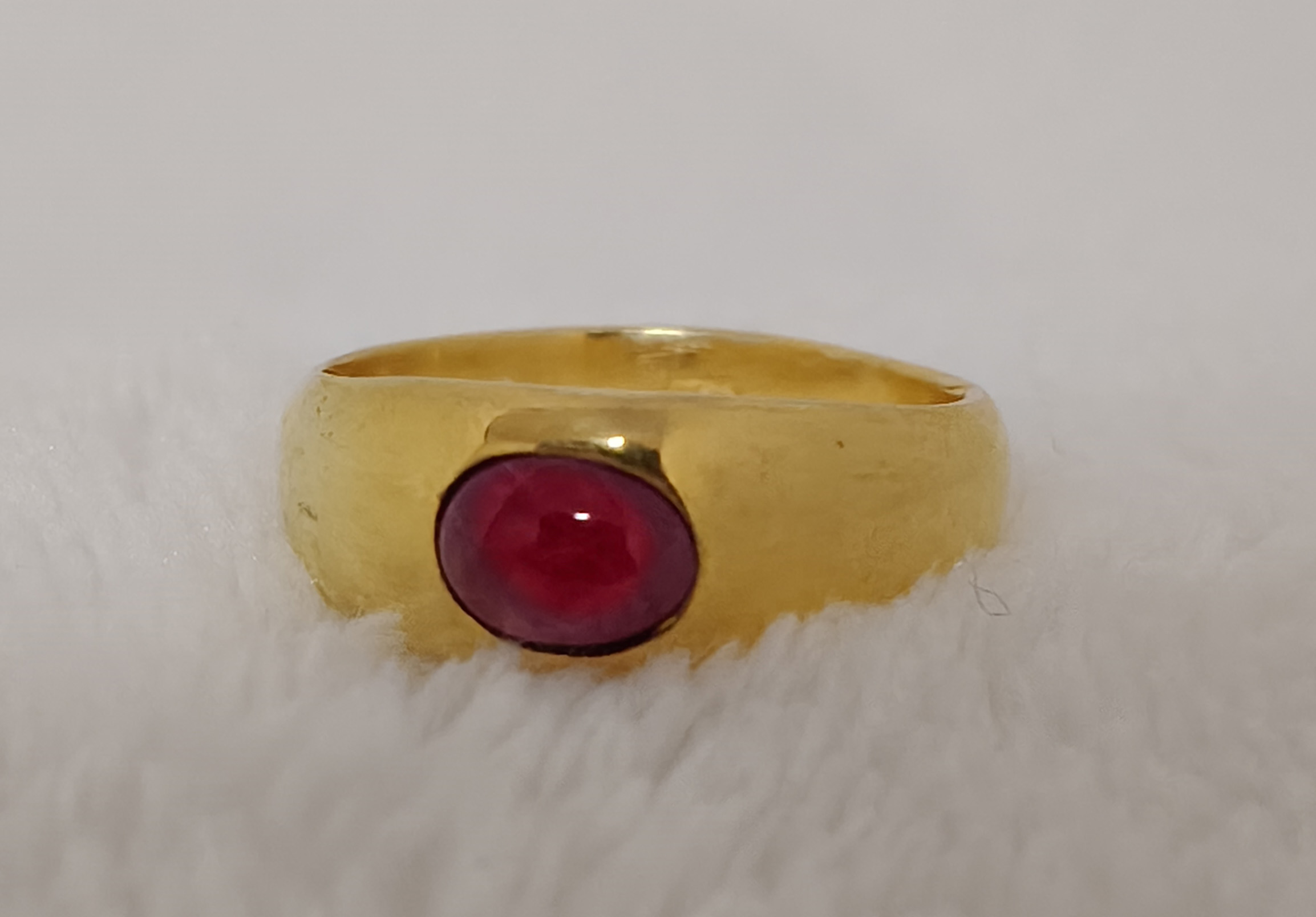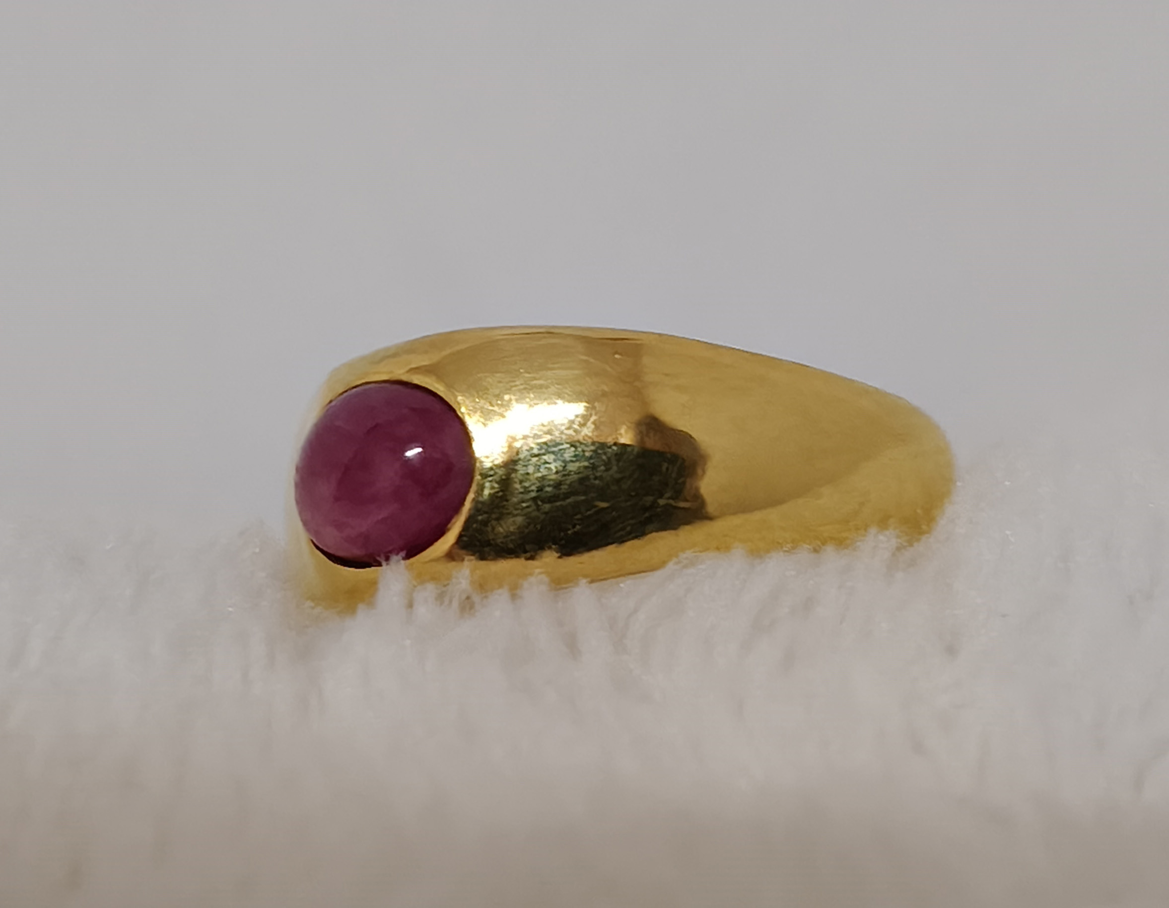 Anillo con un rubí estrellado, elaborado en plata de ley 925 y chapado en oro 18 quilates. La piedra mide 7×5 mm. Es un rubí estrellado, así llamado por formarse una estrella cuando recibe la luz. Para ello está tallado en cabujón. La forma del anillo es ligeramente redondeada. Está elaborado en varias tallas y totalmente trabajado en modo artesanal.