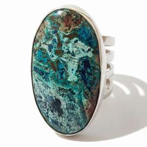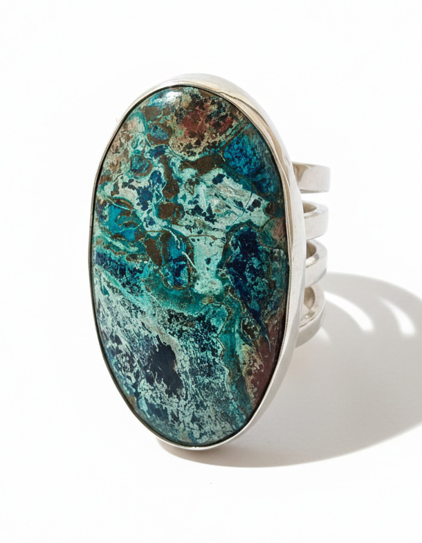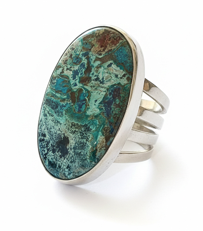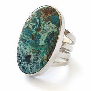 Anillo de crisocola con 4 aros elaborado en plata de ley. Es una crisocola con colores azules, verdes y marrones de distintos tonos formando un precioso diseño. La piedra mide 3,8 cm de largo por 2,2 de ancho. Talla 9.5 y está elaborado artesanalmente.