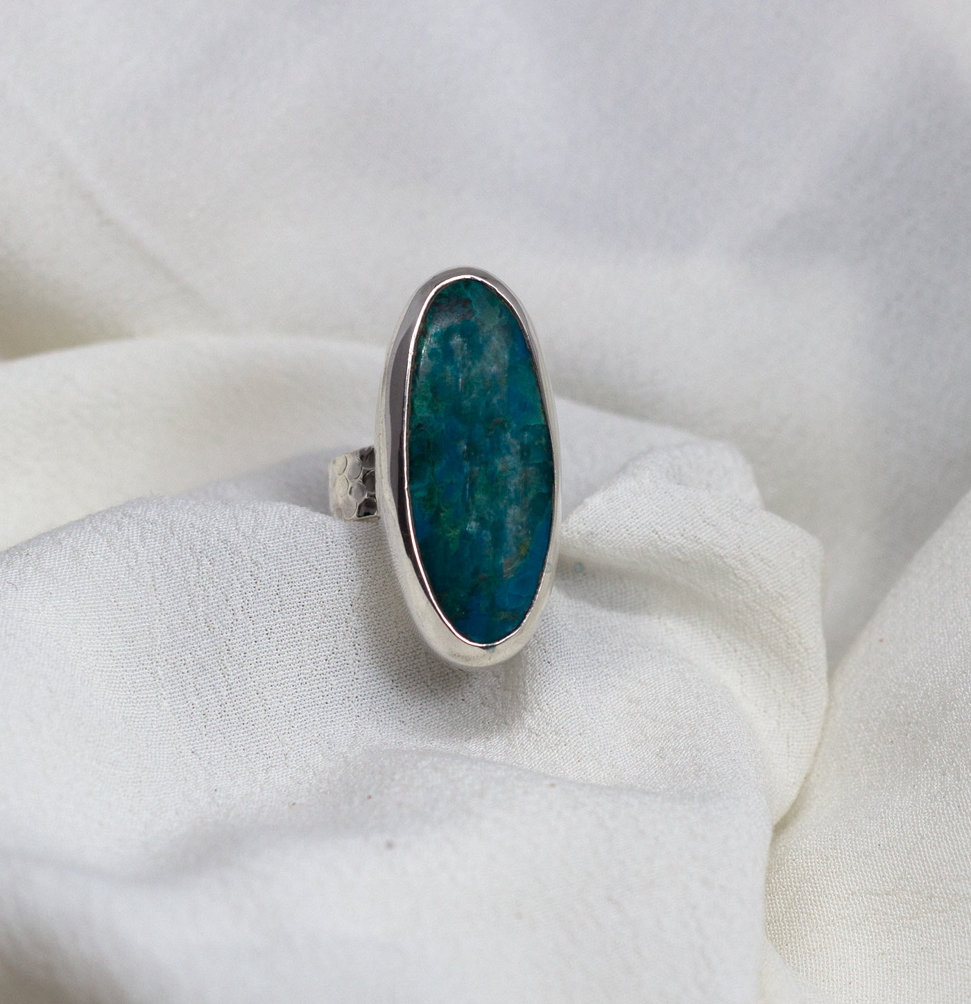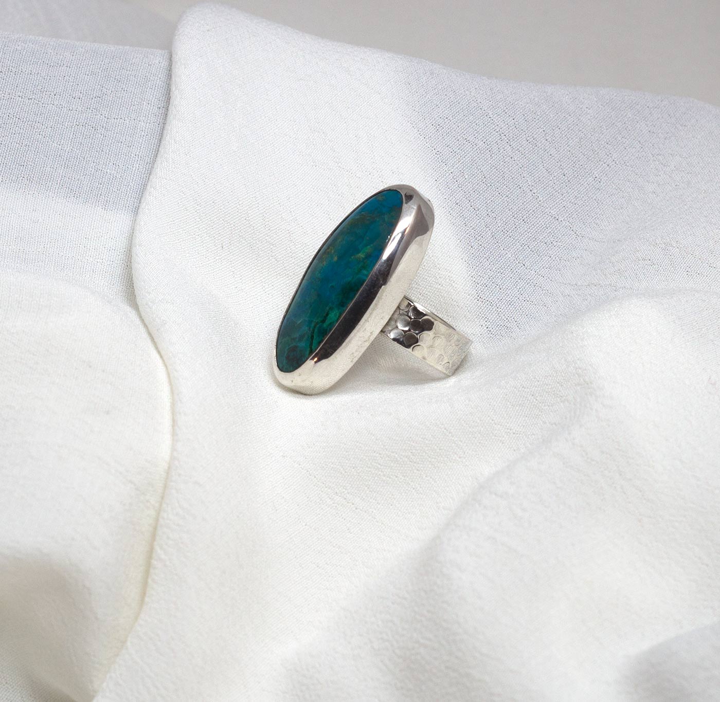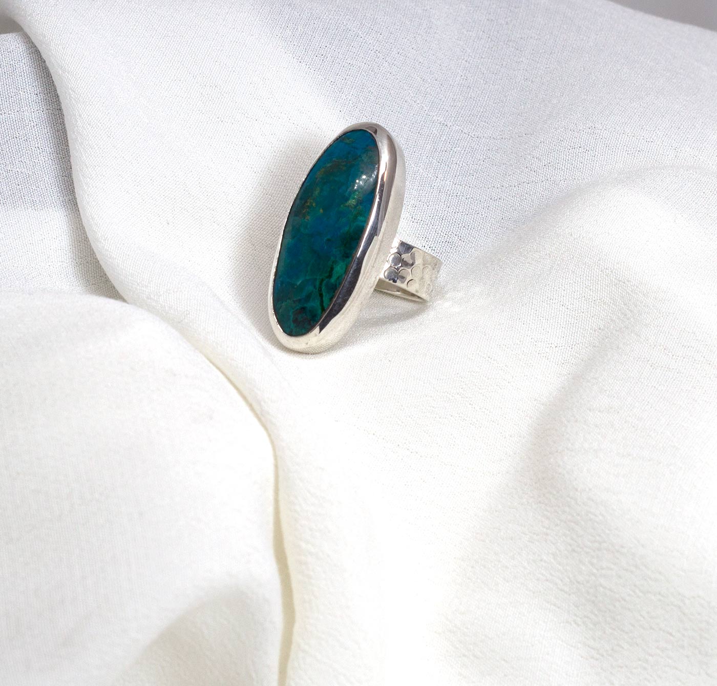 Anillo de crisocola con plata de ley 925. Estos anillos tienen un aro ancho de 6mm con una textura martelada. La piedra es una crisocola con preciosos tonos de verdes y azules. La crisocola se caracteriza por su vistosidad. Puede presentar tonalidades azules y verdes, debido a su alto contenido de cobre. Hay ocasiones en las que se encuentra cubierta por una fina capa de cuarzo e incluso entrelazada con éste. La piedra es ovalada y mide 3,3 cm por 1,4. Viene engarzada siguiendo la línea del dedo. Espiritualmente ayuda a enfriar las emociones ardientes y excitantes tan pronto como toca la piel. Alivia el estrés relacionado con el trabajo; el cristal Crisocola nos recuerda que debemos salir de la vida cotidiana y tomarnos un tiempo para flotar por el río turquesa del espíritu interior. Se conecta con el agua, y ayuda fuertemente a la rutina diaria de bienestar. Está elaborado de forma artesanal.