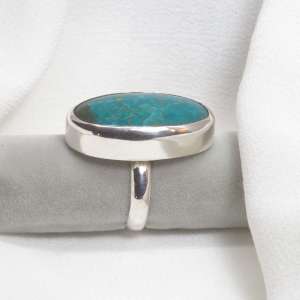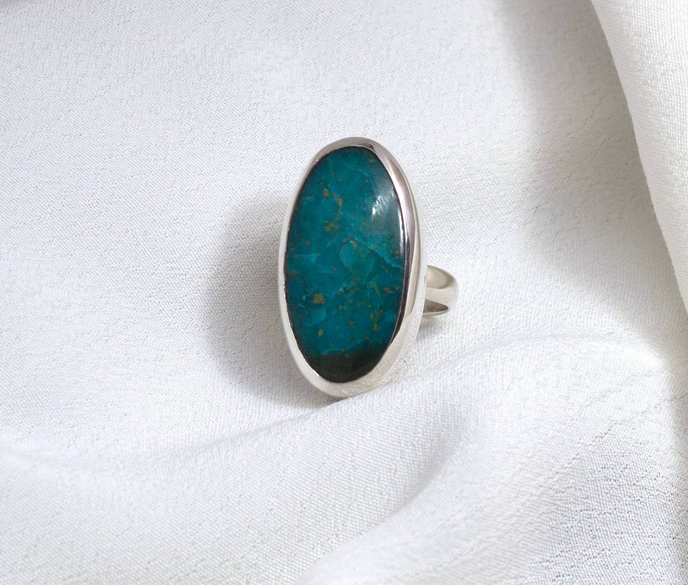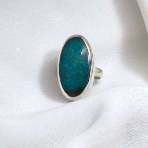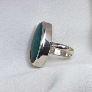 Anillo de Plata de Ley 925 con una crisocola ovalada verde azulada, formando aguas y de gran vistosidad . La piedra tiene un tamaño de 2,7×1,4cm. La medida del anillo es de 3cm largo por 1,7 de ancho. El aro es liso de 4mm de anchura.