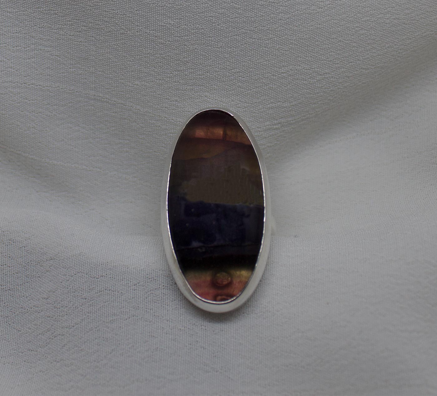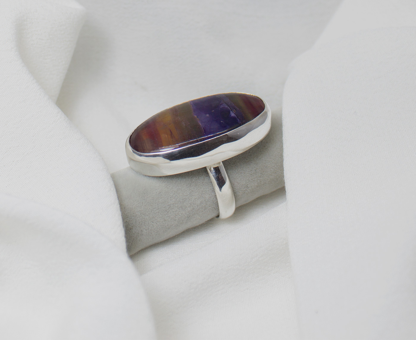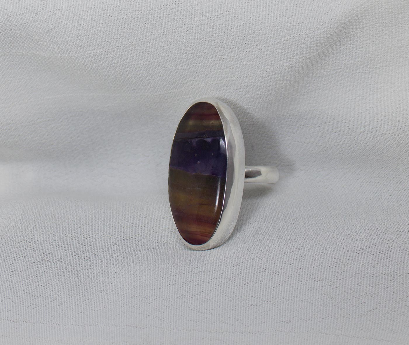 Anillo de fluorita con plata de ley 925. Está elaborado artesanalmente. Lleva engarzada una preciosa fluorita semitransparente de varios colores. Su tamaño es de 3,2 cm de largo por 1,8 de anchura. y con un aro de 4mm. Tallas 9 y 10
