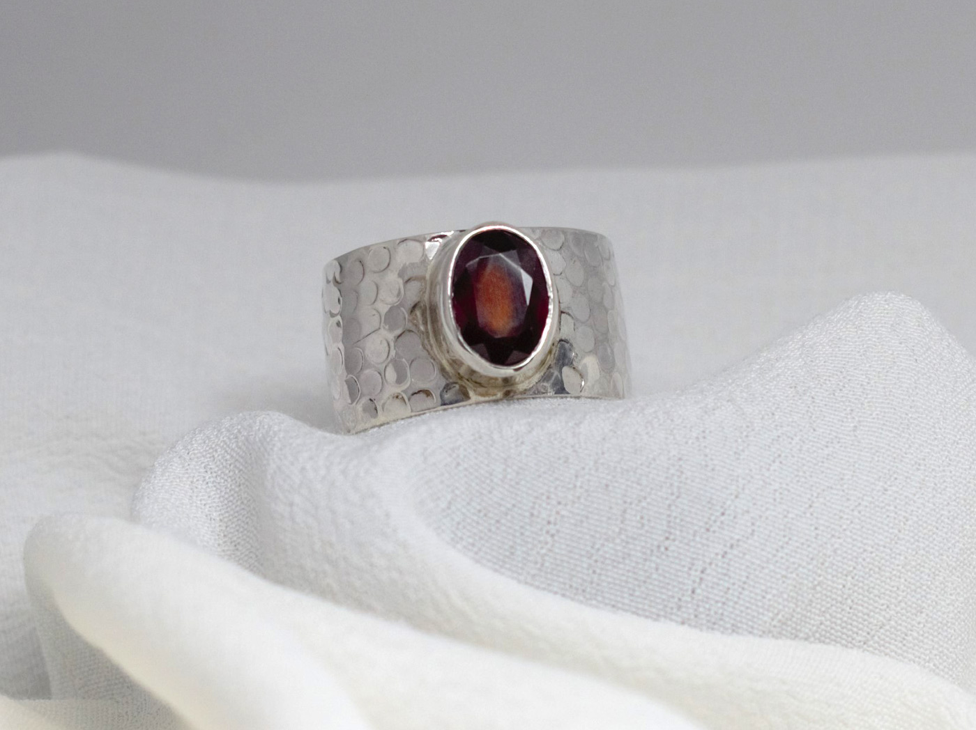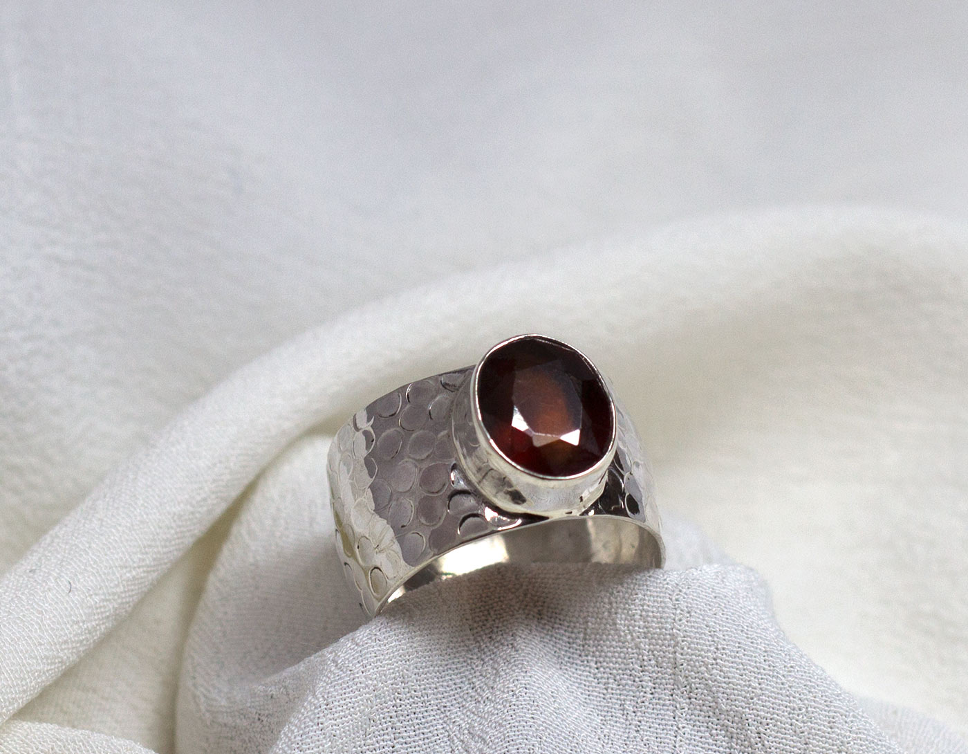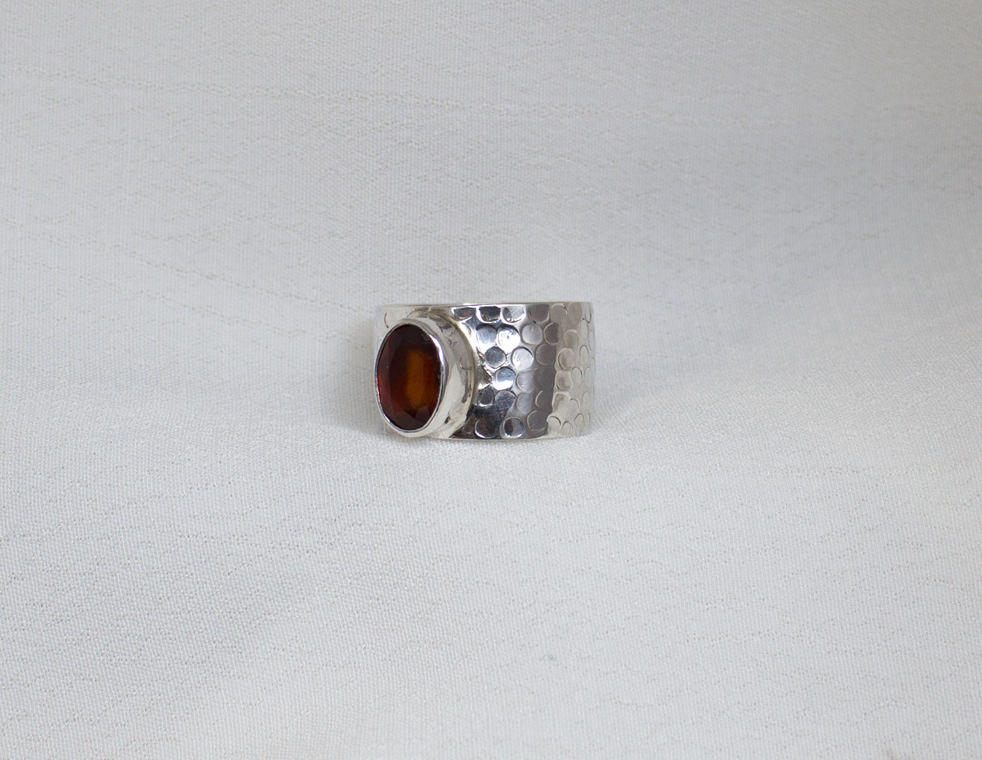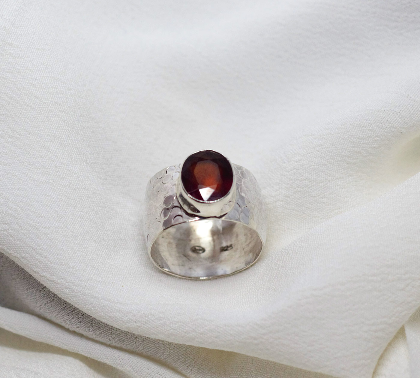 Anillo de hessonita en plata de ley 925. Preciosa hessonita facetada con un bonito color rojo anaranjado. La piedra es ovalada de un tamaño de 1 cm de largo por 0,7. El modelo tiene el aro texturado con un martelado grueso y un ancho de 12 mm. La forma del aro es ligeramente cóncava. Está fabricado de modo artesanal. Viene en tallas 9 y 8.5.