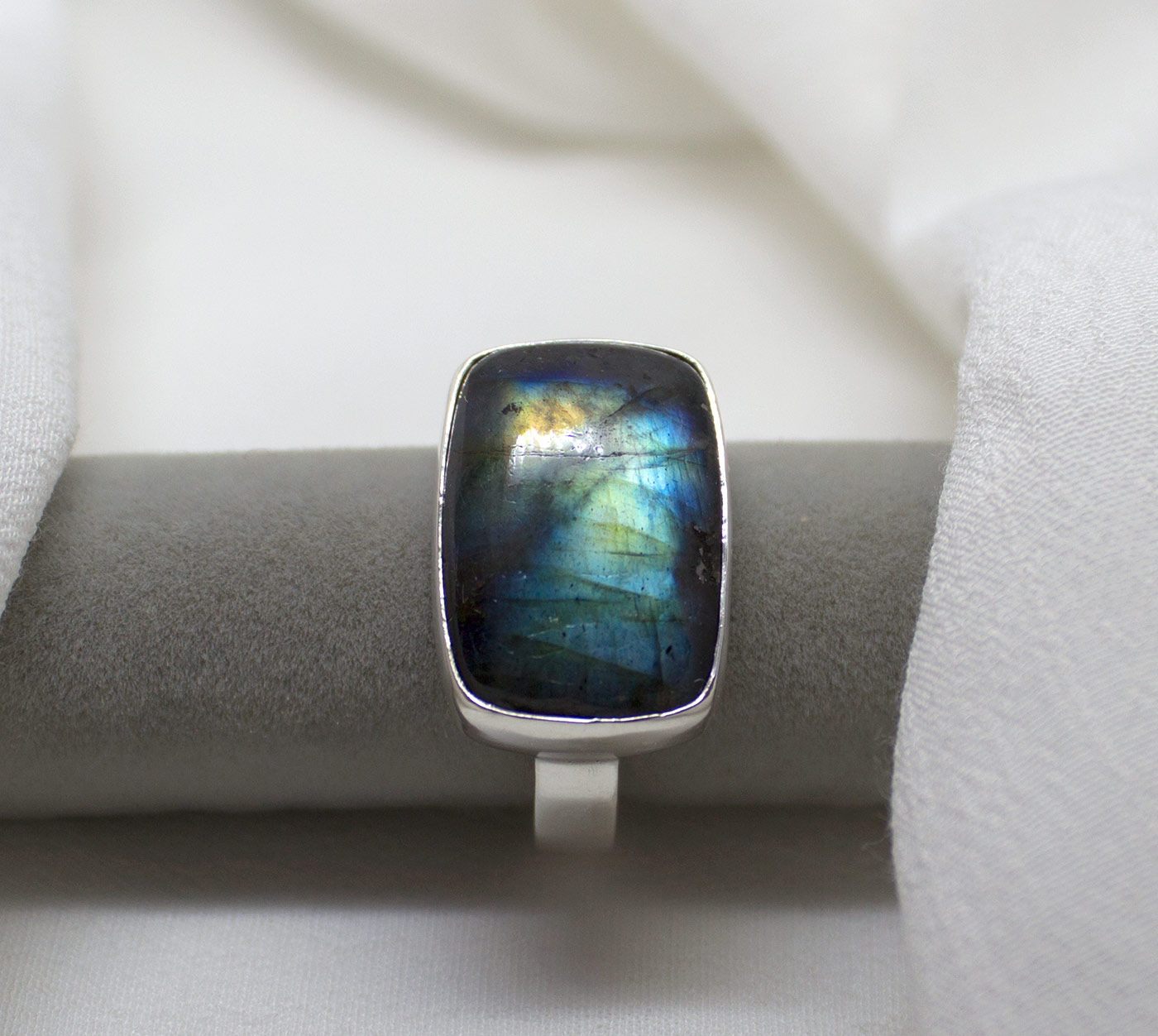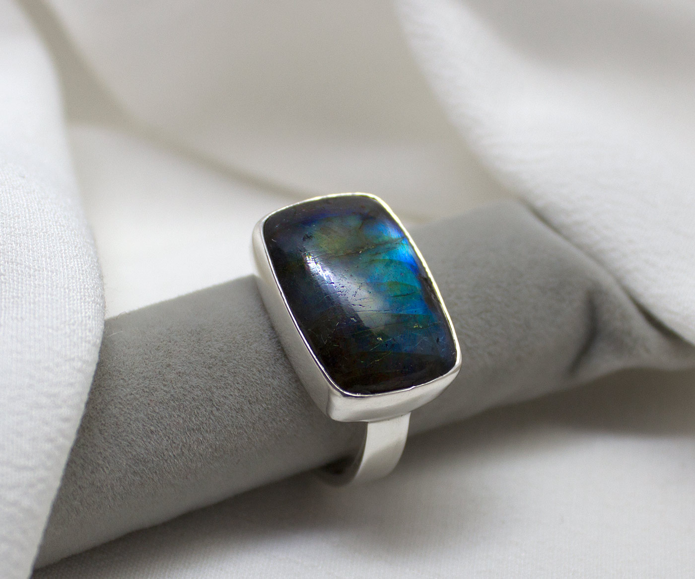 Anillo de labradorita y Plata de Ley 925. Lleva engarzada una bella labradorita con gran iridiscencia verde dorada y tonos azules. Va de forma transversal a la línea del dedo. Tiene forma rectangular y mide 1,3 cm de largo por 2 de ancho y un brazo plano de 4mm.