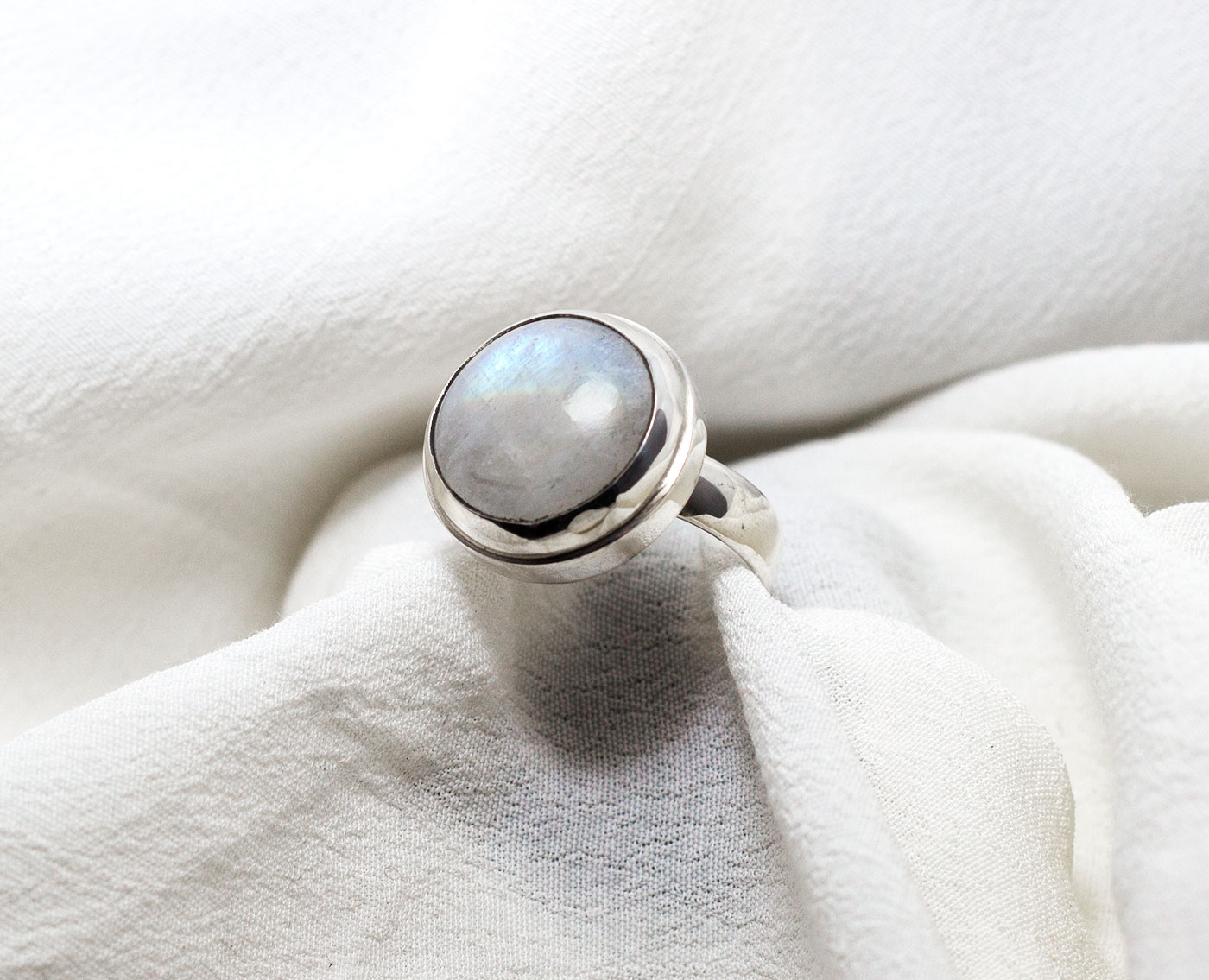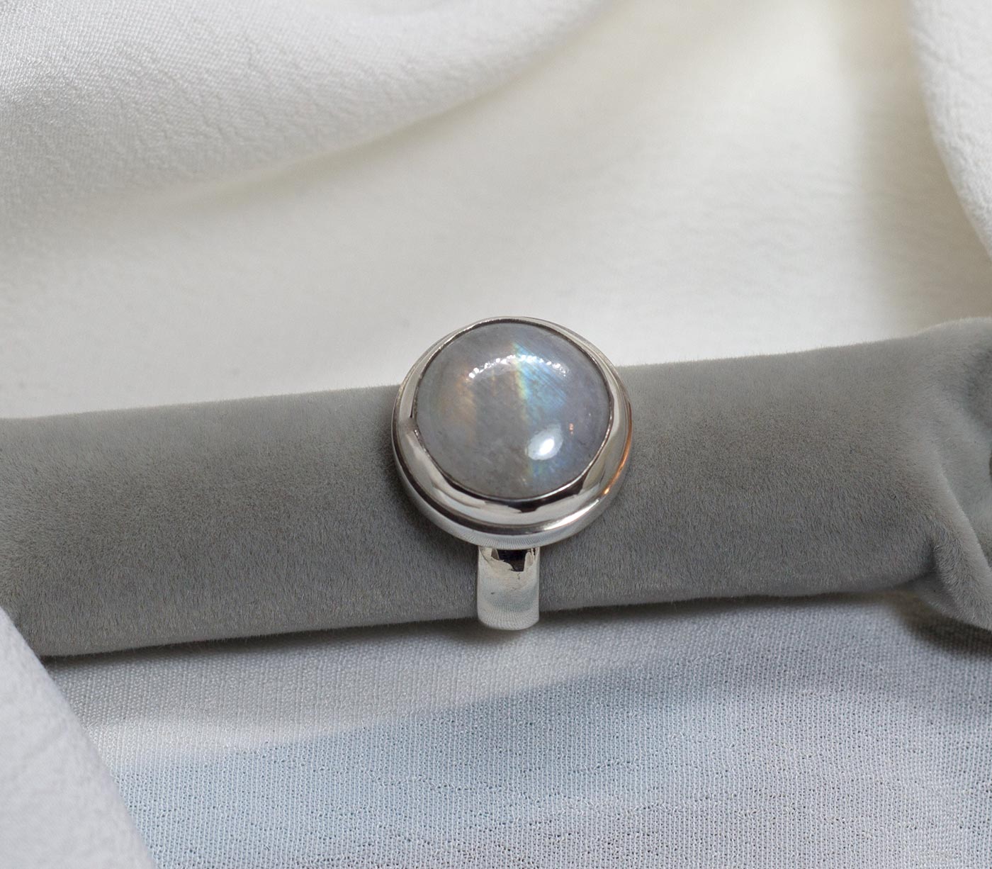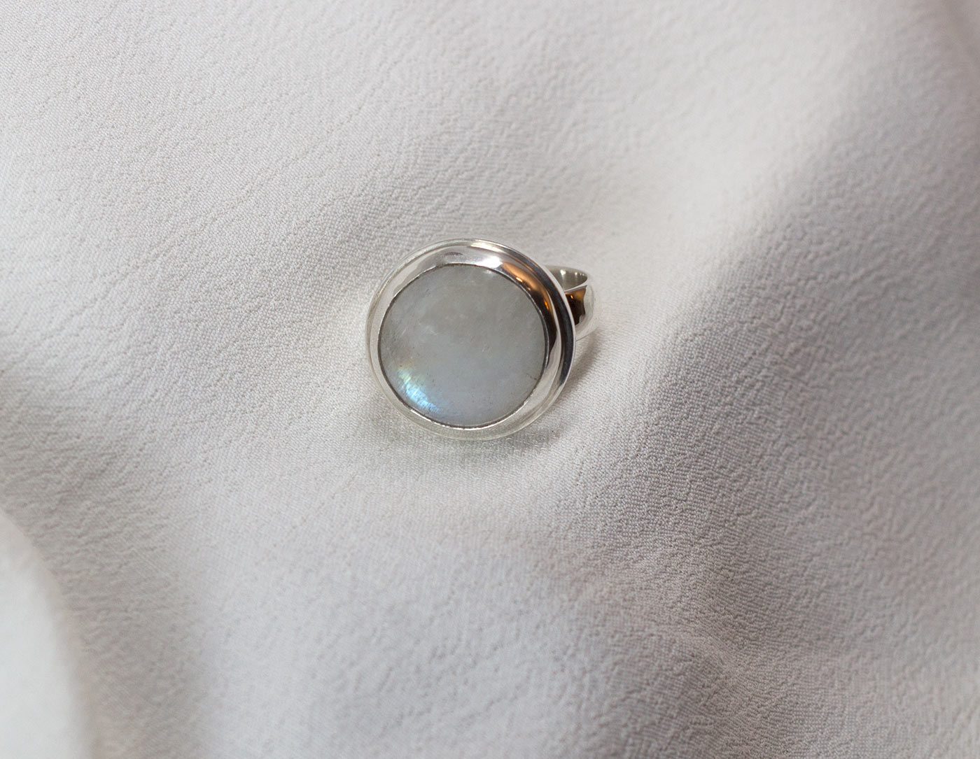 Anillo de piedra de luna arco iris elaborado en plata de ley 925. La piedra de luna es redonda y con una iridiscencia con los colores del arco iris en susu superficie. El tamaño de la piedra es de 1,5 cm de diámetro. El modelo viene con un diseño de doble caja y un aro liso de 5 mm. Está elaborado artesanalmente. Es de talla 8.