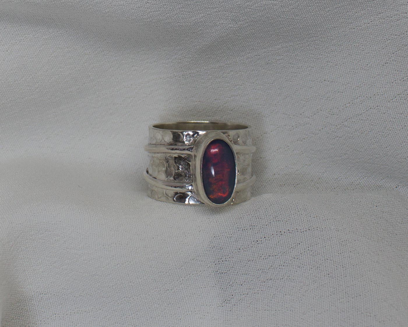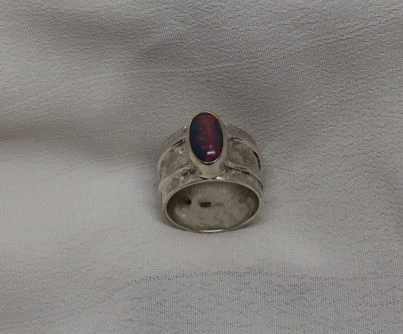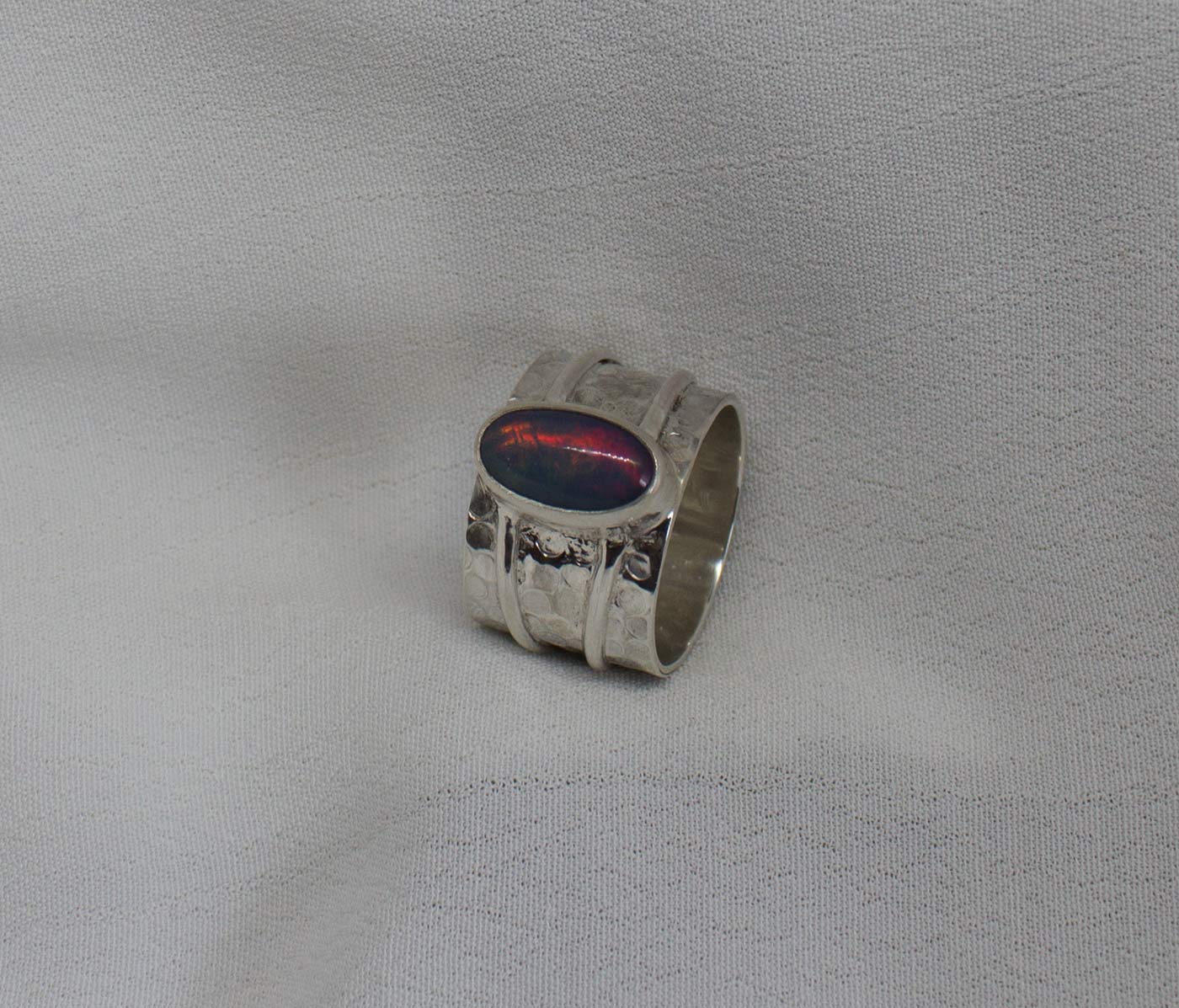 Anillo ancho de plata de ley 925 con opalo negro. Su aro es ancho, de 13 mm. Viene texturado con un martelado grueso y el aro va rodeado por dos finos hilos lisos de plata. El ópalo es ovalado y estrecho y tiene una bella opalescencia roja, amarilla y verde. Mide 1,2 cm de largo por 0,6. Proviene de Etiopía. El anillo está elaborado artesanalmente. Al ser un aro bastante ancho sugerimos elegir 1/2 talla más de la usada normalmente. Talla 8.5.