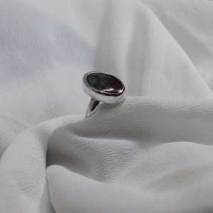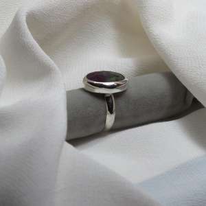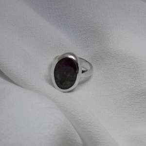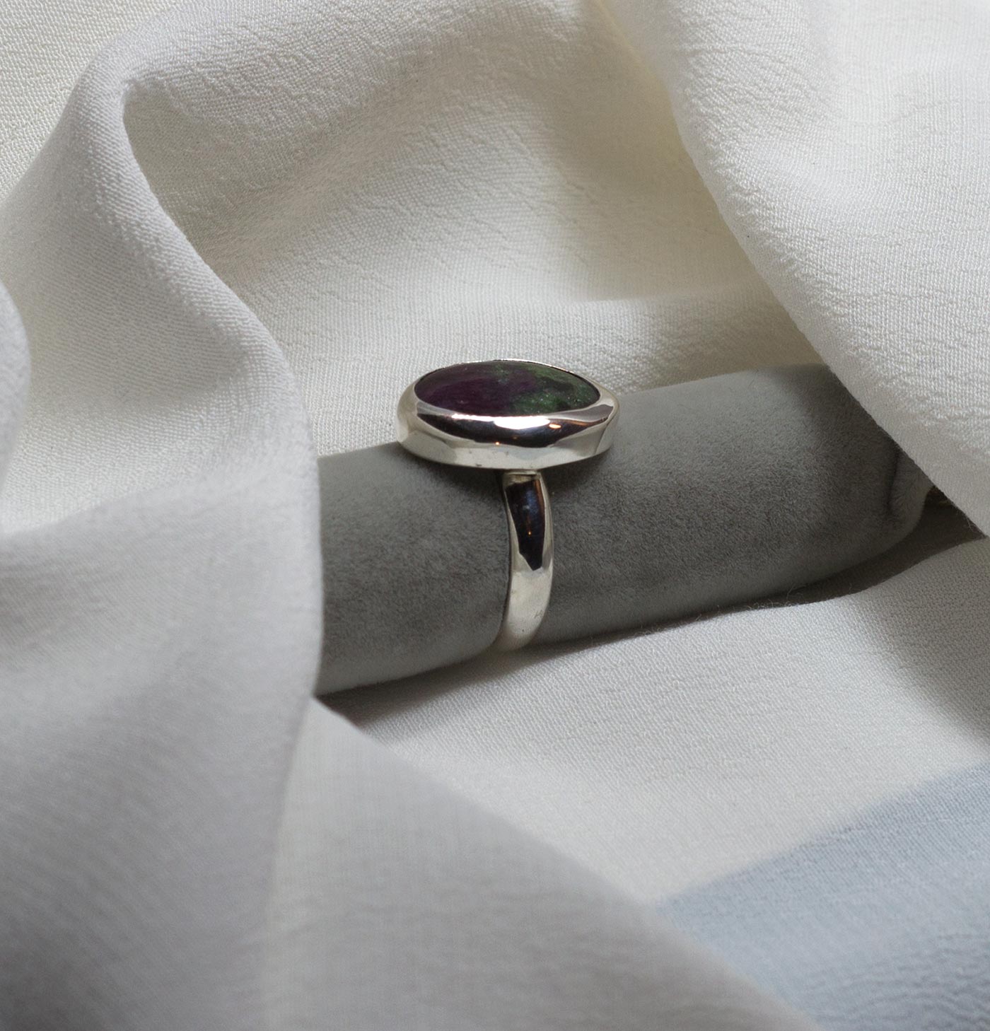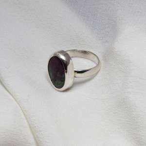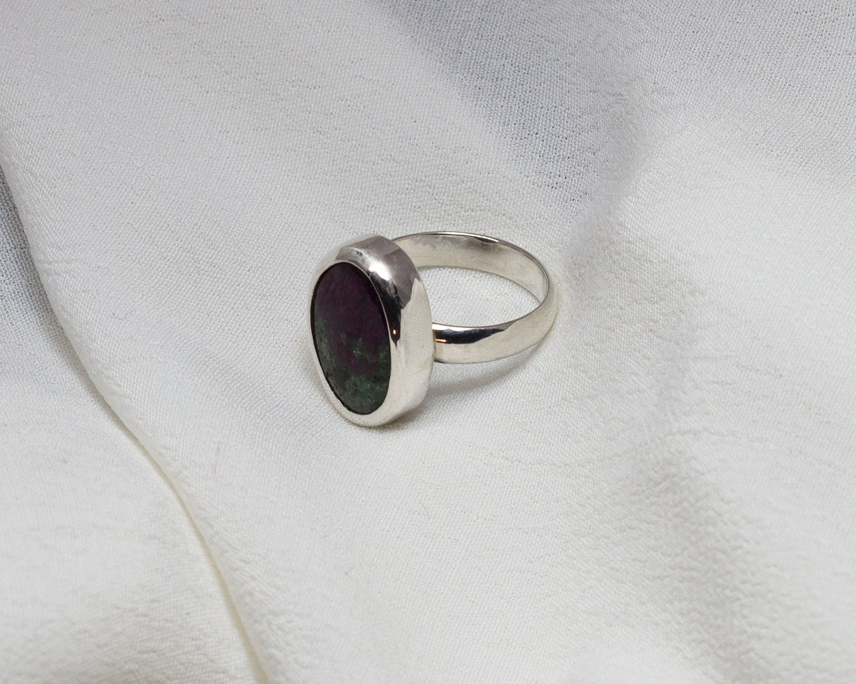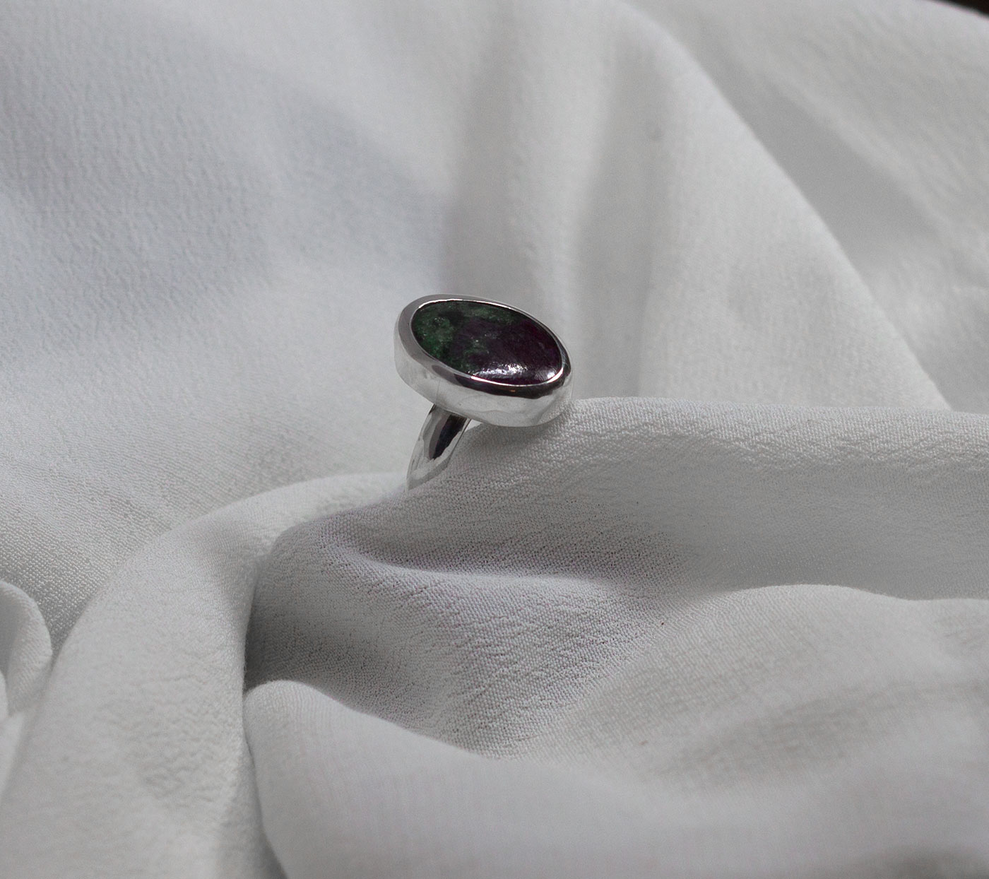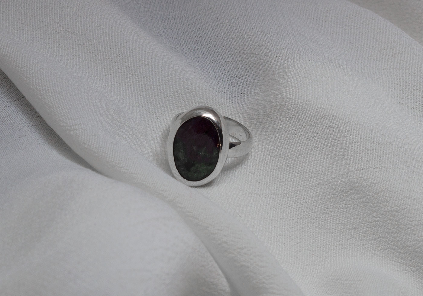 Anillo de Plata de Ley 925 con un rubi-zoisita. La aniolita o rubi-zoisita tiene la característica de llevar unidas en ella a la piedra zoisita de color verde y el rubí con inclusiones negras de hornblenda. En esta piedra se ven claramente los dos minerales. Tiene forma ovalada con un tamaño de 1cm por 1,6. El aro del anillo es de 4mm.