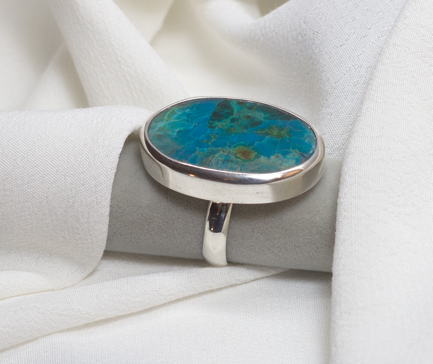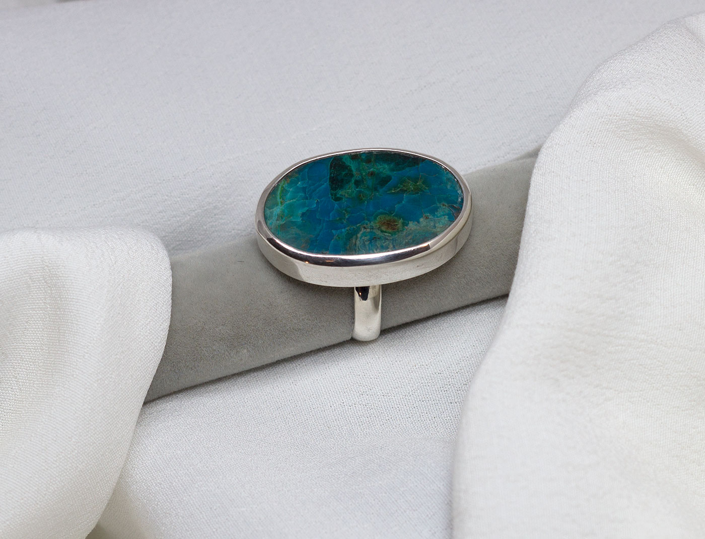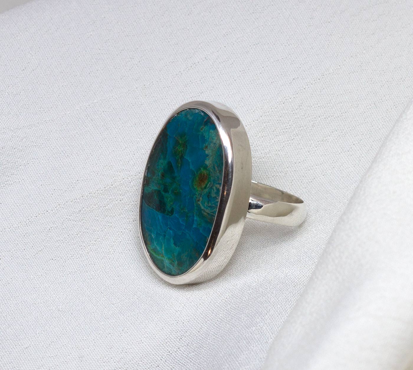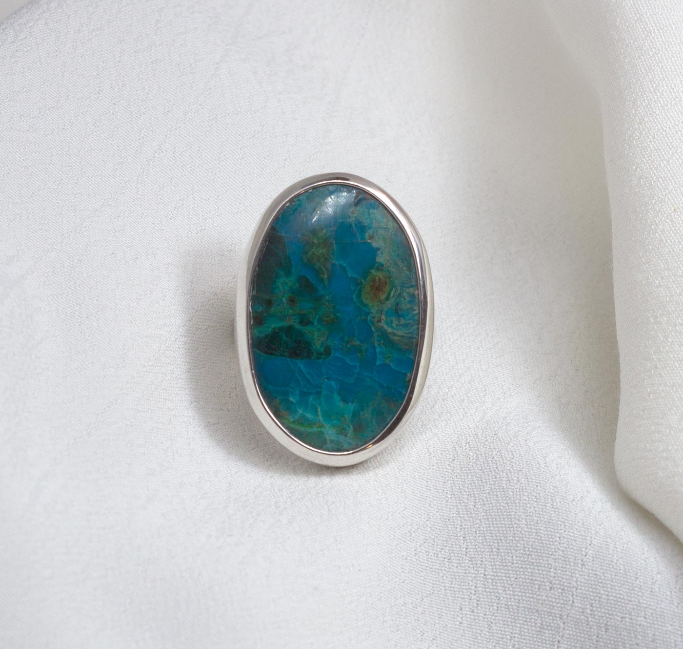Anillo de Plata de Ley 925 con una crisocola ovalada de tamaño grande engarzada. La piedra es de color verde azulado y de gran belleza. Los colores se van moviendo formando aguas. Tiene un tamaño de 3 x1,7cm. El largo del anillo es de 3,3 cm por una anchura de 2,2. El aro mide 4mm.