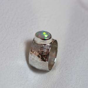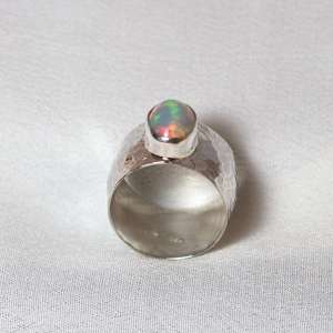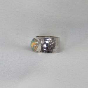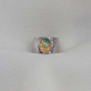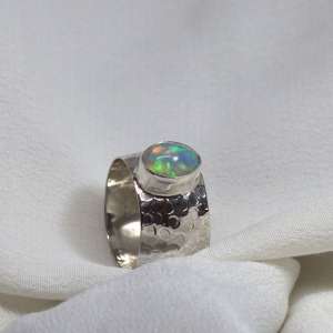 Anillo de plata de ley 925 con opalo blanco. Precioso ópalo proveniente de las minas de Etiopía. Tiene, al movimiento de incisión de la luz, un juego de opalescencia de luces verdes, doradas, azules y naranjas que se van moviendo por toda la superficie. También podemos ver al mismo tiempo, que del interior de la piedra surge un fuerte color naranja. La piedra es ovalada de un tamaño de 1,1 cm de largo por 0,9. El modelo tiene el aro texturado con un martelado grueso y un ancho de 13 mm. La forma del aro es ligeramente cóncava. Está fabricado de modo artesanal. Viene en tallas 8 y 8.5