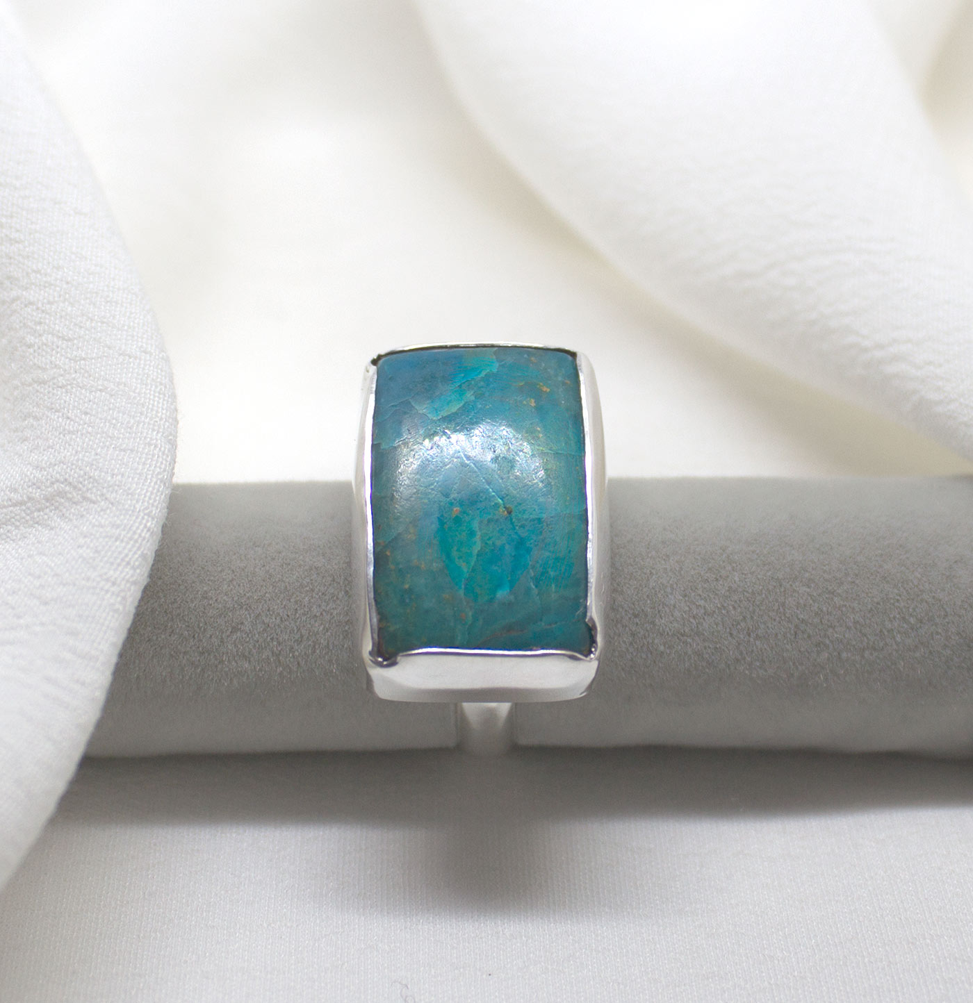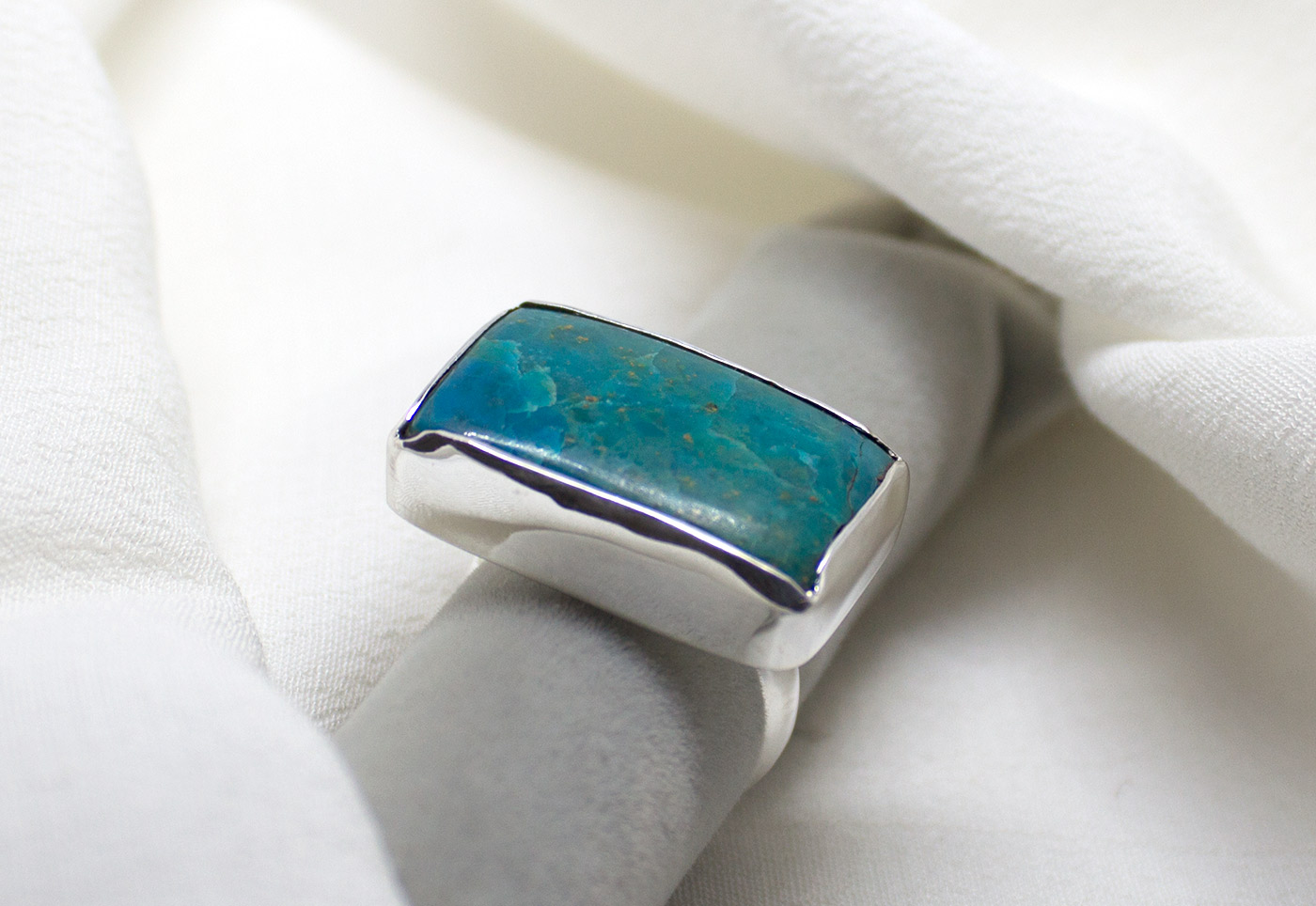 Anillo de Plata de Ley 925 . Lleva engarzada una crisocola verde azulada formando aguas. La forma de la crisocola es rectangular. La piedra mide 2,2×1,3 cm. El tamaño del anillo es de 2,5 cm de ancho y 1,7 de largo. El aro es liso y de 4mm.