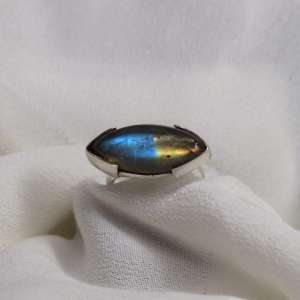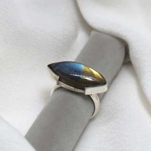 Anillo de plata de ley 925 con labradorita ovalada. La piedra va sujeta solamente por los extremos y va engarzada transversalmente a la línea del dedo. La labradorita tiene bellos tonos dorados y azules. La medida de la piedra es de 2,5 cm por 1. Está elaborado artesanalmente.