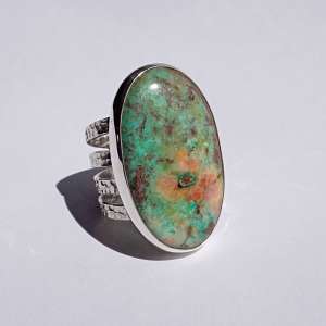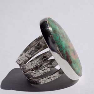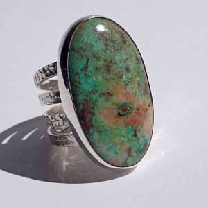 Anillo de plata de ley y crisocola con 3 aros martelados de 2,80 mm cada uno. La crisocola forma una paleta de colores verde mar, naranja y pinceladas de marrones. La piedra mide 3,6 cm de largo por 2,1 de ancho. Talla 9.5. Está elaborado artesanalmente.