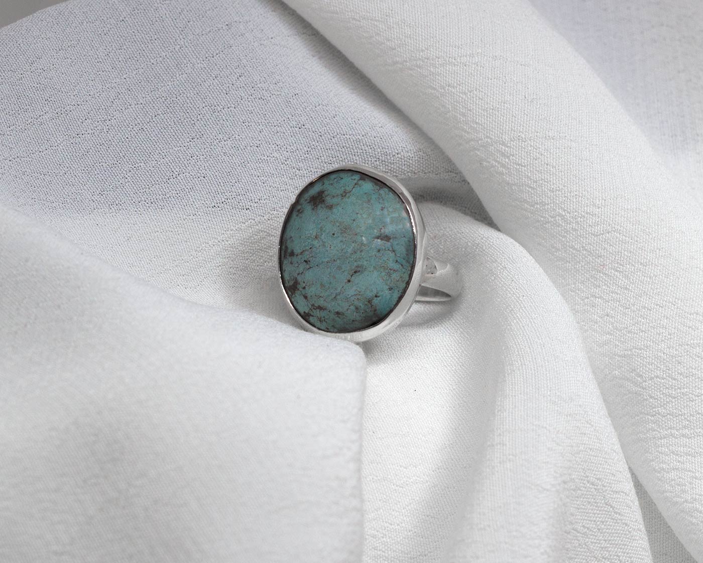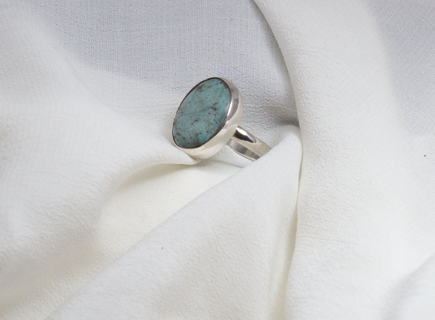 Anillo de turquesa con plata de ley 925. Lleva engarzada una turquesa tibetana de color azul celeste y un tamaño de 2,1 cm de largo por 1,7 de ancho. Viene con un aro de 4mm de anchura.