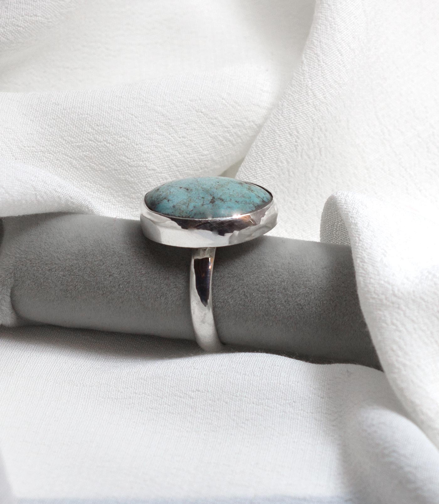Anillo de turquesa con plata de ley 925. Lleva engarzada una turquesa tibetana de color azul celeste y un tamaño de 2,1 cm de largo por 1,7 de ancho.