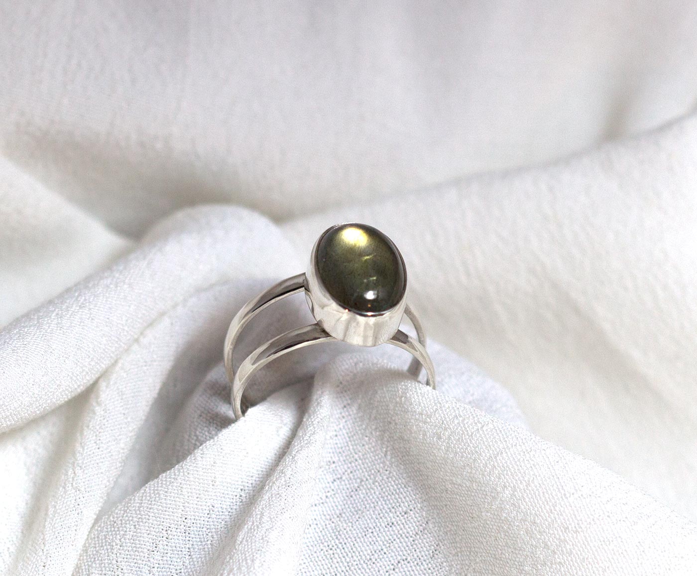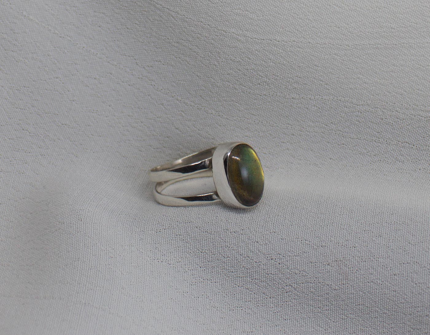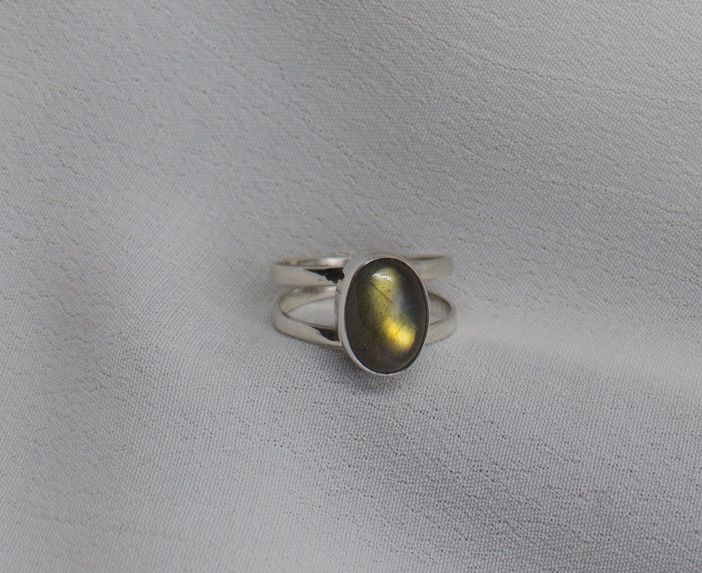 Anillo doble aro con labradorita y plata de ley 925. Elaborado de forma artesanal. La labradorita tiene un precioso reflejo dorado. Mide 1,2 cm de largo por 0,8 de ancho. Los dos aros que forman el brazo del anillo se unen en la parte inferior. Viene en talla 7.5