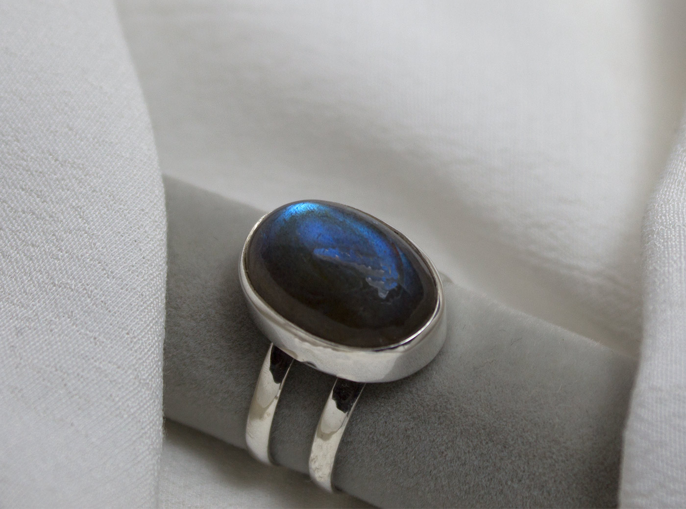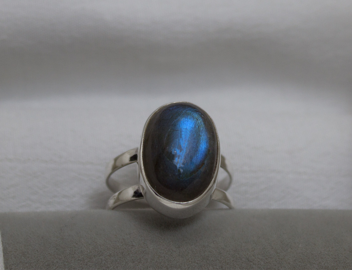 Anillo en plata de ley 925 con labradorita y doble aro paralelo. La labradorita es de forma ovalada y tiene iridiscencias azules. Mide 1,7 cm de largo por 1,2 de ancho. Viene en talla 9.