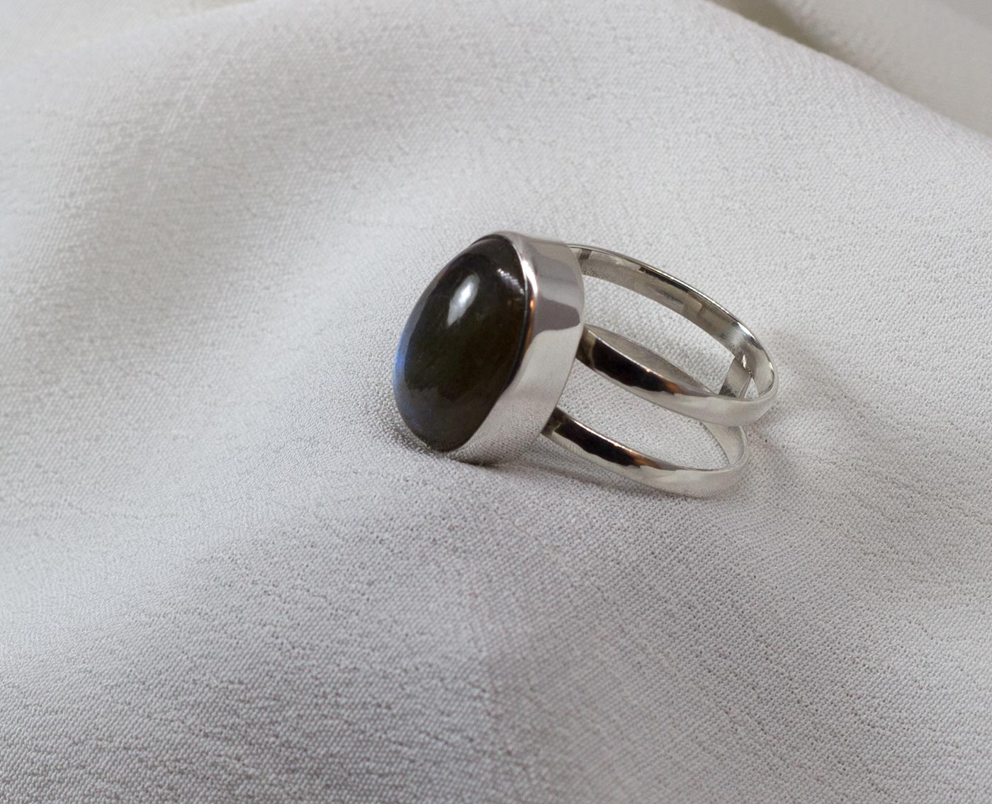 Anillo en plata de ley 925 con labradorita y doble aro paralelo. La labradorita es de forma ovalada y tiene iridiscencias azules. Talla 9