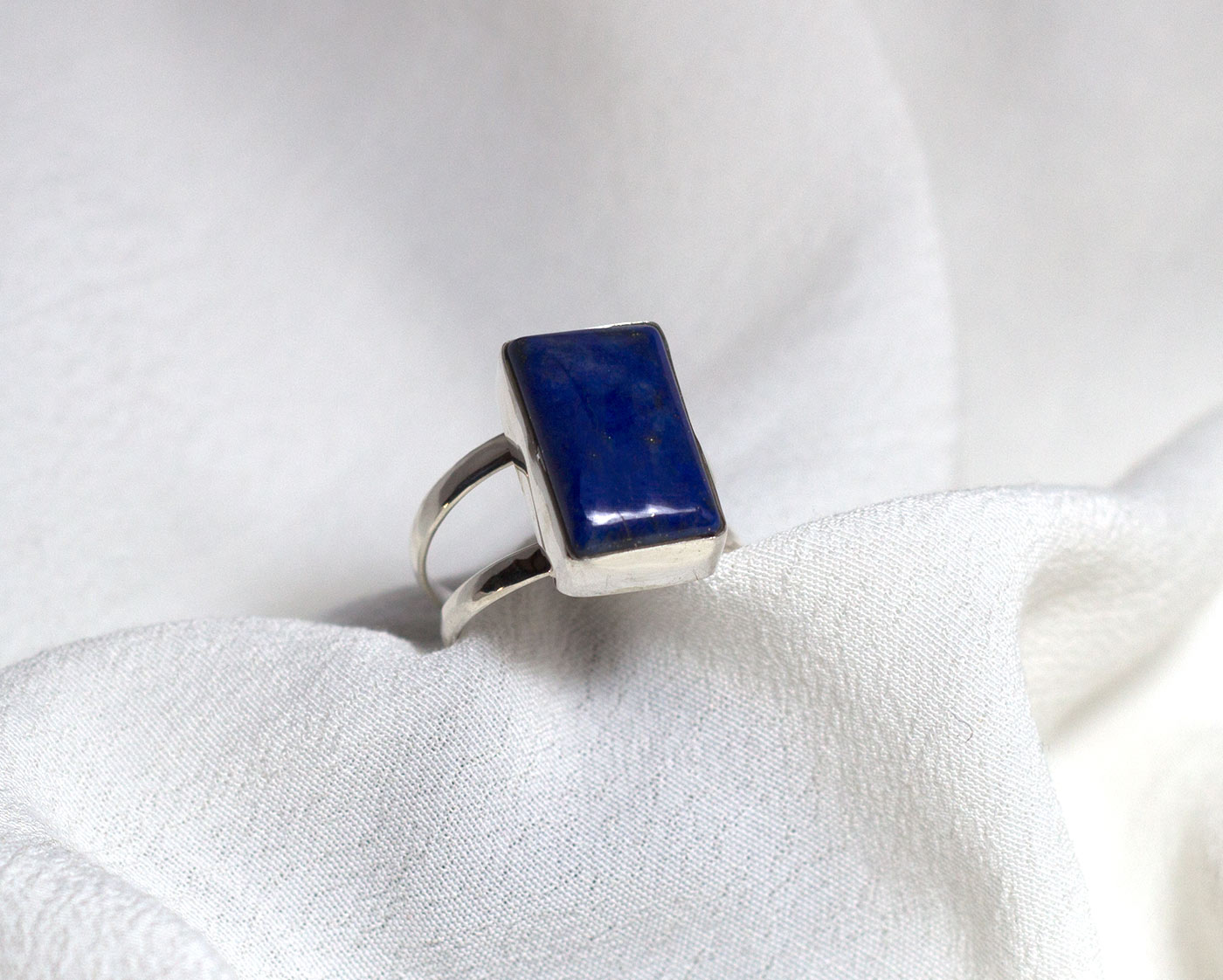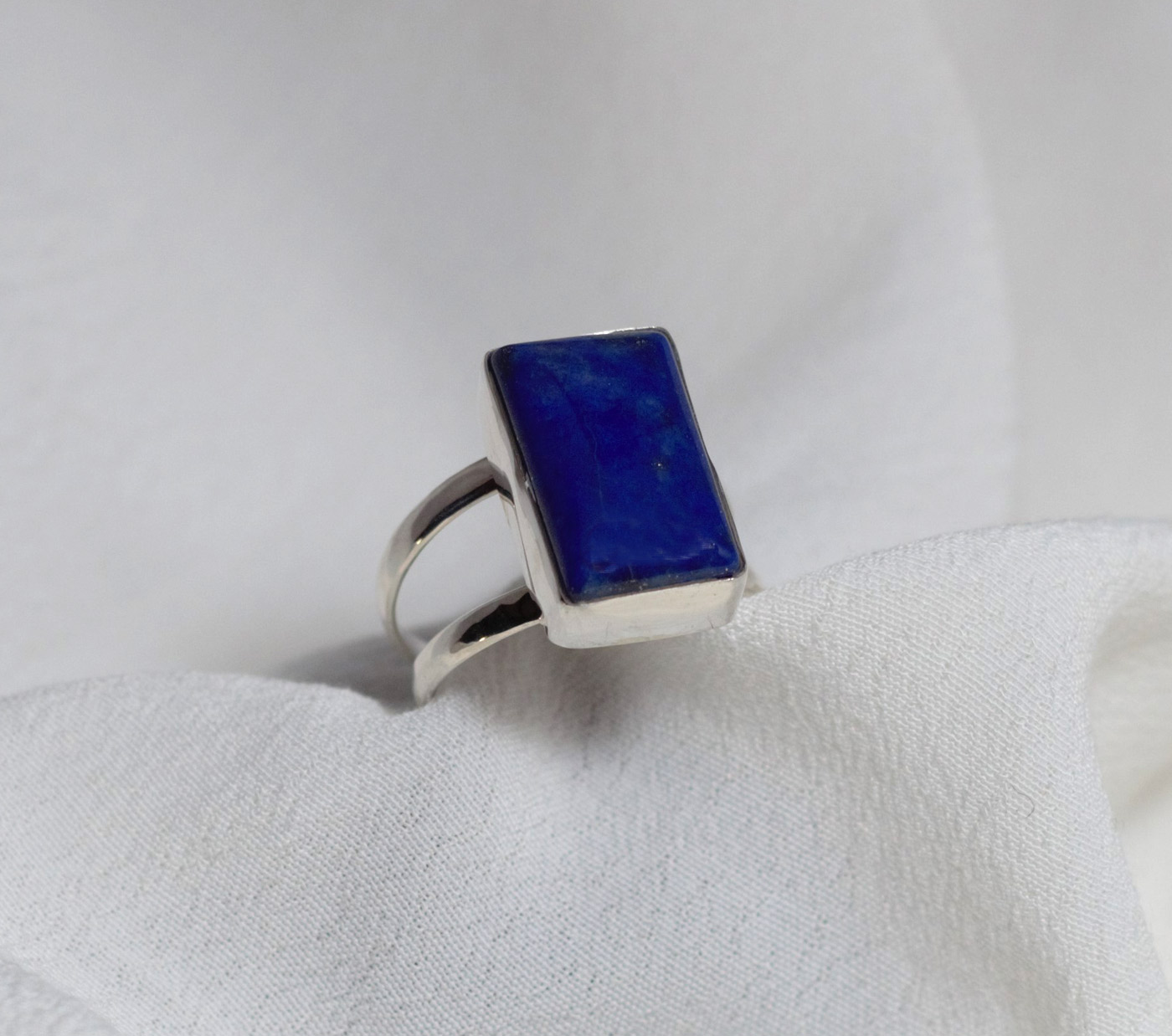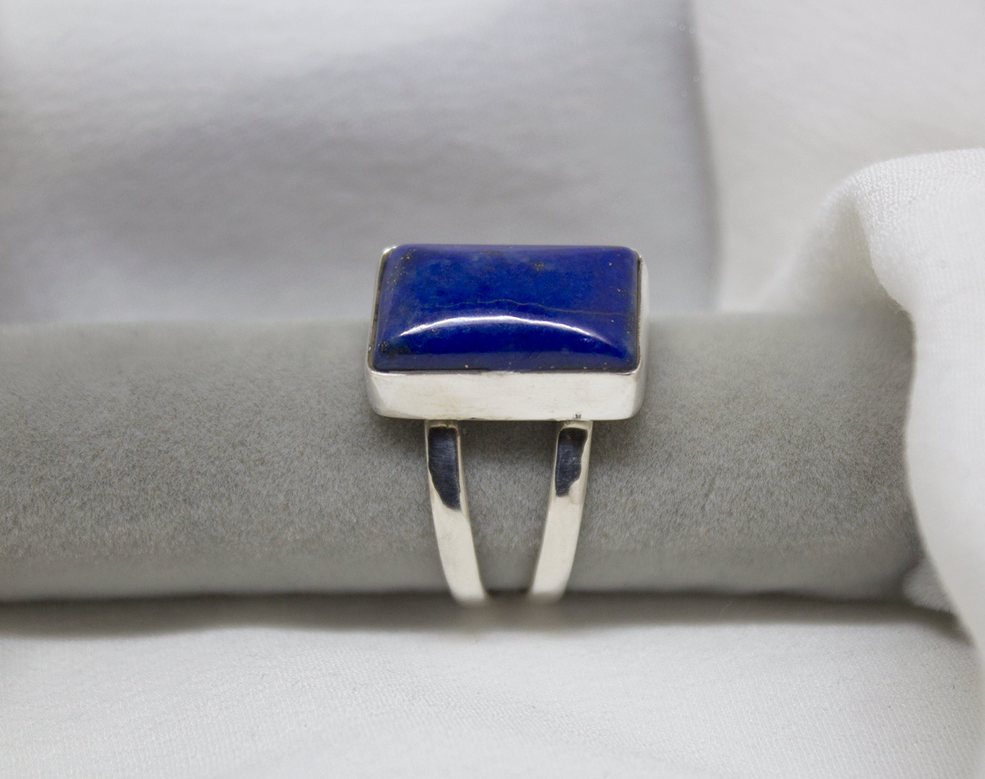 Anillo en plata de ley 925 de doble aro con lapislazuli. Anillo fabricado artesanalmente. El lapislázuli tiene un bello color azul noche y es de forma rectangular . Mide 1,7 cm por 1,1. La piedra proviene de Afganistán donde se encuentran los mejores yacimientos. Viene en talla 9.