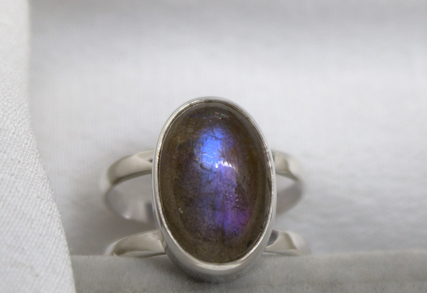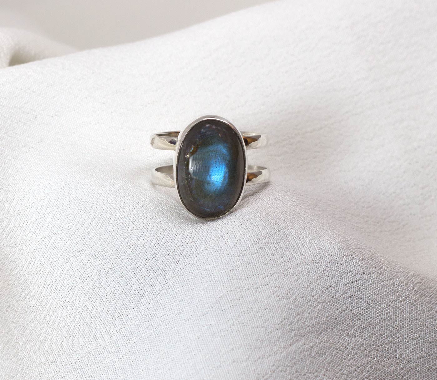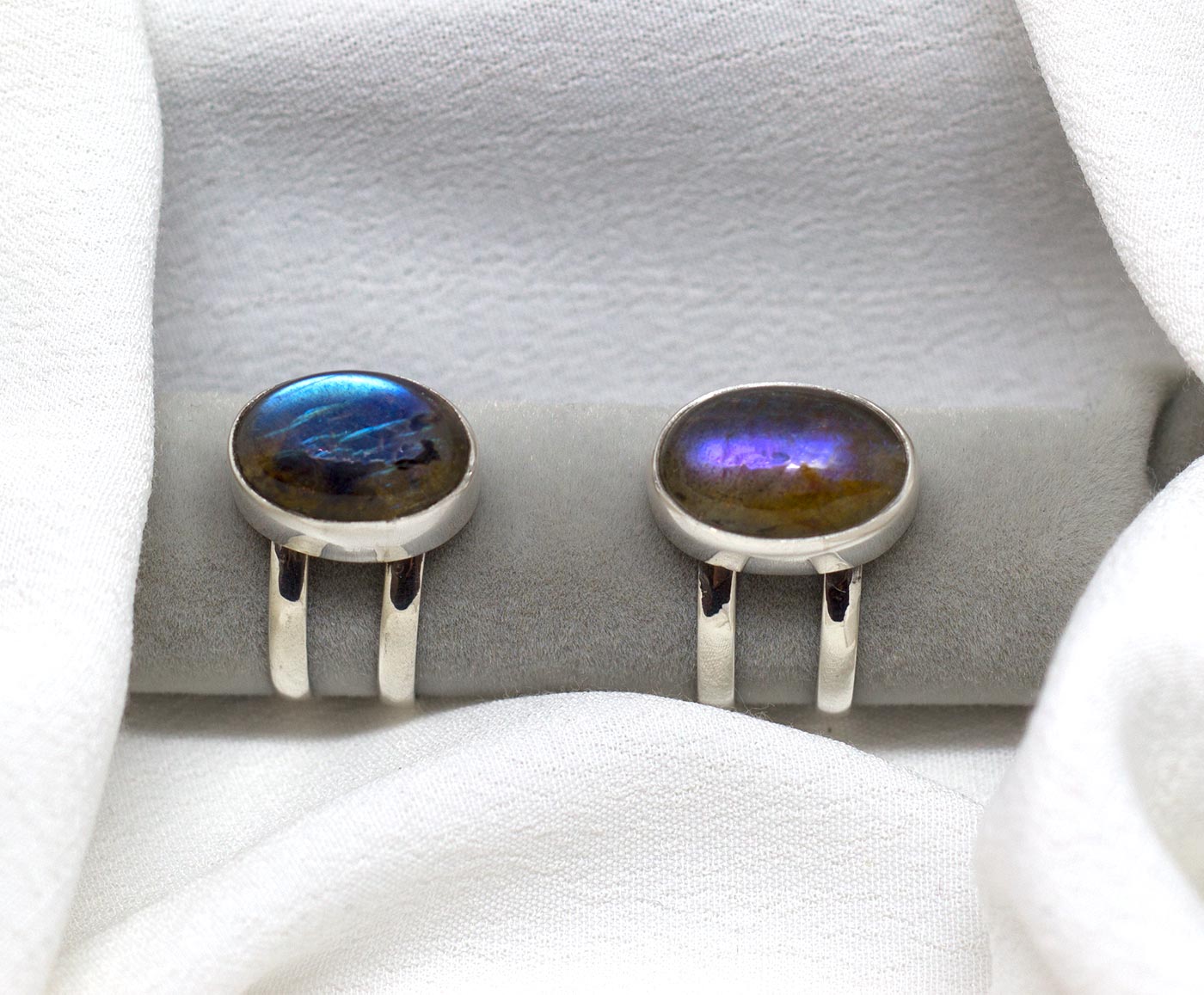 Anillo en plata de ley 925 con labradorita y con doble aro paralelo. Las labradoritas son ovaladas con unbello reflejo azul una, y otra con labradorescencias doradas y rosas. Miden 1,4 cm de ancho por 1 de largo. Están elaborados de forma artesana. Talla 8