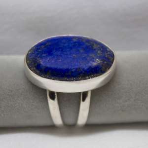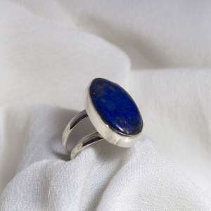 Anillo en plata de ley 925 de doble aro con lapislazuli. Hecho artesanalmente. El lapislázuli es ovalado de un intenso azul noche con motas de pirita. Proviene de Afganistán y mide 2,2 cm de largo por 1,3 de ancho. Está en talla 8.