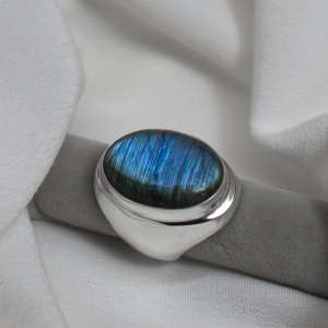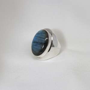 Anillo grande de plata de ley 925 con labradorita. Este modelo de anillo está fabricado dejando el interior hueco. La forma es abombada y adaptada a la piedra. La labradorita tiene preciosas  iridiscencias azuladas y ligeramente grisáceas. La piedra mide 2,4 cm de largo por 1,9 de anchura. El tamaño total del anillo es 3 cm de longitud por 2,5 cm en su parte más ancha. Talla 8.5.