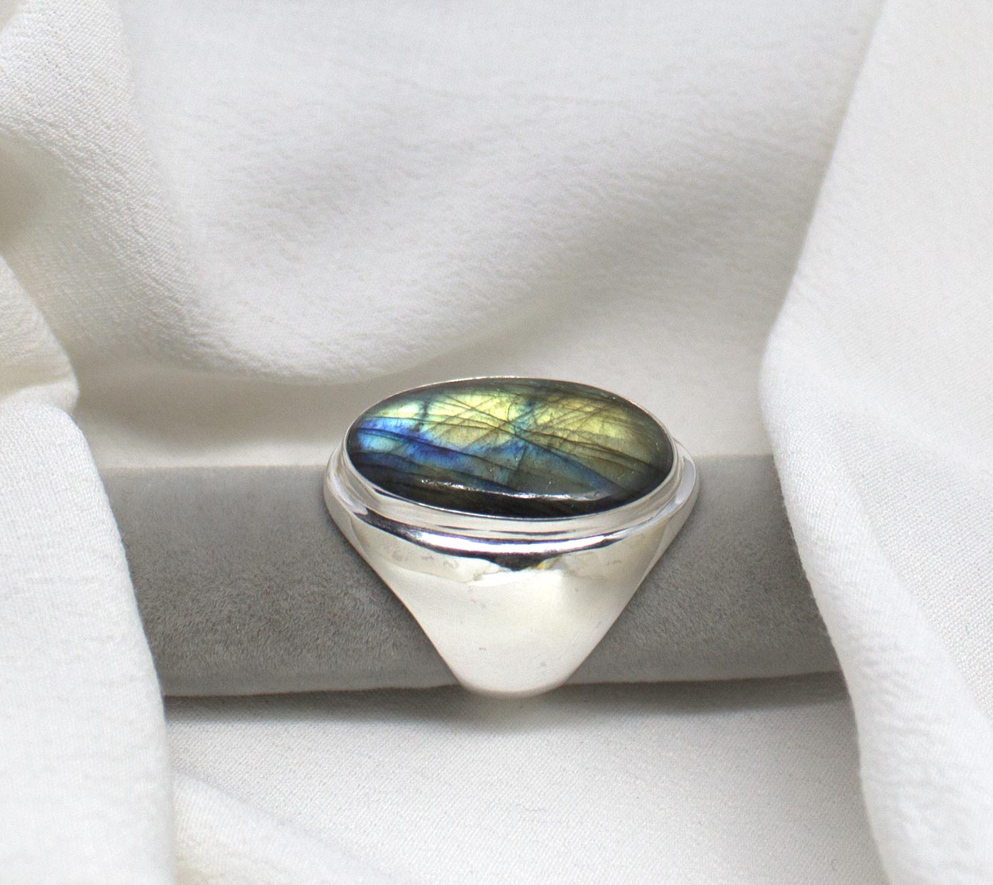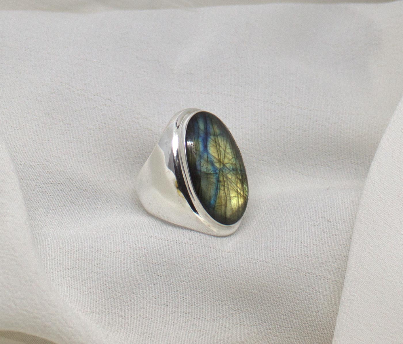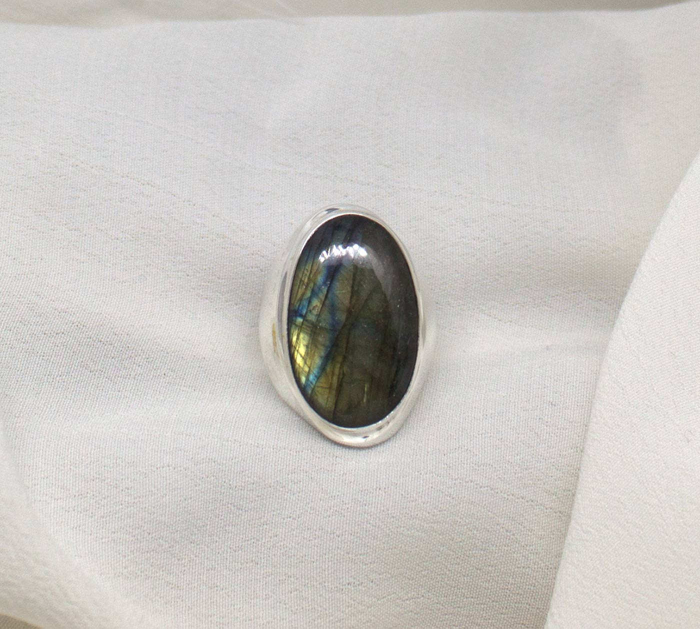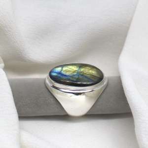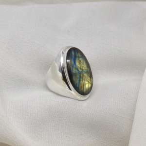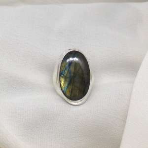 Anillo grande en plata de ley y labradorita. Este modelo de anillo está fabricado dejando el interior hueco. La forma es abombada y adaptada a la piedra. La piedra es ovalada con brillantes labradorescencias verdes y azules. Es un anillo elegante, grande, armónico, que sigue la forma del dedo realzándolo. Es cómodo de llevar ya que se adapta muy bien al dedo. La piedra mide 2,3 cm de largo por 1,7 de anchura. El tamaño total del anillo es 3,1 cm de longitud por 2,2 cm en su parte más ancha. Está fabricado en modo artesanal. Viene en talla 8.5.