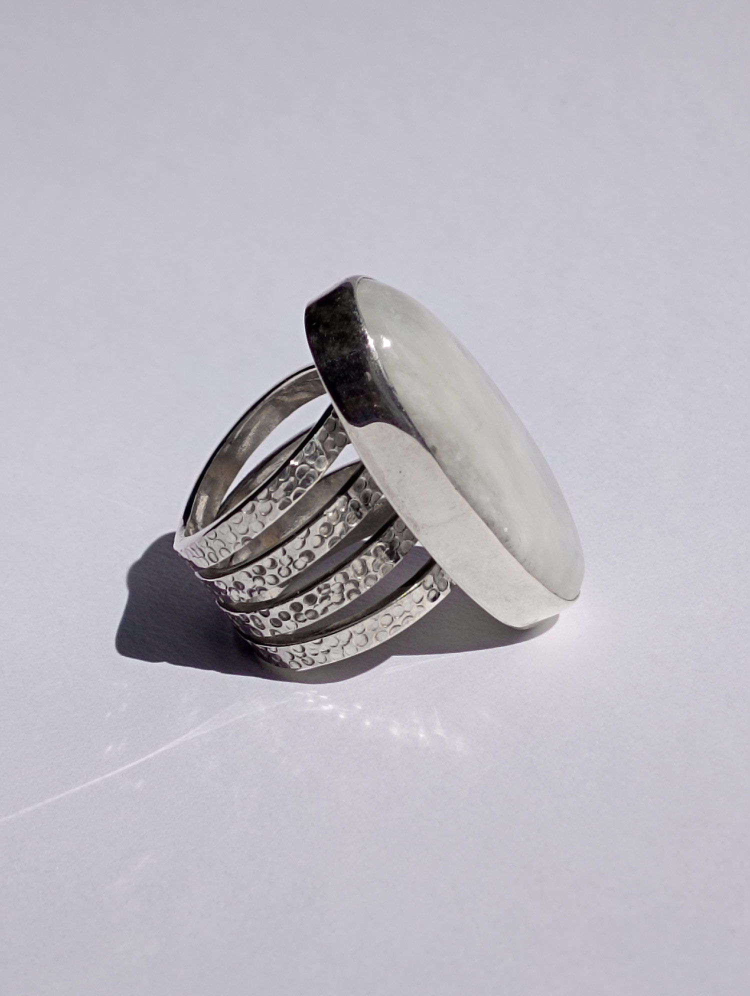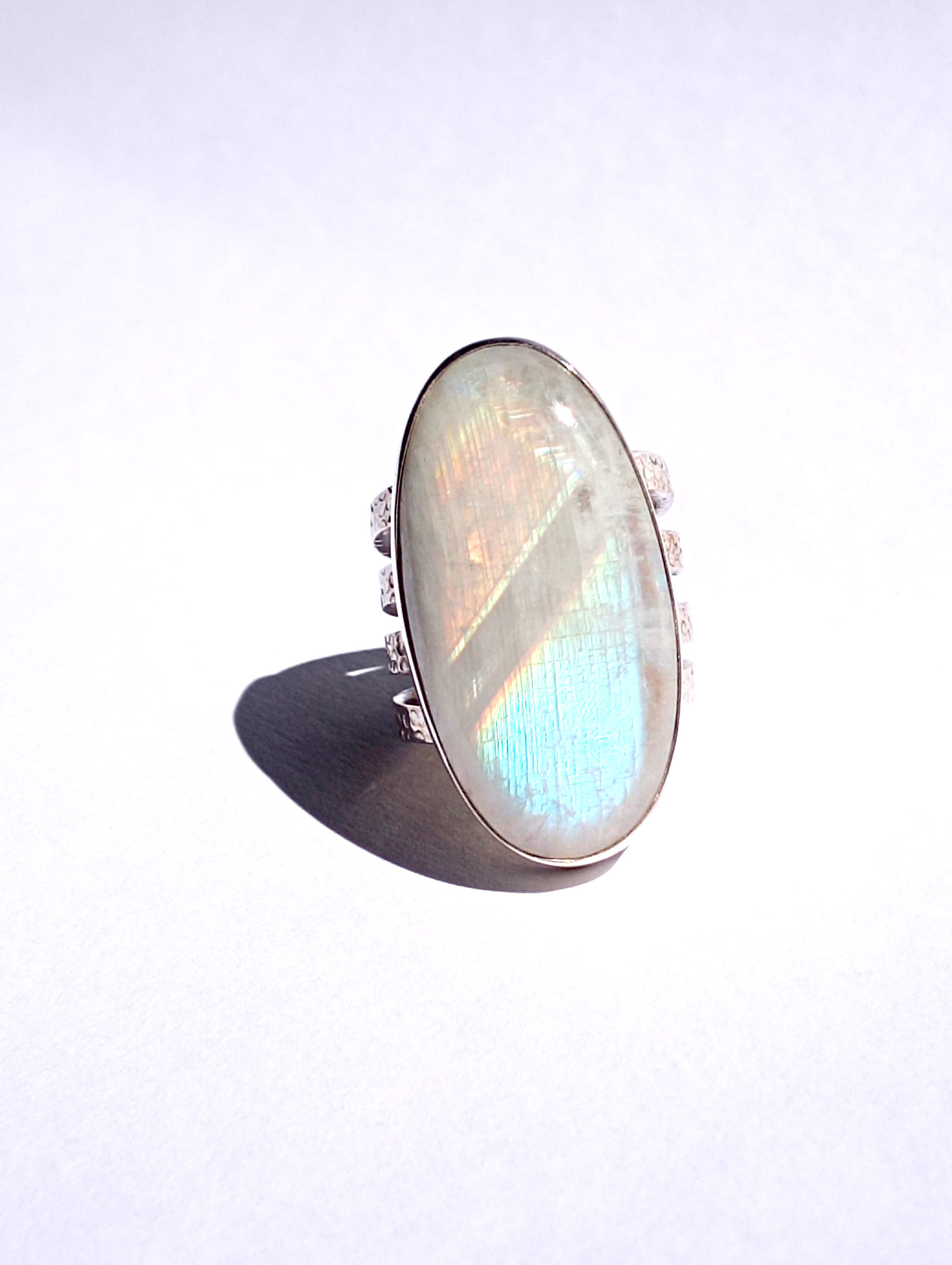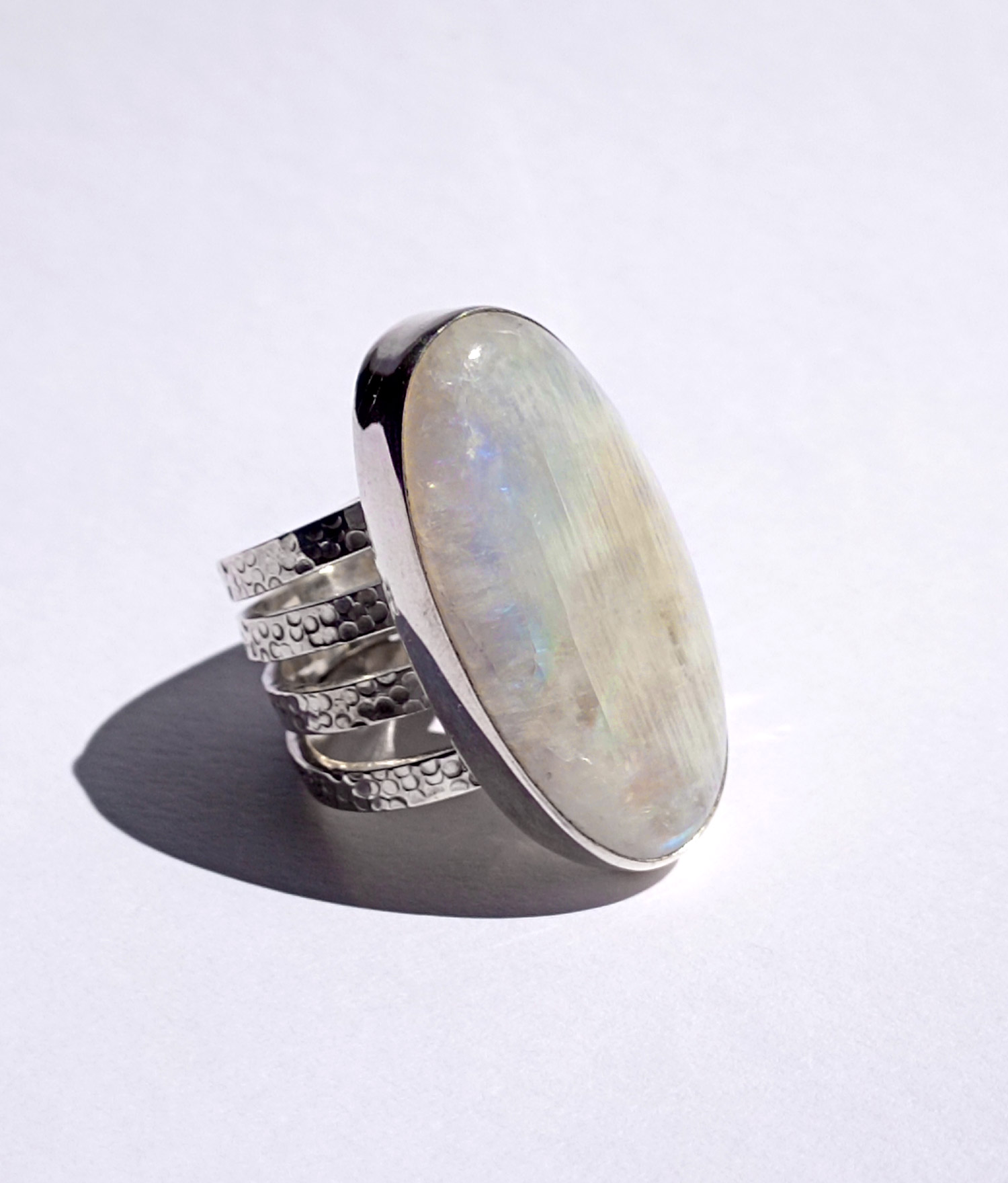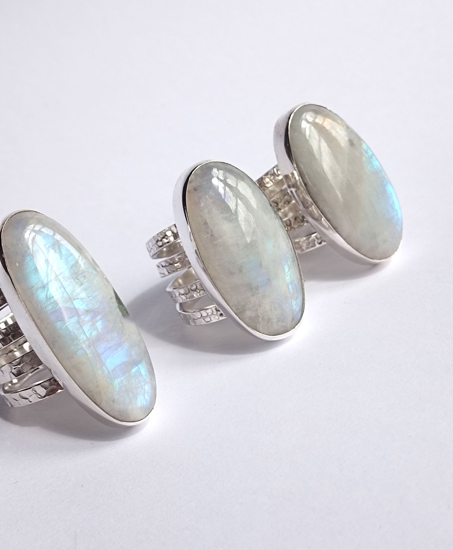 Anillos de Plata de Ley 925 con piedra de luna ovalada. Van engarzados con cuatro aros de textura martelada y de 2,62 mm cada uno. Las piedras de luna tienen un reflejo arco iris muy acentuado. Miden 3,4 cm por 1,8 (talla 8), 3,5×1,8 (talla 9) y 4×1,5 (talla 9,5). Al tener 4 aros aconsejamos media talla más. Están fabricados artesanalmente.