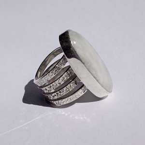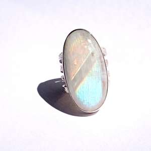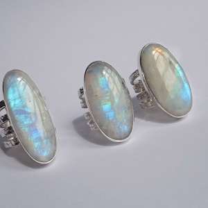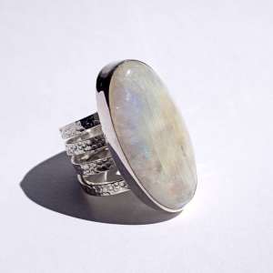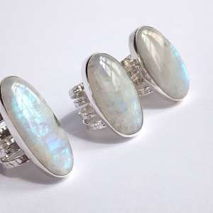 Anillos de Plata de Ley 925 con piedra de luna ovalada. Van engarzados con cuatro aros de textura martelada y de 2,62 mm cada uno. Las piedras de luna tienen un reflejo arco iris muy acentuado. Miden 3,4 cm por 1,8 (talla 8), 3,5×1,8 (talla 9) y 4×1,5 (talla 9,5). Al tener 4 aros aconsejamos media talla más. Están fabricados artesanalmente.