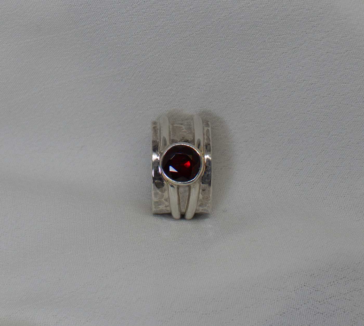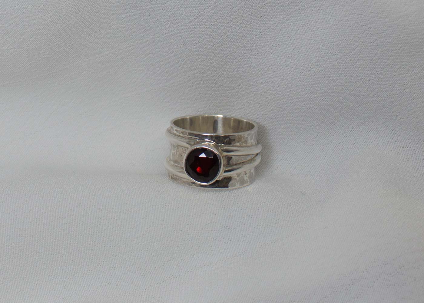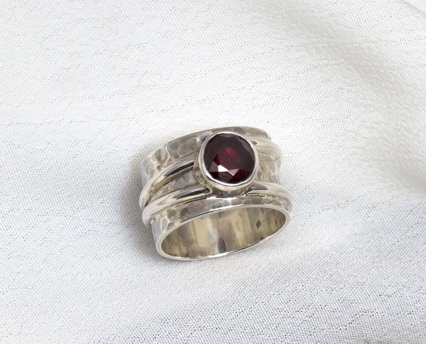 Anillo ancho de plata de ley 925 con hessonita. El aro es ancho de 13 mm. Viene texturado con un martelado grueso y el aro va rodeado por dos finos hilos lisos de plata. La hessonita es de forma redonda y está facetada. Es de un bonito color rojo oscuro. Tiene un diámetro de 0,7 cm. Está hecho de modo artesanal. Al ser un aro bastante ancho sugerimos elegir 1/2 talla más de la usada normalmente. Talla 8.