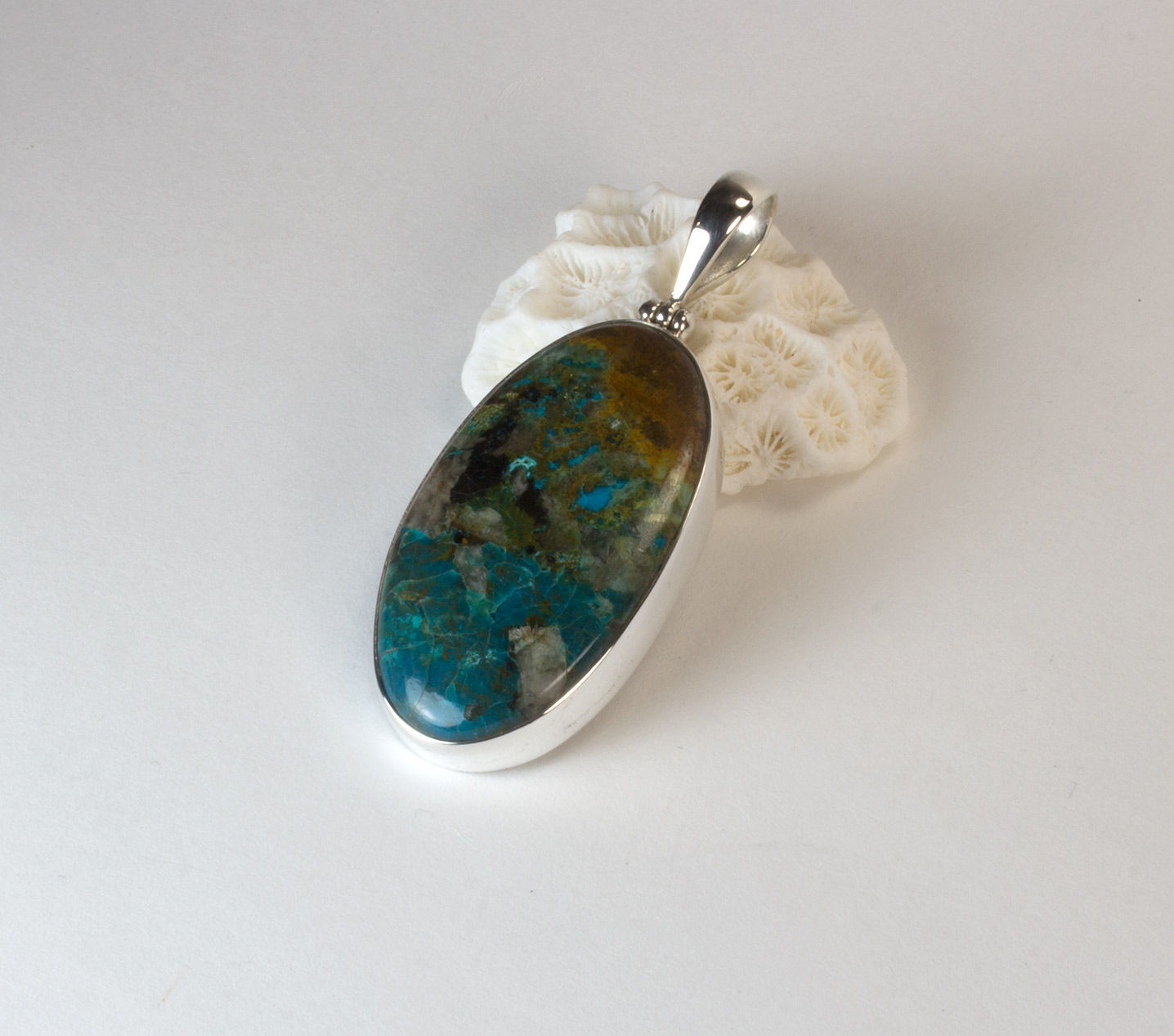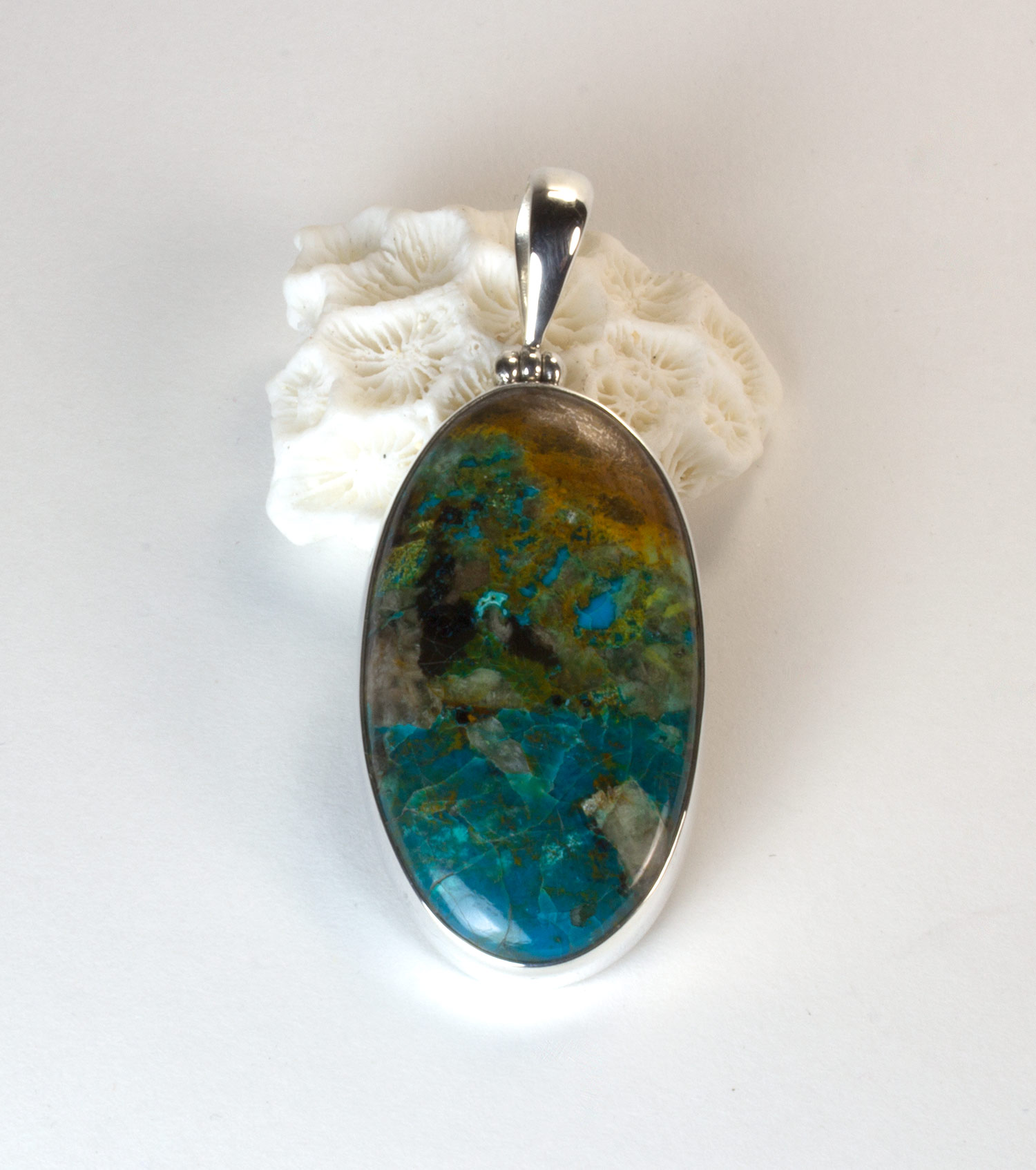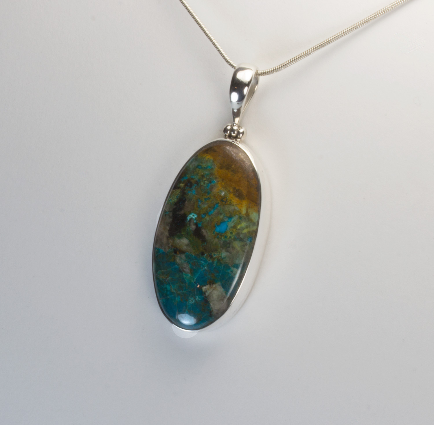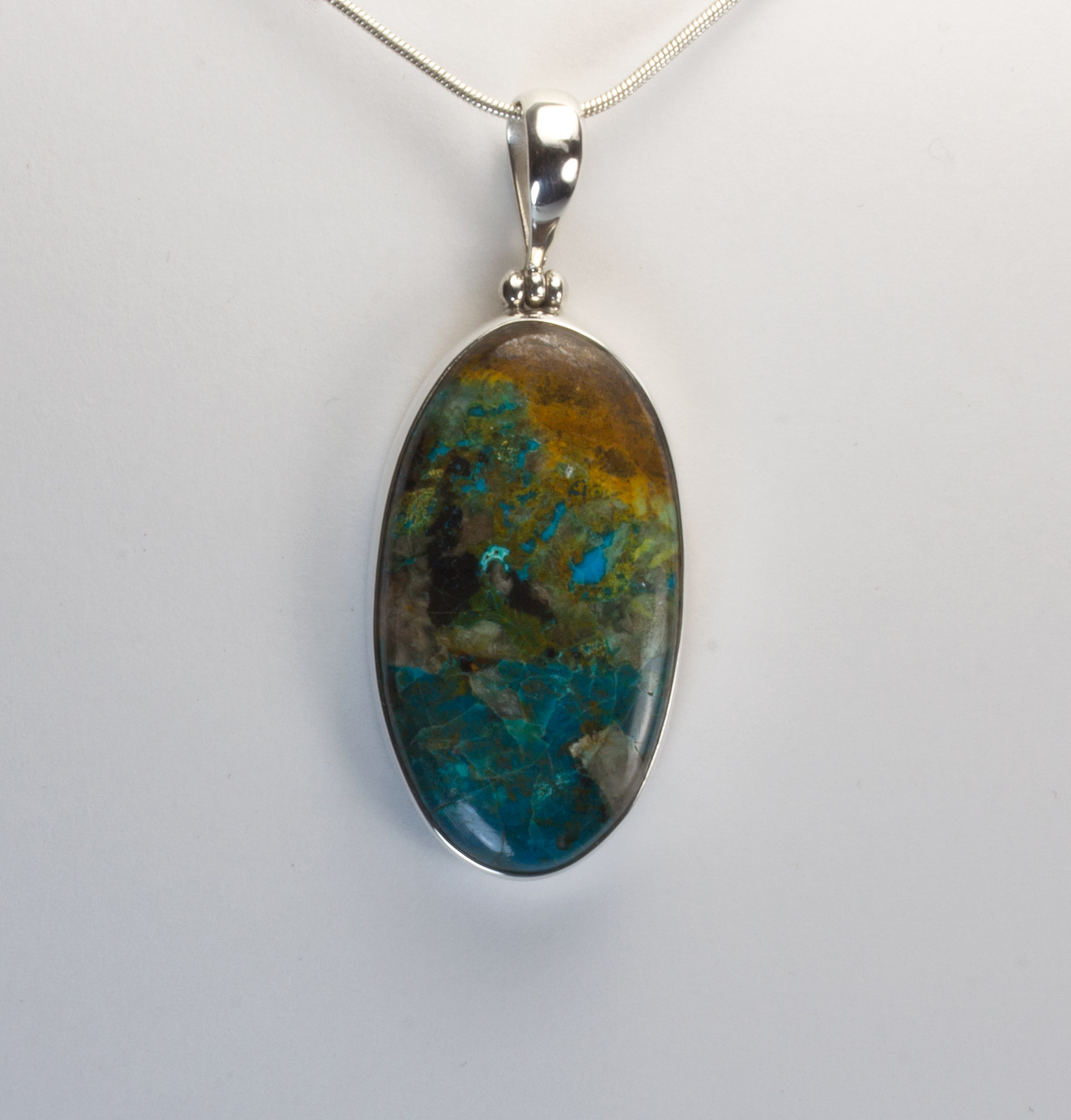 Colgante con crisocola y plata de Ley 925. La crisocola es grande y de forma ovalada. Los colores forman un tapiz con sienas y verdes entremezclados en la parte superior, terminando con verdes esmeralda en la inferior. Su tamaño es de 3,8 por 2,1 cm. El largo total con la anilla tiene 5,4 cm. Está elaborado en forma artesanal.