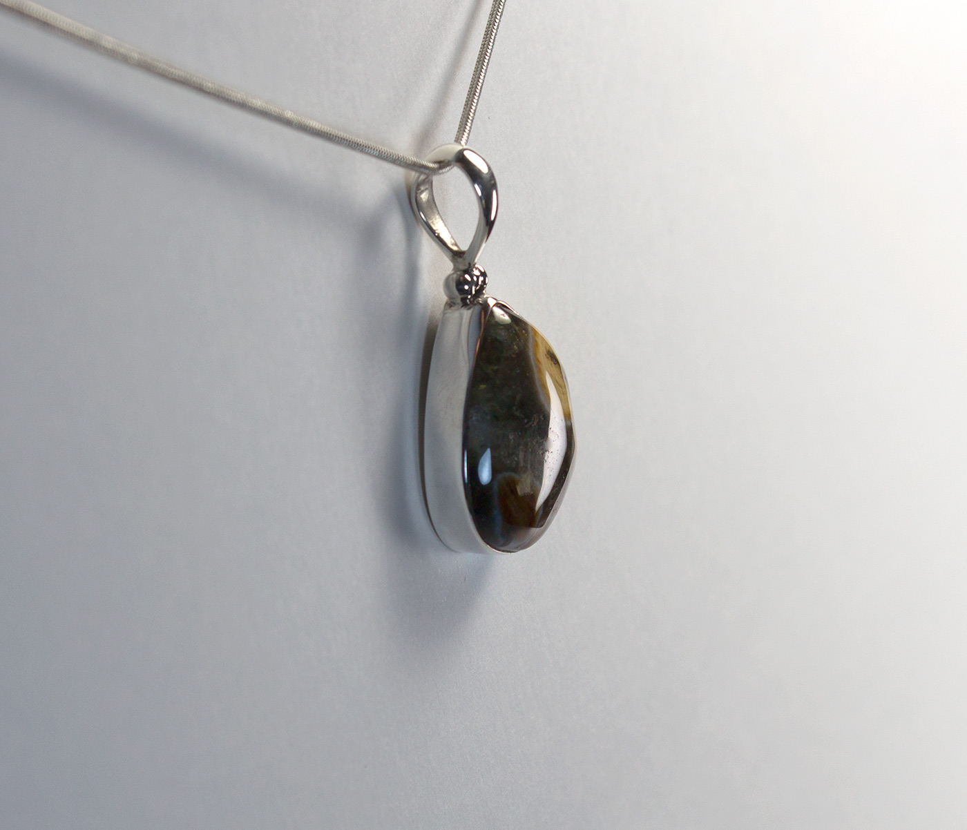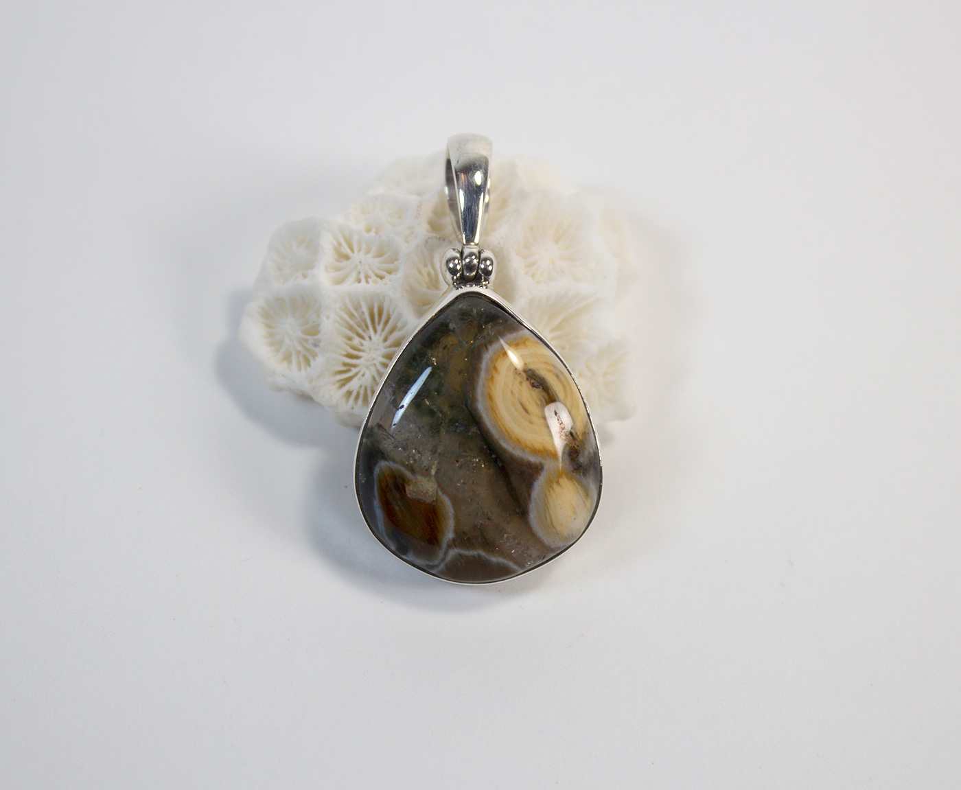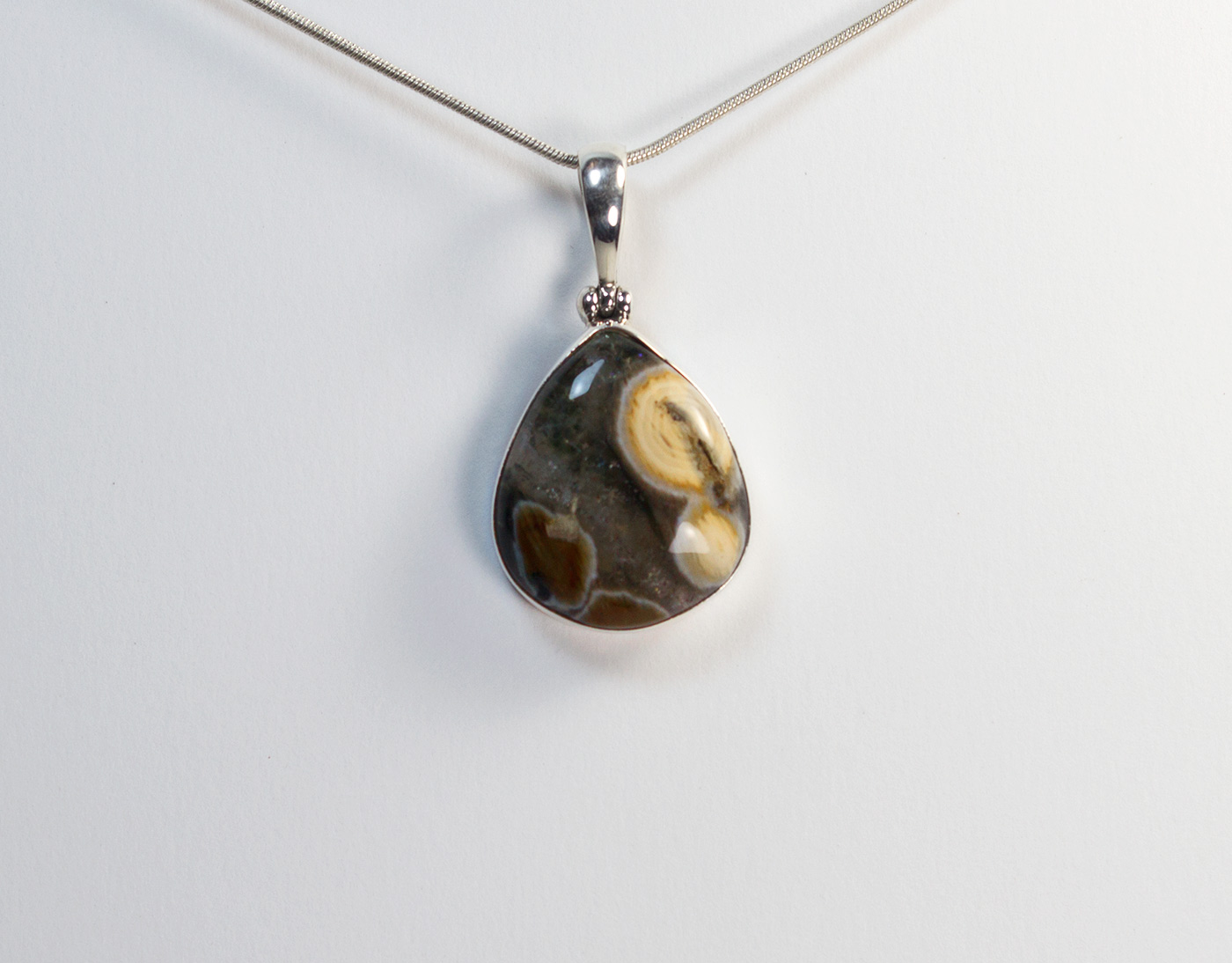 Colgante con jaspe oceano en plata de ley 925. Este colgante lleva engarzado un jaspe océano en forma de lágrima. Tiene una franja cristalina que separa una zona inferior con dos islas de color marrón rojiza y otras islas de color blanco.Su tamaño es de 2.5 por 2 cm. y el largo total del colgante es de 3,9 cm. Está elaborado en modo artesanal.