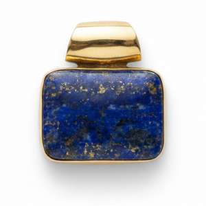 Colgante con lapislázuli y oro. El colgante está engarzado con plata de ley 925 y lleva un chapado en oro de 18 quilates. El lapislázuli tiene forma rectangular con un precioso azul noche con puntos de pirita que acreditan su proveniencia afgana. Mide 1 por 1.5 cm. El largo total con la anilla es de 2 cm.