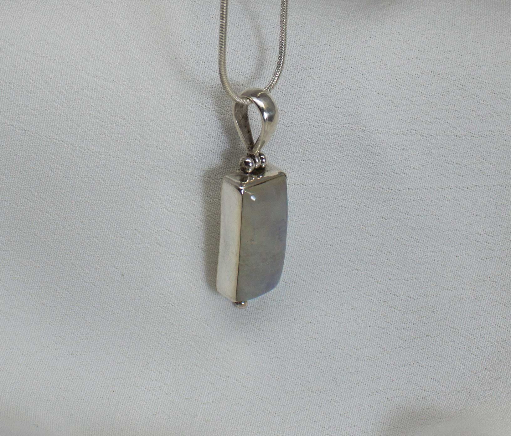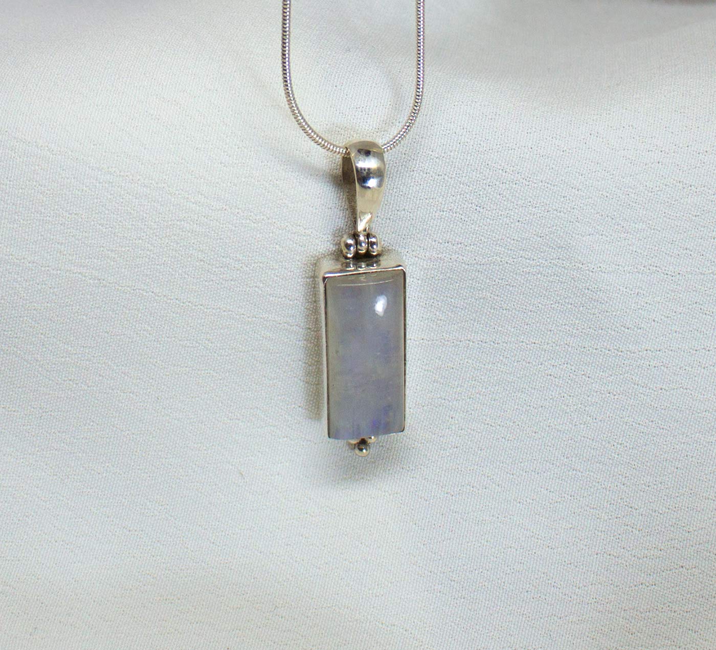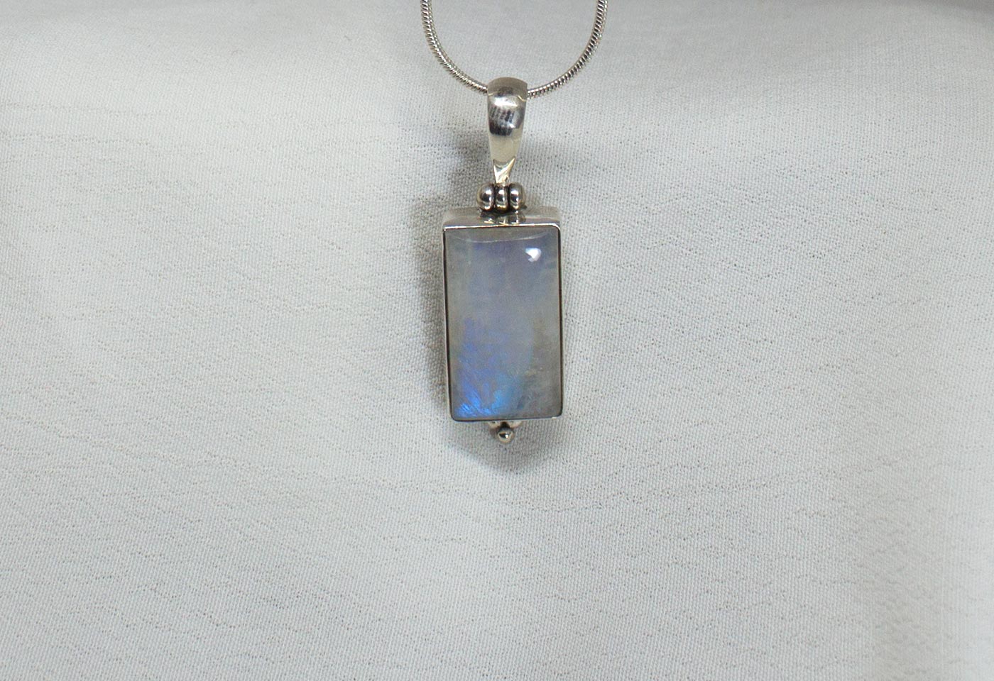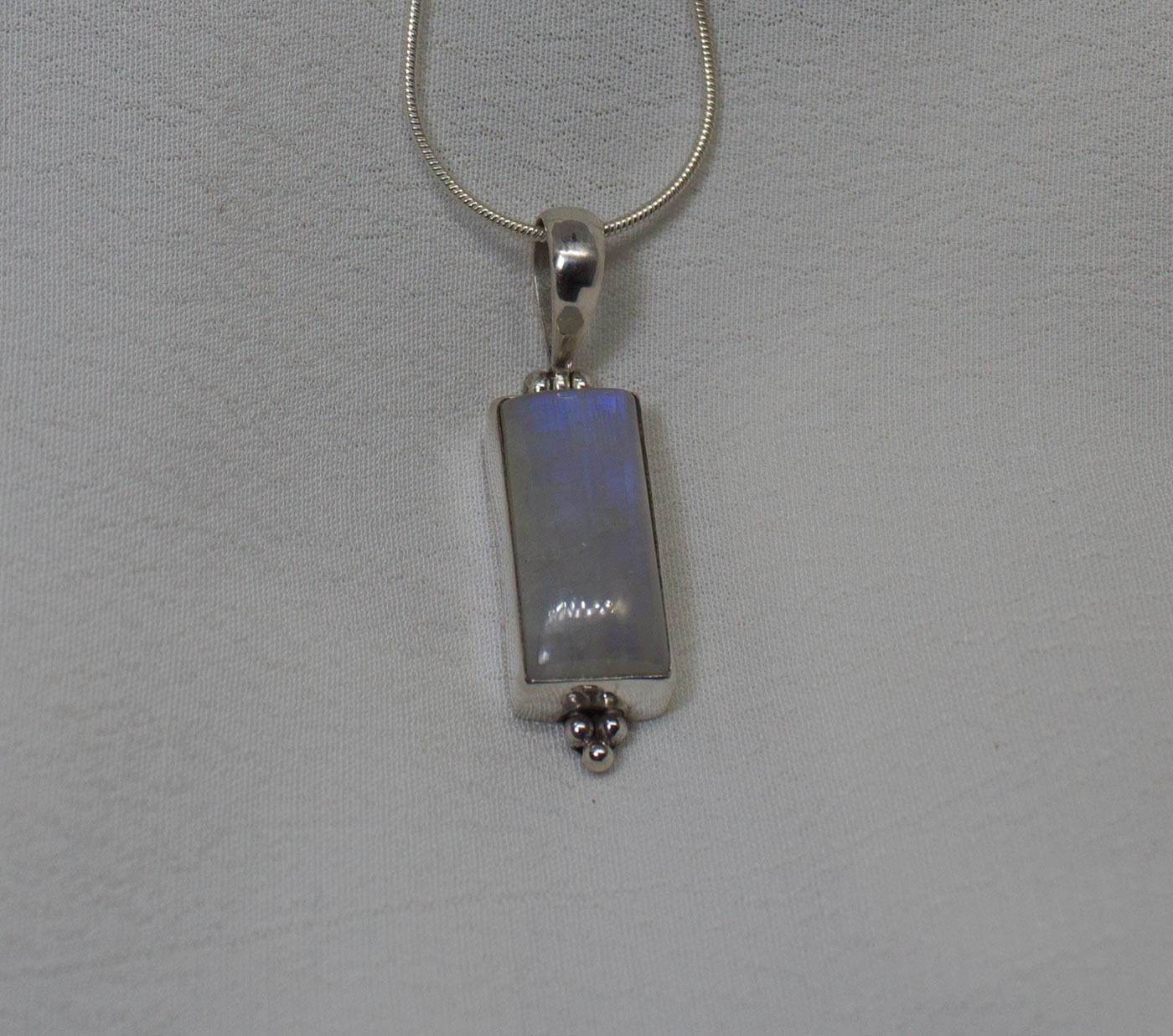 Colgante con piedra de luna y plata de ley 925. La piedra de luna es del tipo arco iris. Es semitransparente y tiene un precioso reflejo azul en toda la superficie. Su forma es rectangular y mide 2,2 cm de largo por 0,9 cm de ancho. Lleva una acabado de bolitas adornando la parte inferior. El largo del colgante es de 4 cm.